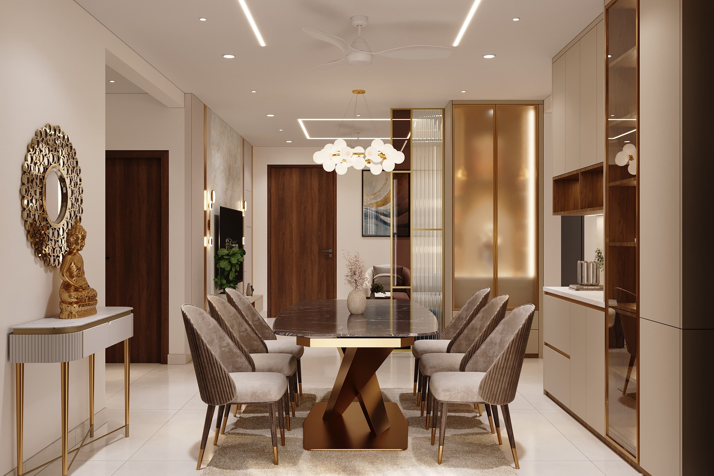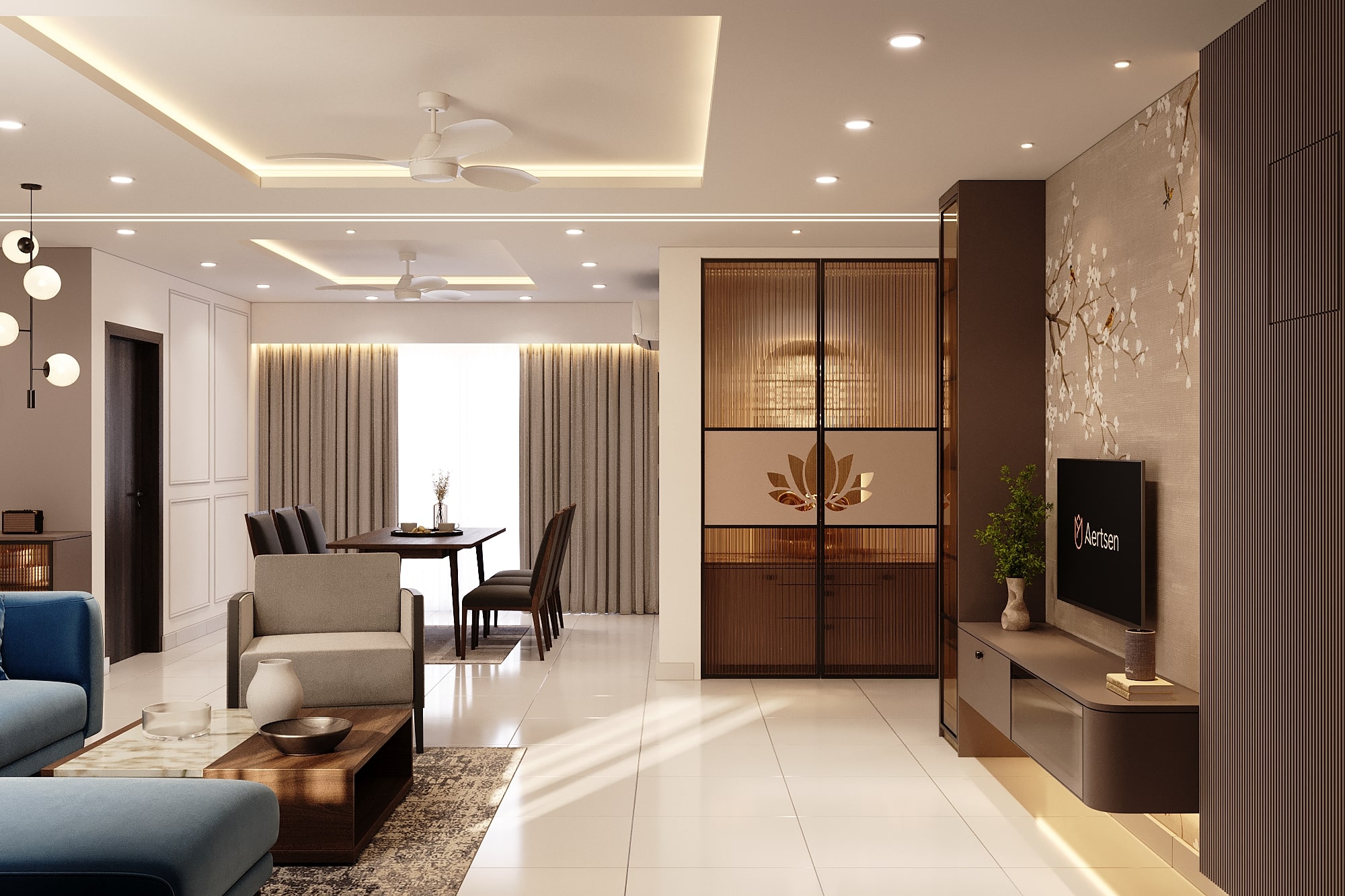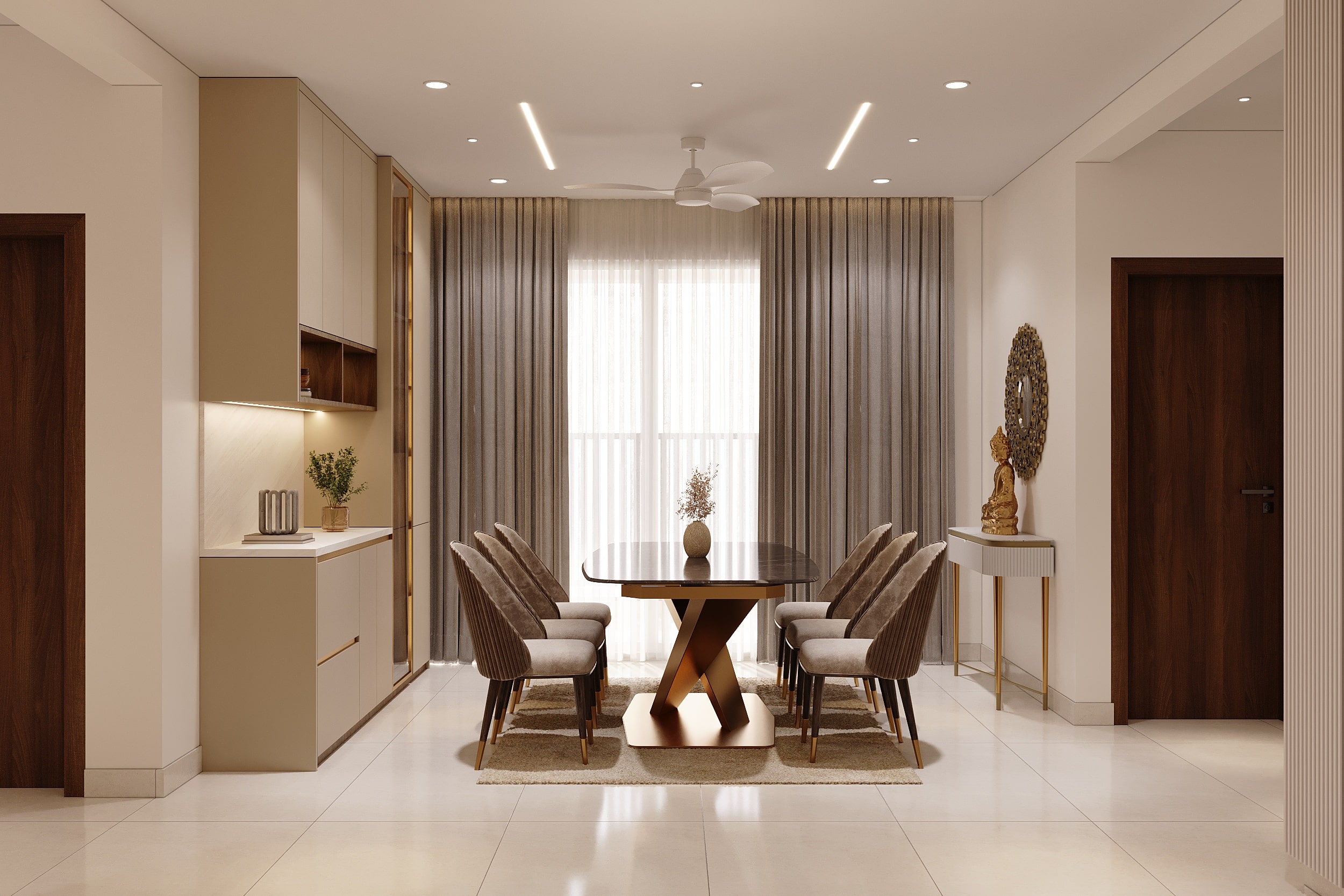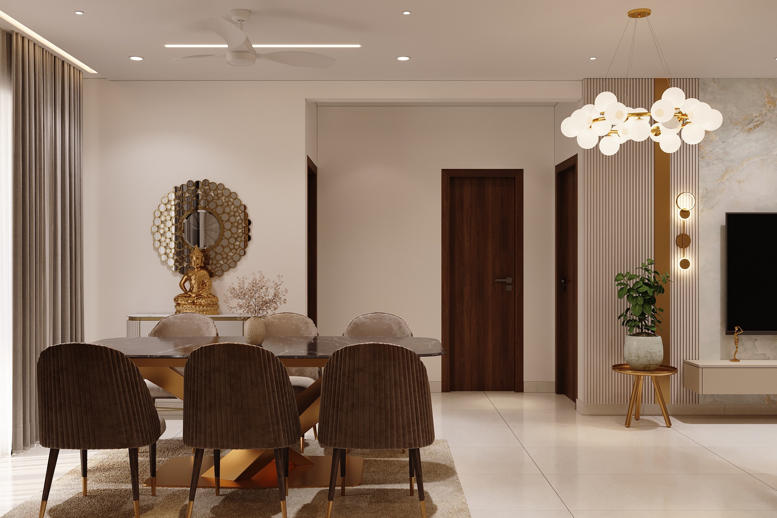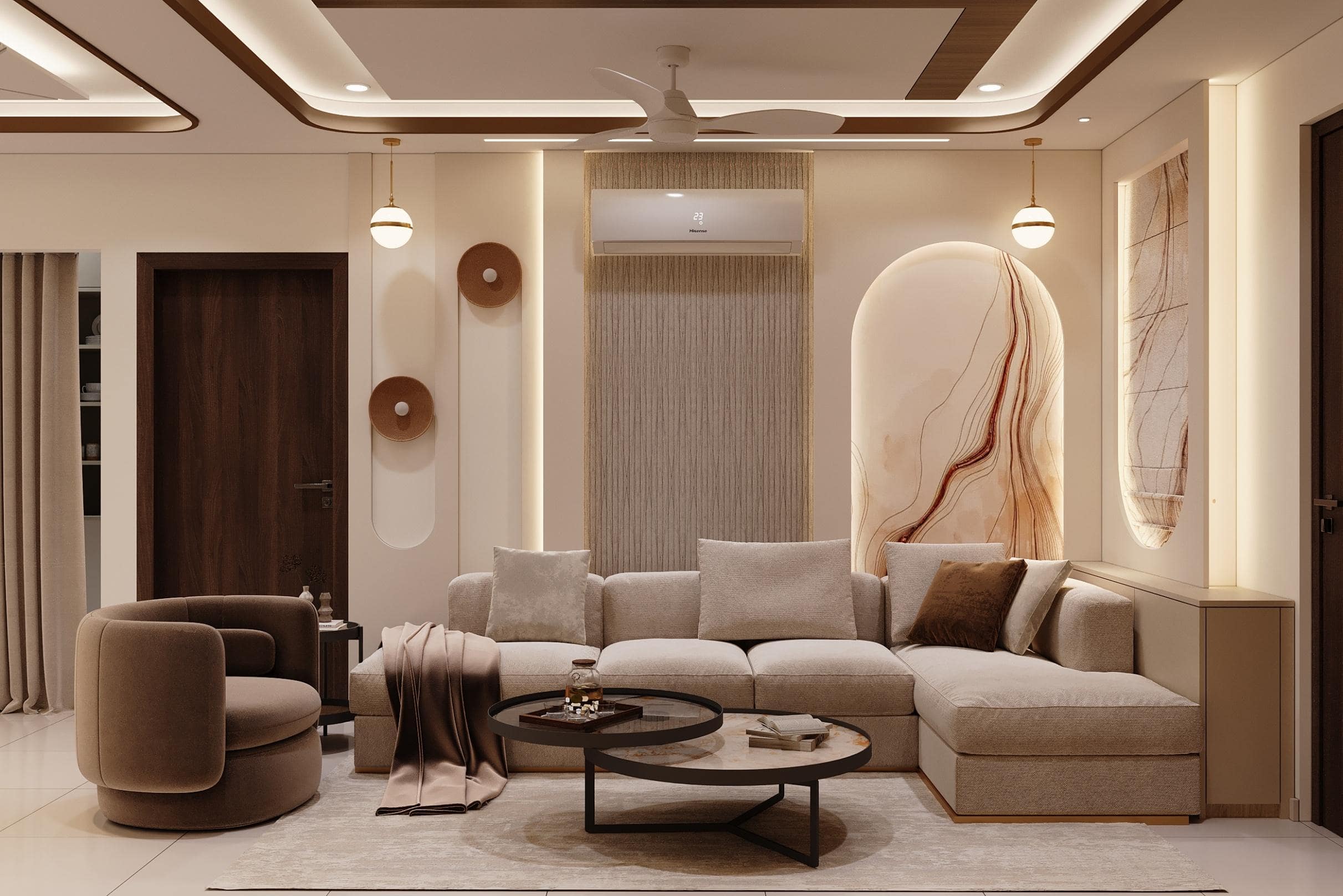 This 3BHK residence at Jayabheri The Nirvana, crafted for Mr. Rahul, is imagined as a dialogue between presence and pause. The design moves with a quiet confidence — spaces that don’t demand attention yet linger in memory through their precision. Light is treated as a material in itself, shifting across stone, metal, and fabric to create atmospheres that evolve with time of day. Boundaries dissolve into thresholds, and rooms become moments within a larger composition. It is a home that does not declare luxury, but lets it emerge — through stillness, tactility, and the poetics of restraint.