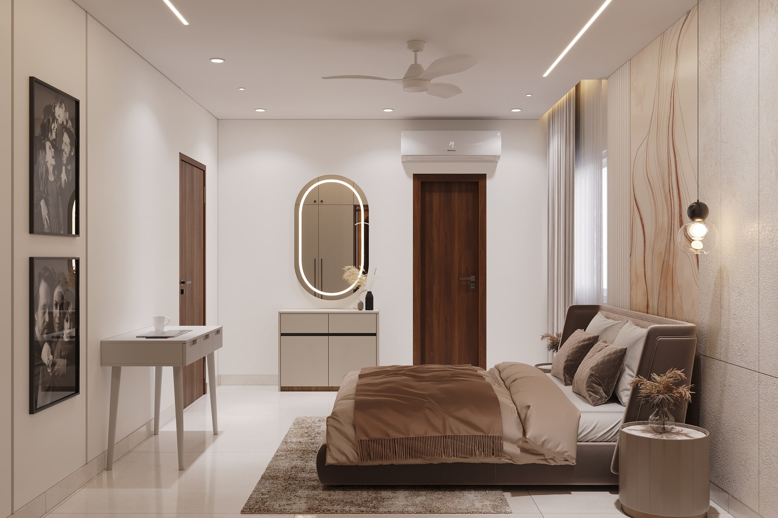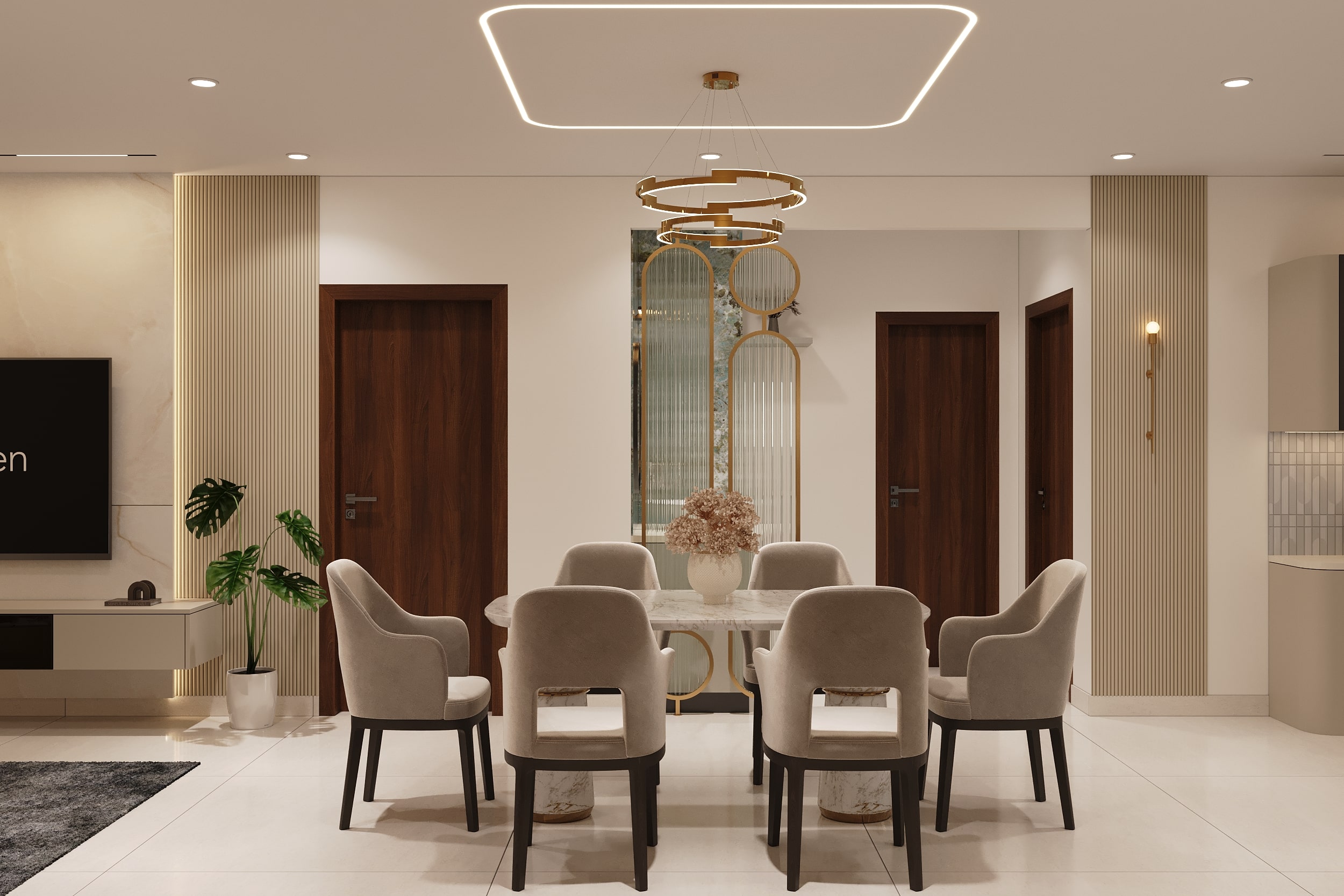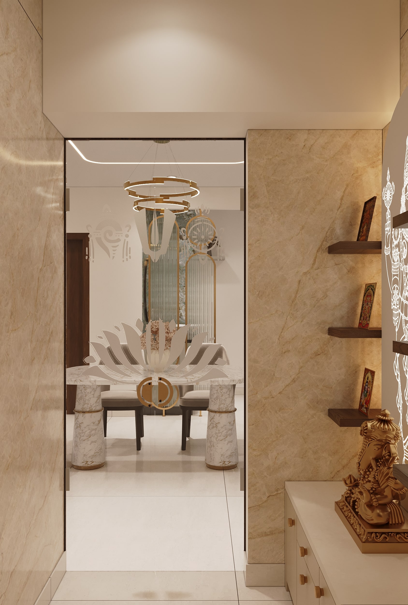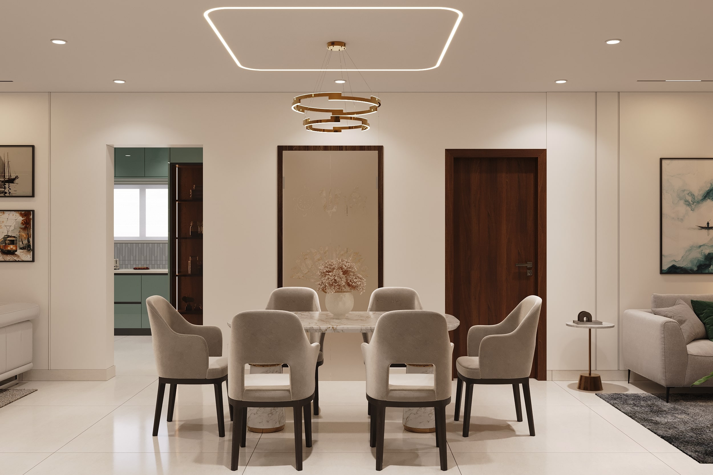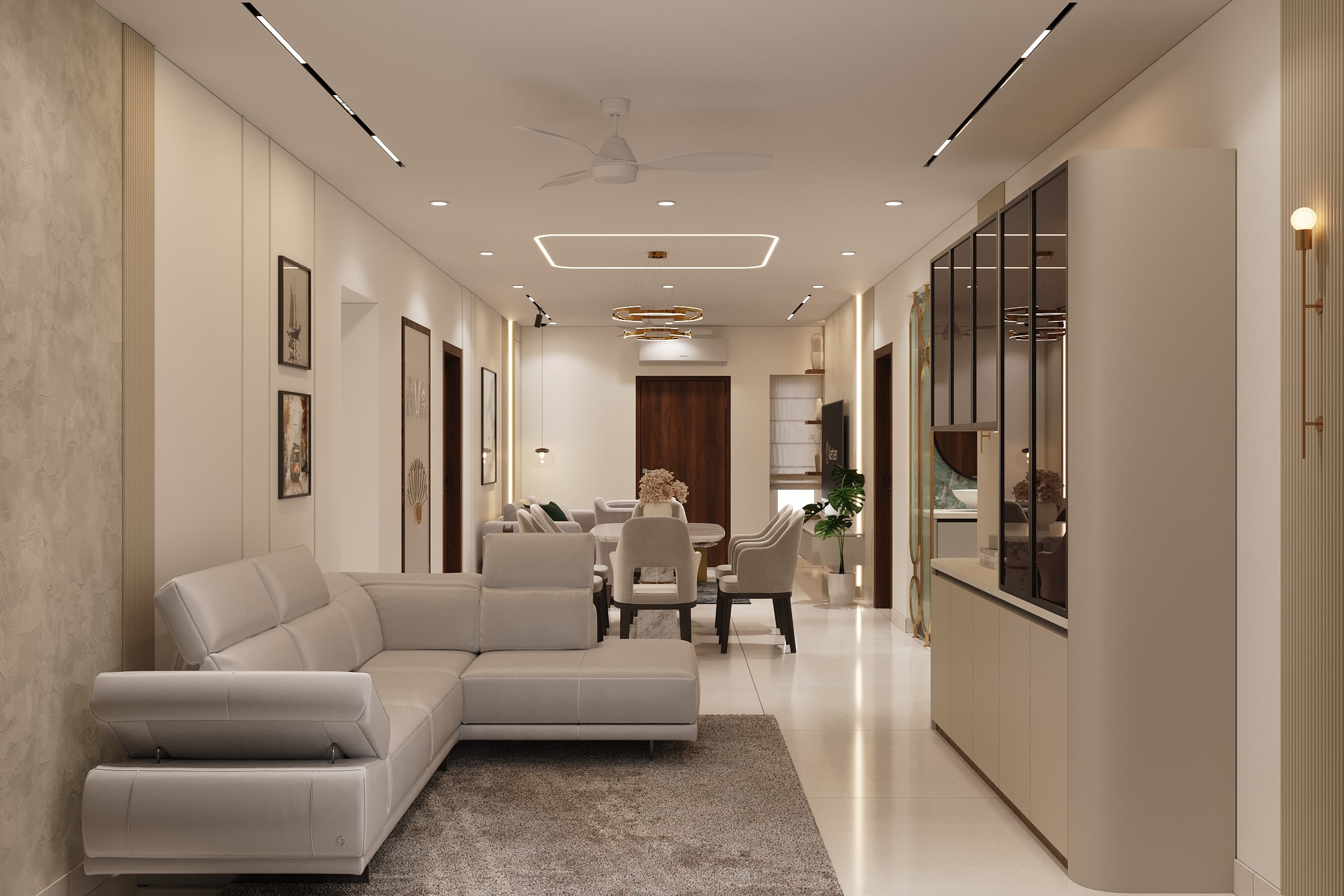Mr. Dev Baburaj’s residence at SMR Vinay Iconia embodies contemporary luxury with warm tones, sculptural elements, and seamless spatial flow. The living, dining, and lounge areas exude calm refinement through curated textures, refined lighting, and modern minimalism, while the kitchen adds bold sophistication with its harmonious palette and crafted detailing. The bedroom continues this serene narrative with layered neutrals and understated opulence, creating a tranquil retreat that reflects a lifestyle of comfort, clarity, and elevated elegance.
