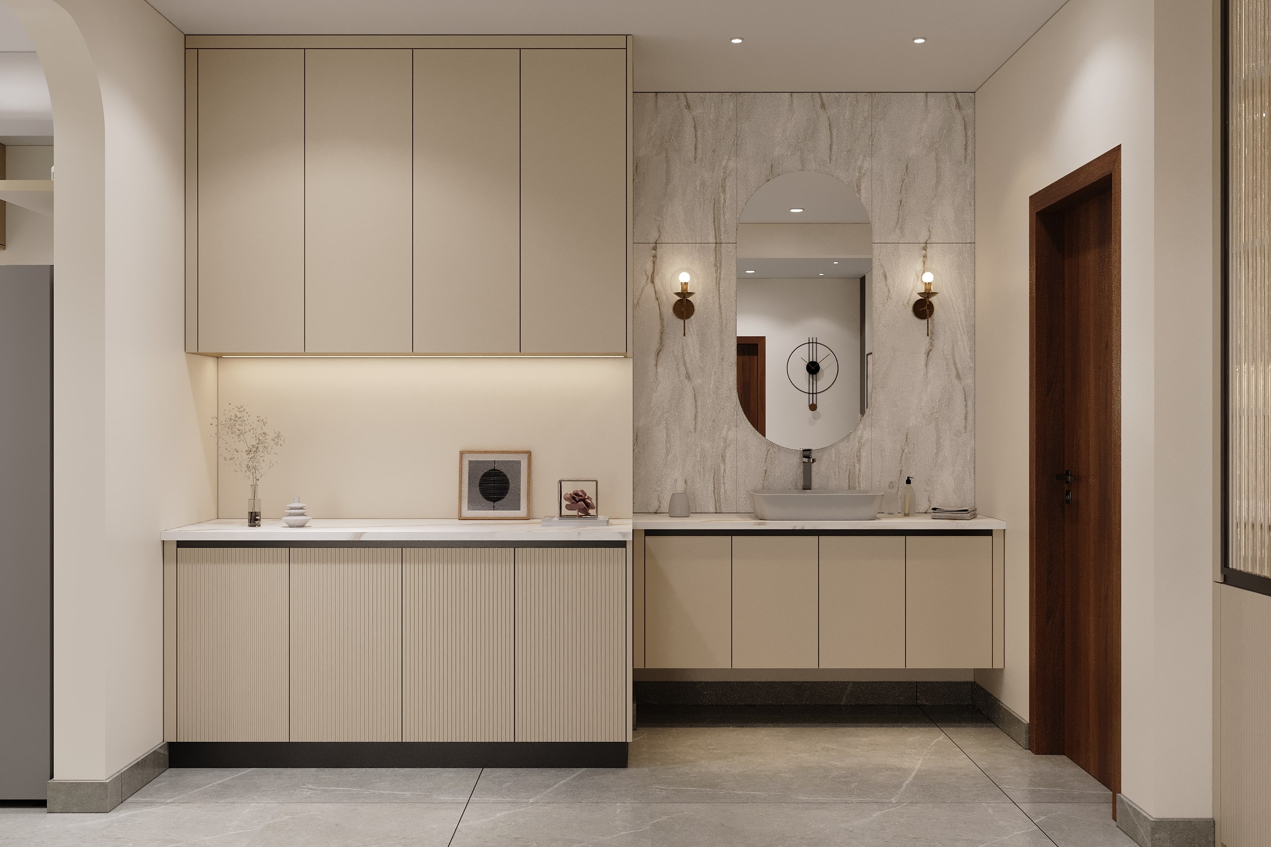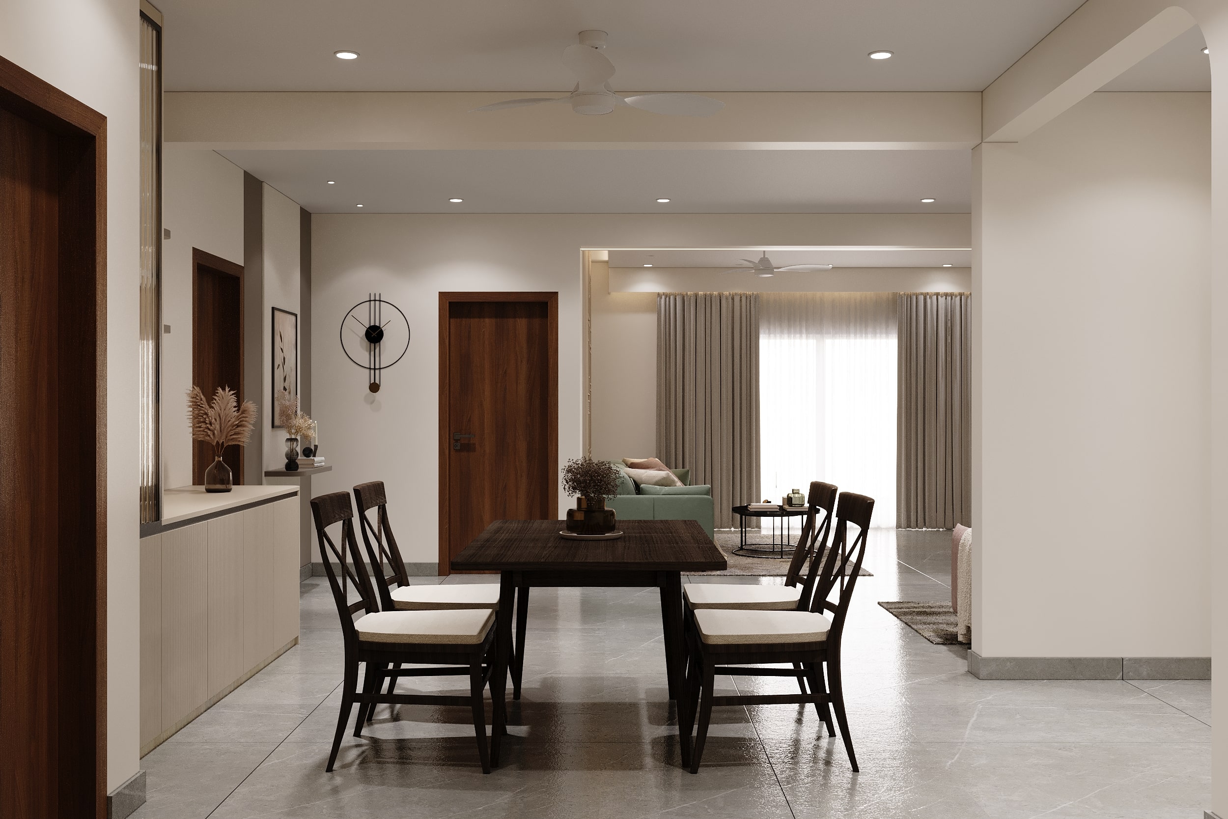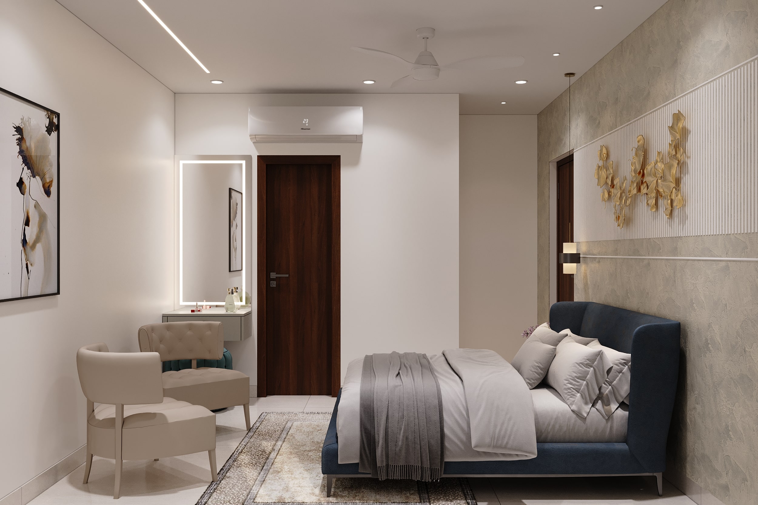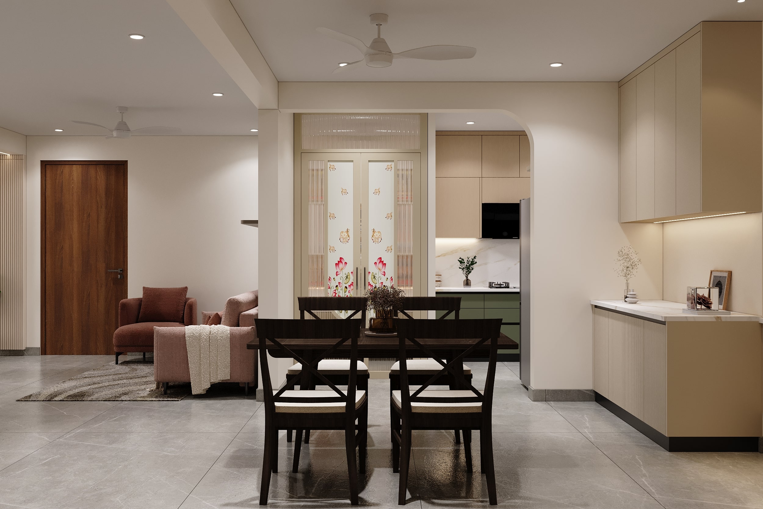 Mr. Dev Baburaj’s residence at SMR Vinay Iconia embodies contemporary luxury with warm tones, sculptural elements, and seamless spatial flow. The living, dining, and lounge areas exude calm refinement through curated textures, refined lighting, and modern minimalism, while the kitchen adds bold sophistication with its harmonious palette and crafted detailing. The bedroom continues this serene narrative with layered neutrals and understated opulence, creating a tranquil retreat that reflects a lifestyle of comfort, clarity, and elevated elegance.