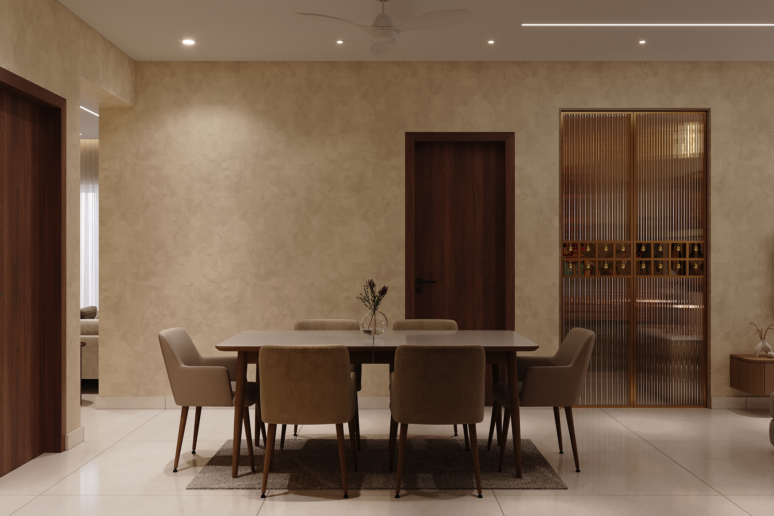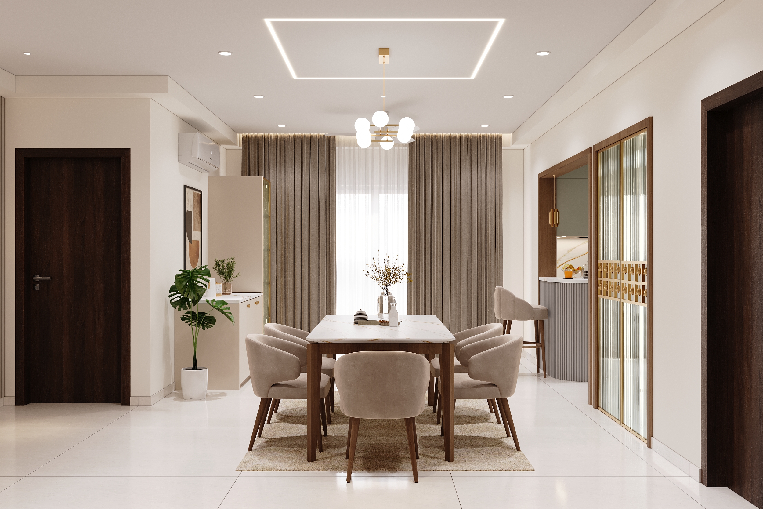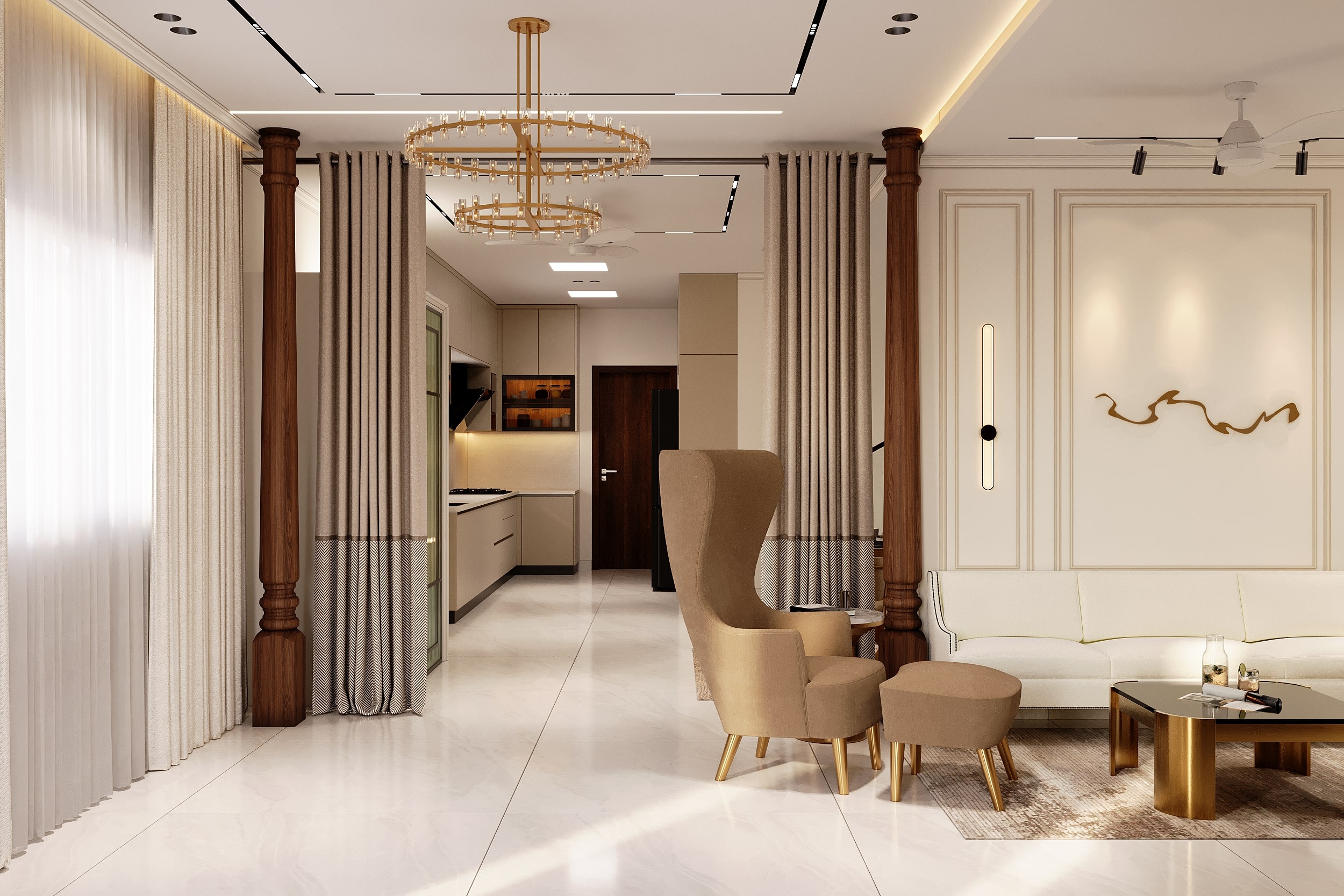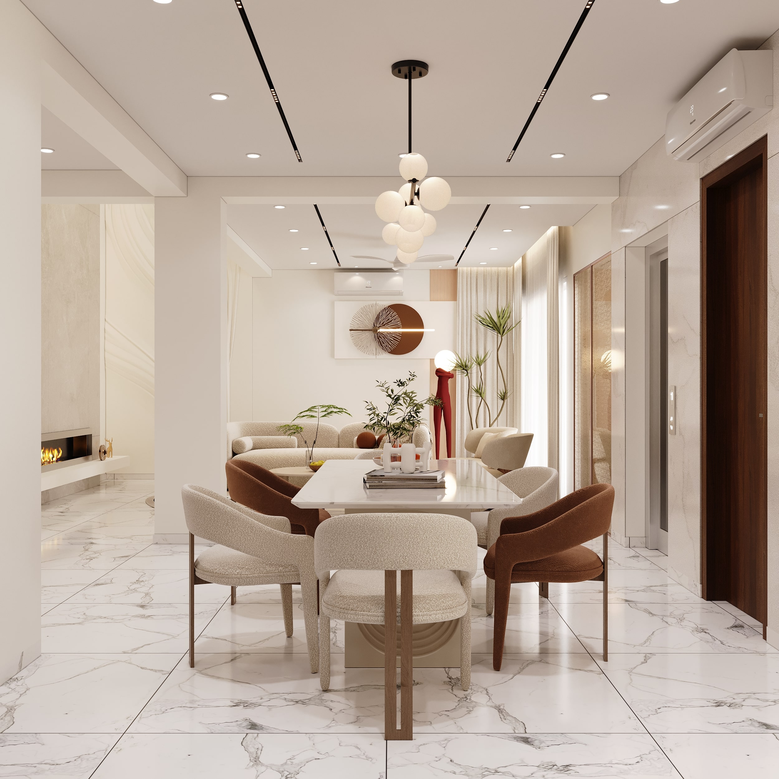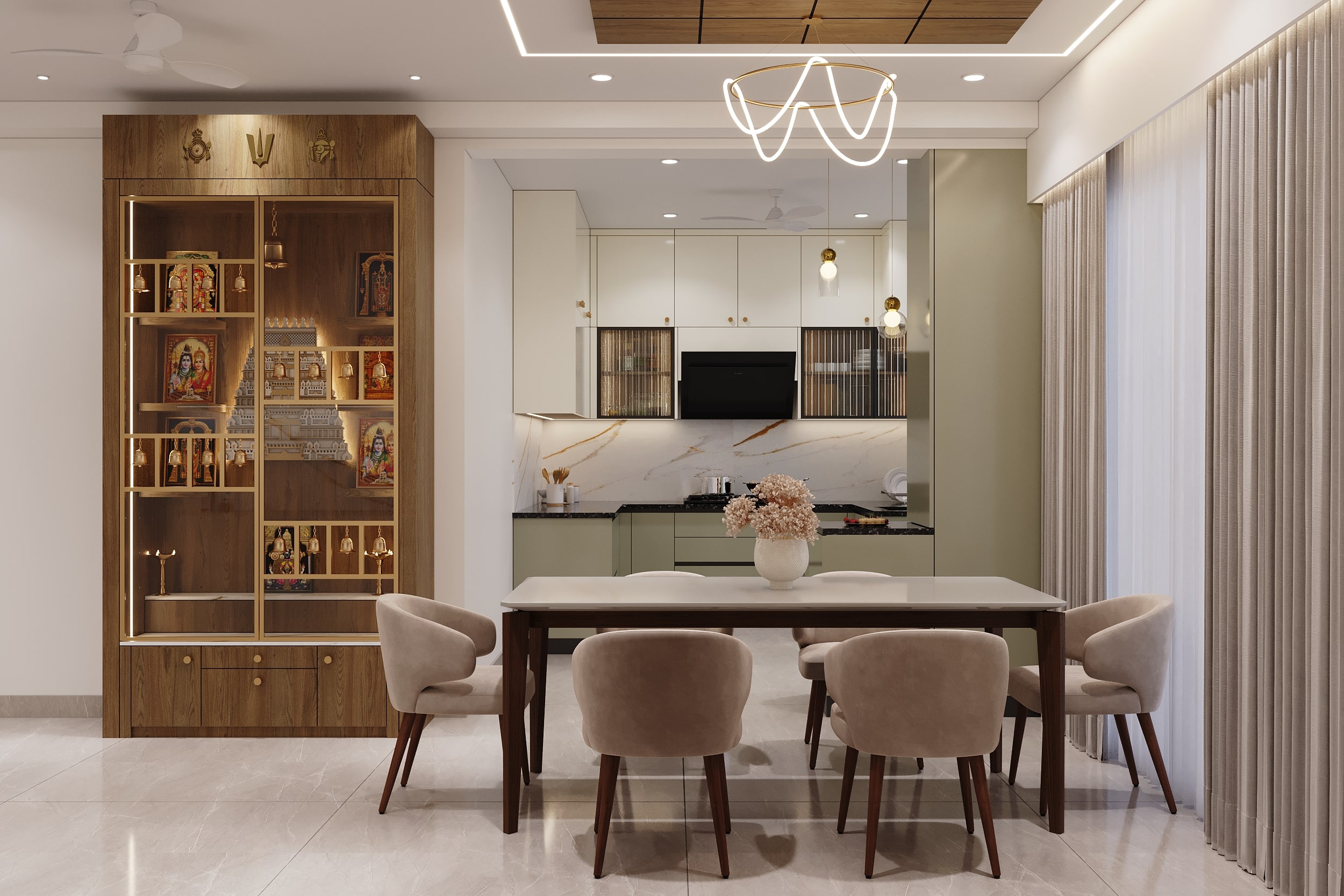 Mr. Dev Baburaj’s residence at SMR Vinay Iconia embodies contemporary luxury with warm tones, sculptural elements, and seamless spatial flow. The living, dining, and lounge areas exude calm refinement through curated textures, refined lighting, and modern minimalism, while the kitchen adds bold sophistication with its harmonious palette and crafted detailing. The bedroom continues this serene narrative with layered neutrals and understated opulence, creating a tranquil retreat that reflects a lifestyle of comfort, clarity, and elevated elegance.