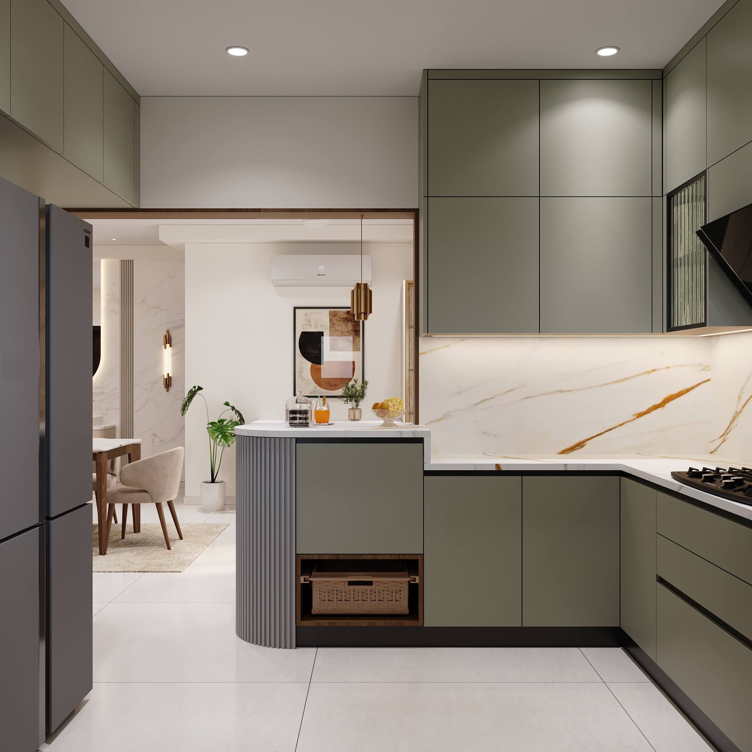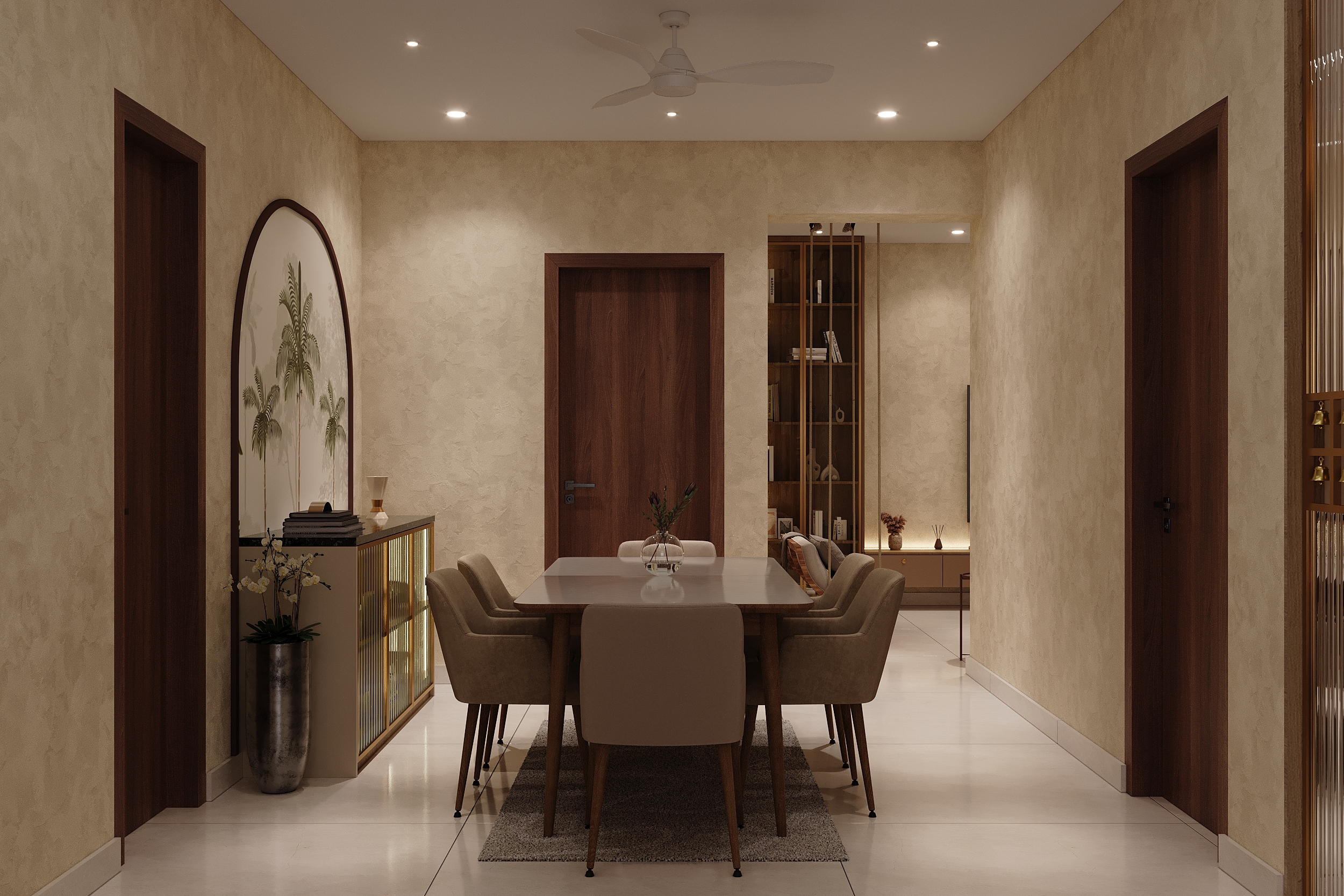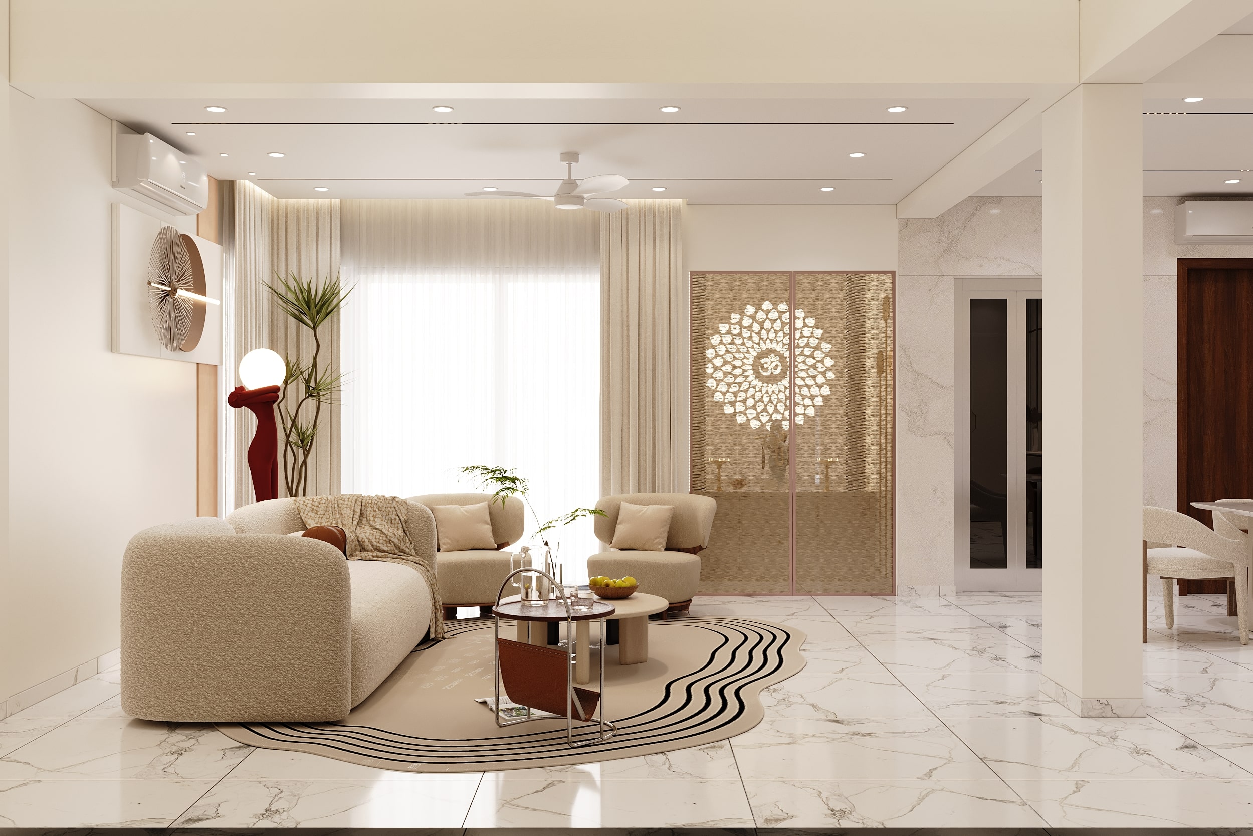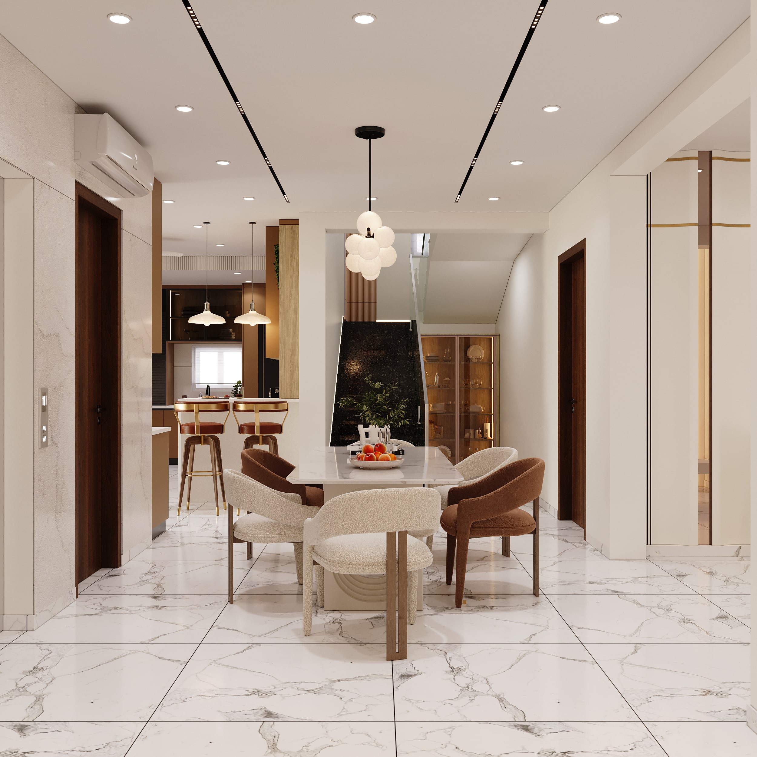 Mr. Dev Baburaj’s residence at SMR Vinay Iconia embodies contemporary luxury with warm tones, sculptural elements, and seamless spatial flow. The living, dining, and lounge areas exude calm refinement through curated textures, refined lighting, and modern minimalism, while the kitchen adds bold sophistication with its harmonious palette and crafted detailing. The bedroom continues this serene narrative with layered neutrals and understated opulence, creating a tranquil retreat that reflects a lifestyle of comfort, clarity, and elevated elegance.