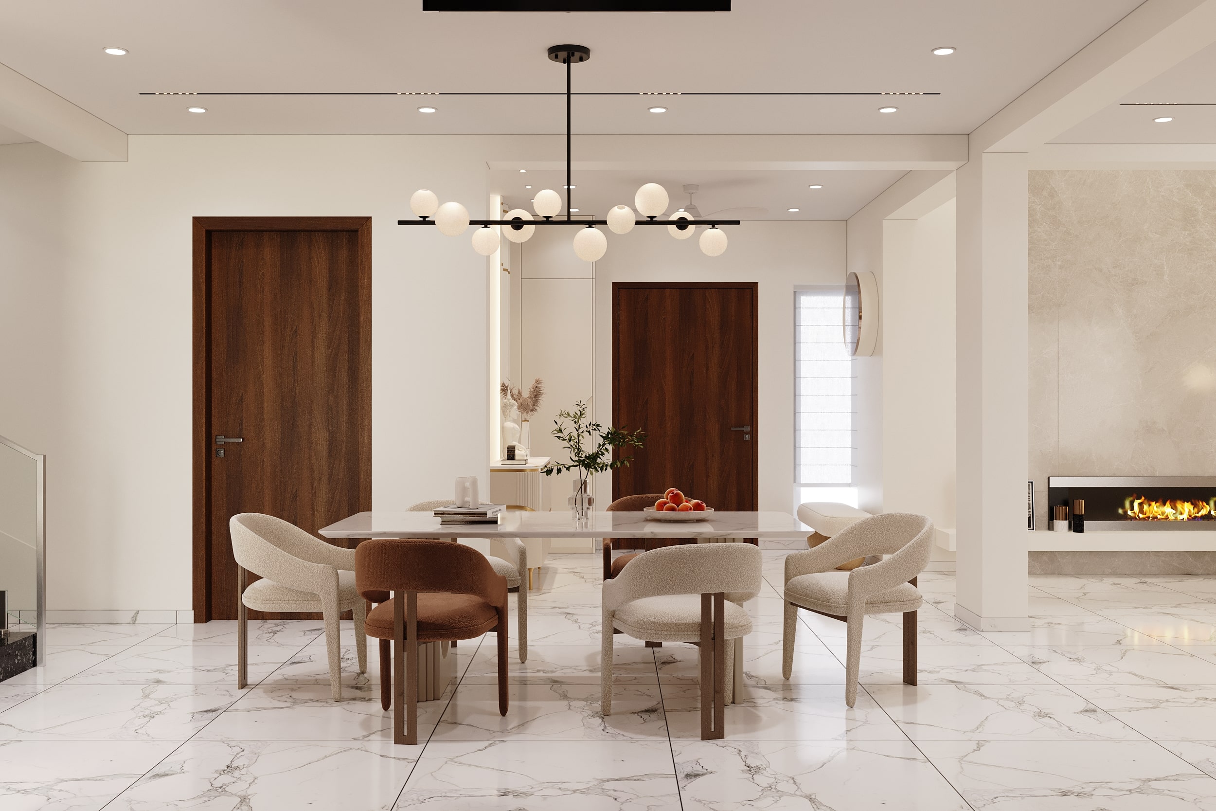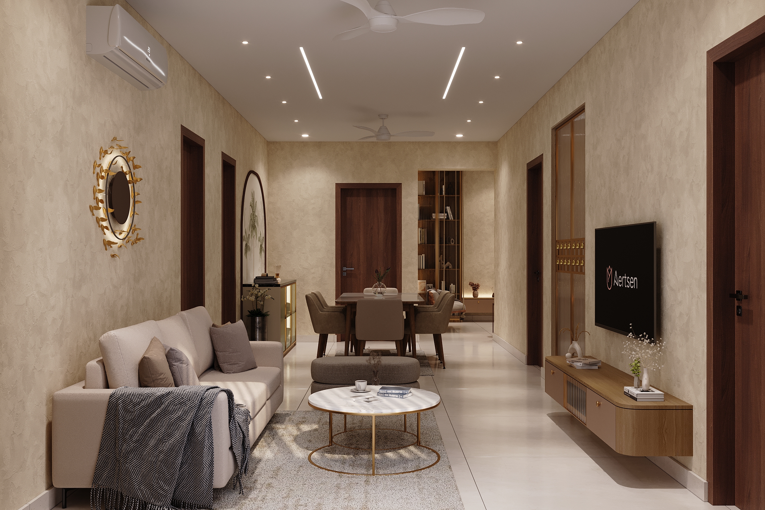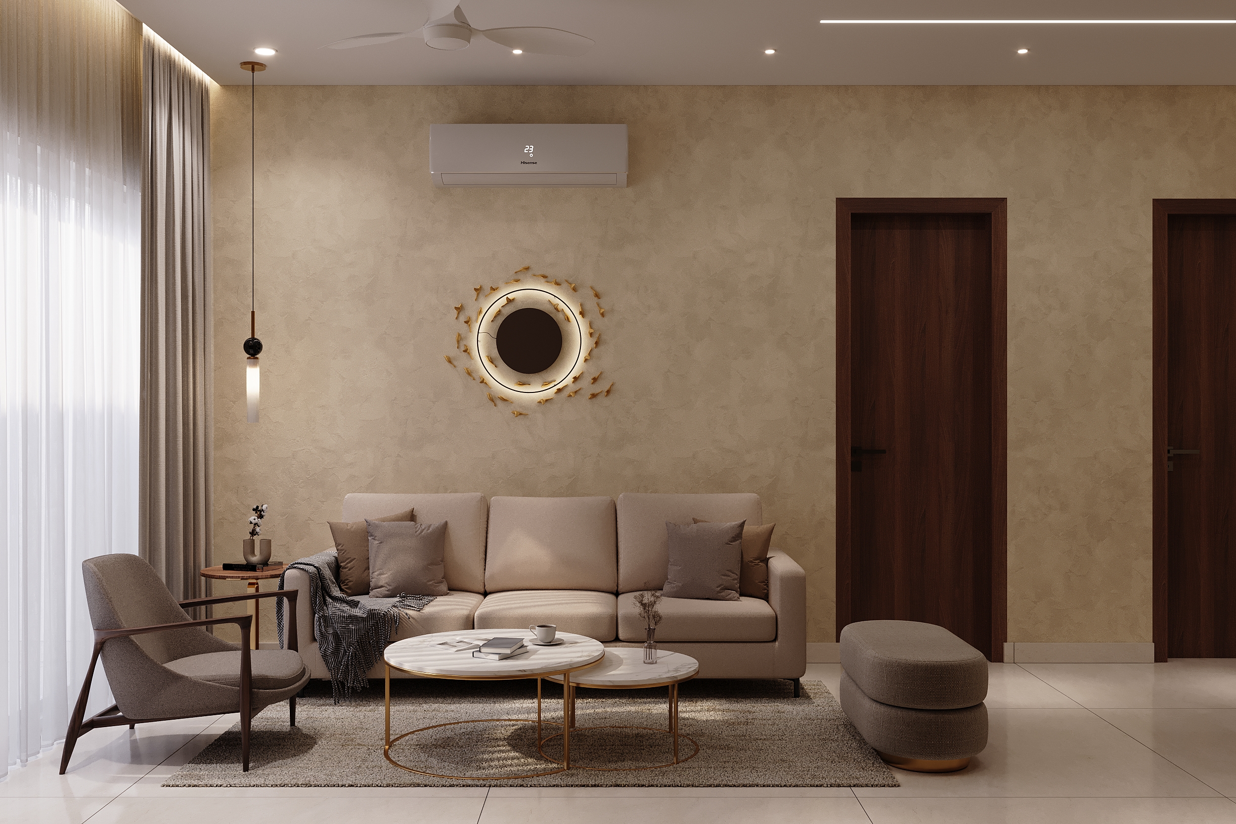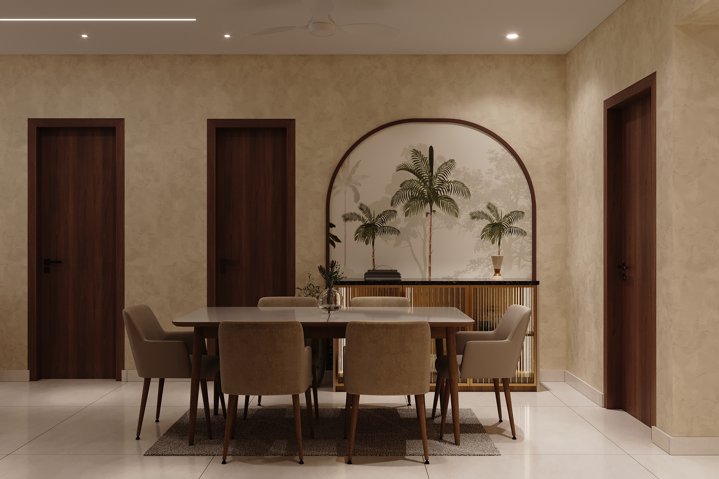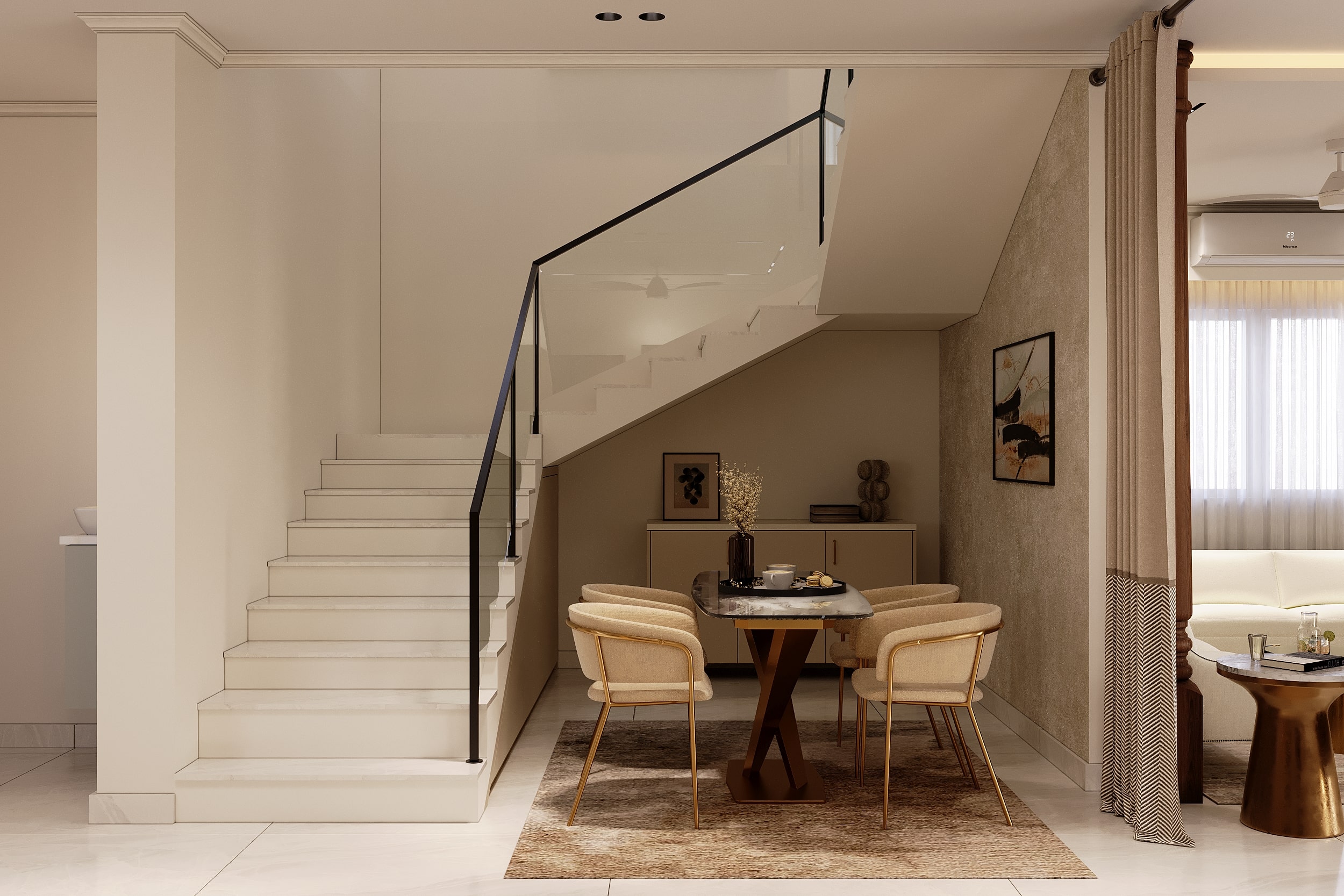 Mr. Dev Baburaj’s residence at SMR Vinay Iconia embodies contemporary luxury with warm tones, sculptural elements, and seamless spatial flow. The living, dining, and lounge areas exude calm refinement through curated textures, refined lighting, and modern minimalism, while the kitchen adds bold sophistication with its harmonious palette and crafted detailing. The bedroom continues this serene narrative with layered neutrals and understated opulence, creating a tranquil retreat that reflects a lifestyle of comfort, clarity, and elevated elegance.