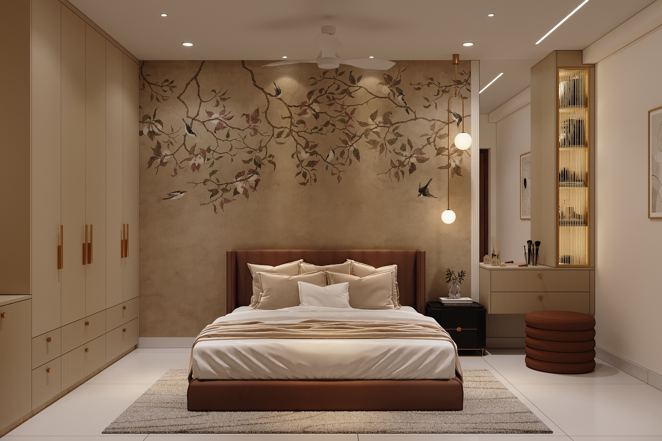 The master suite achieves serene retreat through hand-painted botanical murals with delicate foliage and birds. A leather-upholstered bed anchors the space while champagne wardrobes provide seamless storage and integrated dressing alcove. Pendant globe lights create layered ambiance across textured walls and plush linens. The space balances restful intimacy with refined sophistication.