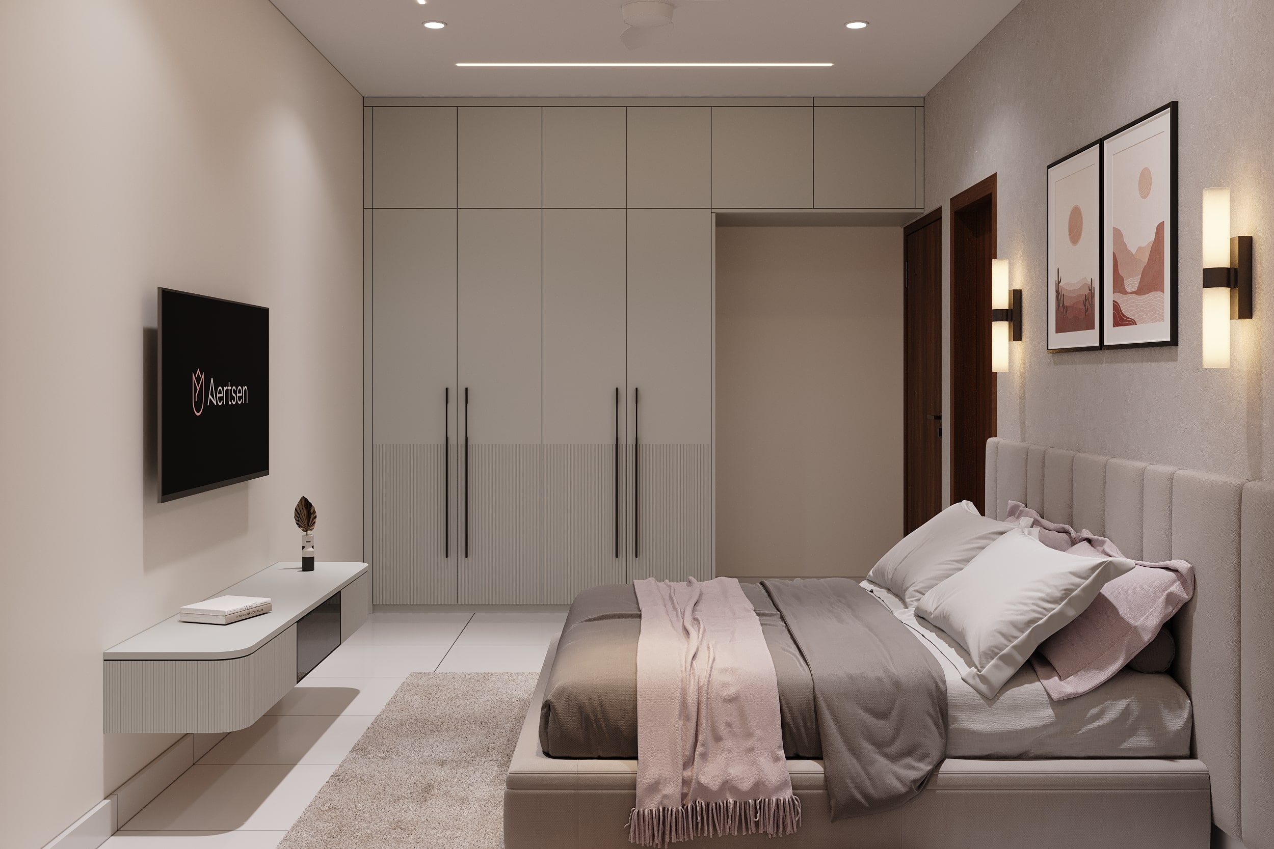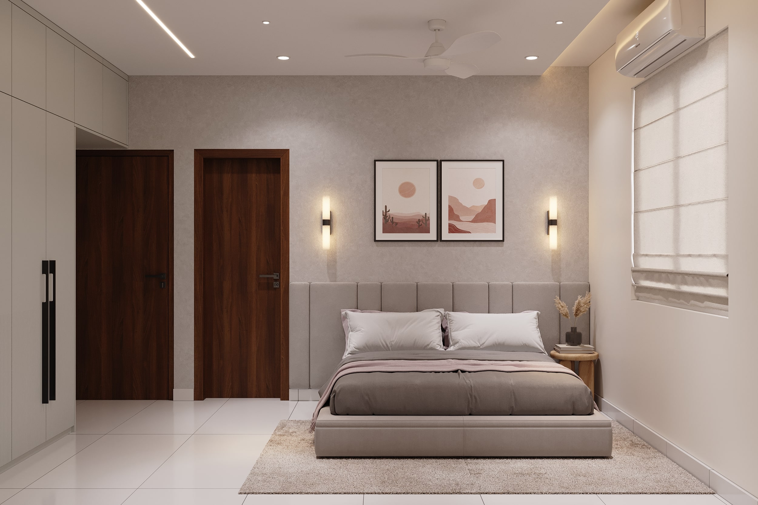 The master bedroom is envisioned as a private haven, where muted tones and tactile finishes create an atmosphere of quiet sophistication. An upholstered bed forms the centrepiece, layered with earthy neutrals and plush cushions for visual depth and comfort. The headboard wall, with its gentle arch and trio of textured art pieces, adds a subtle artistic touch, while integrated lighting casts a warm, ambient glow across the space.