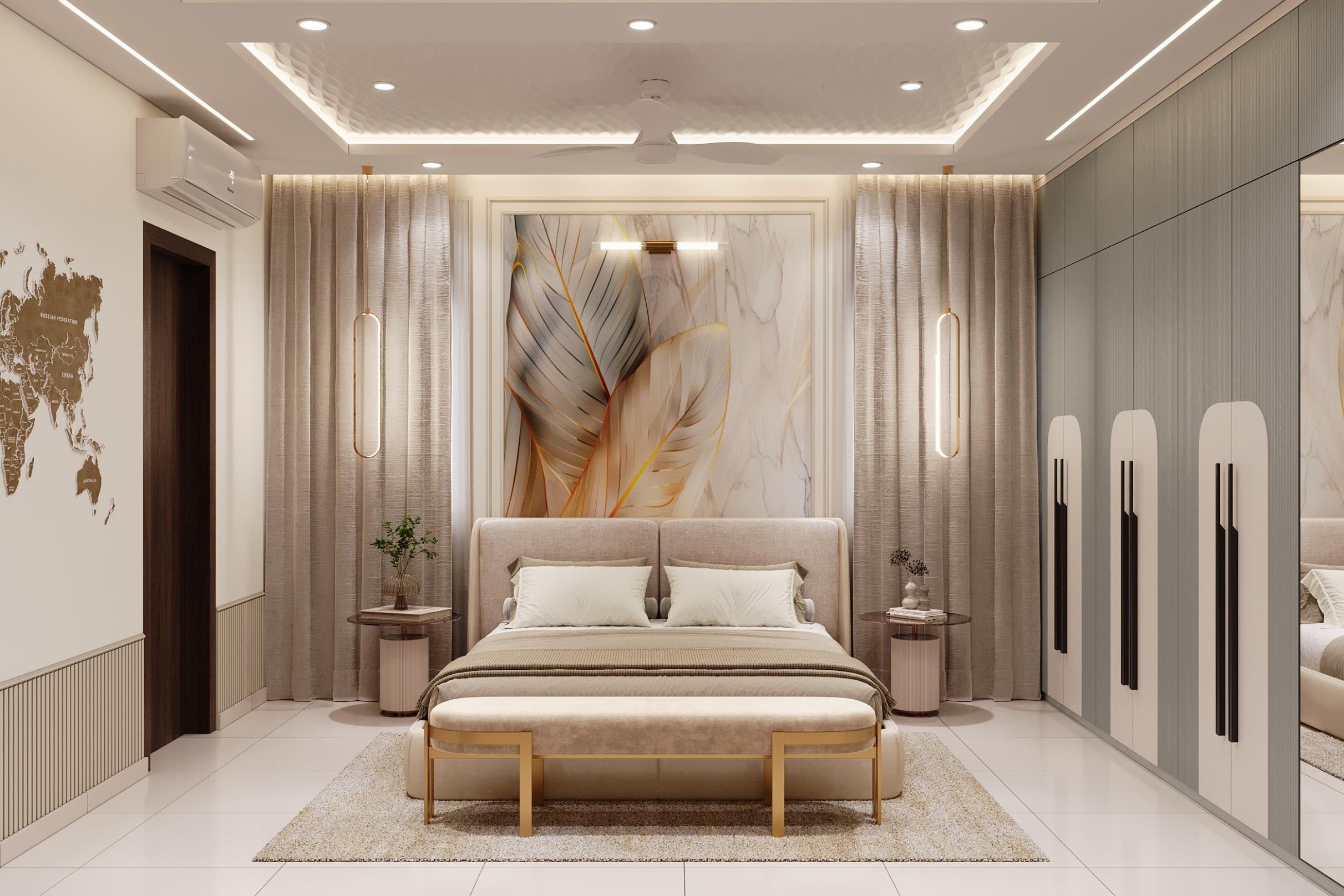The master bedroom unfolds like a canvas of calm — muted taupe, soft greys, and feathered wall art blending into a setting that feels both expansive and intimate. The clean geometry of the wardrobes and the glow of pendant lights add a sense of balance, while subtle gold accents lend quiet luxury. Every detail, from the layered curtains to the plush textures, creates an atmosphere that feels restorative, a retreat where elegance doesn’t compete but embraces.