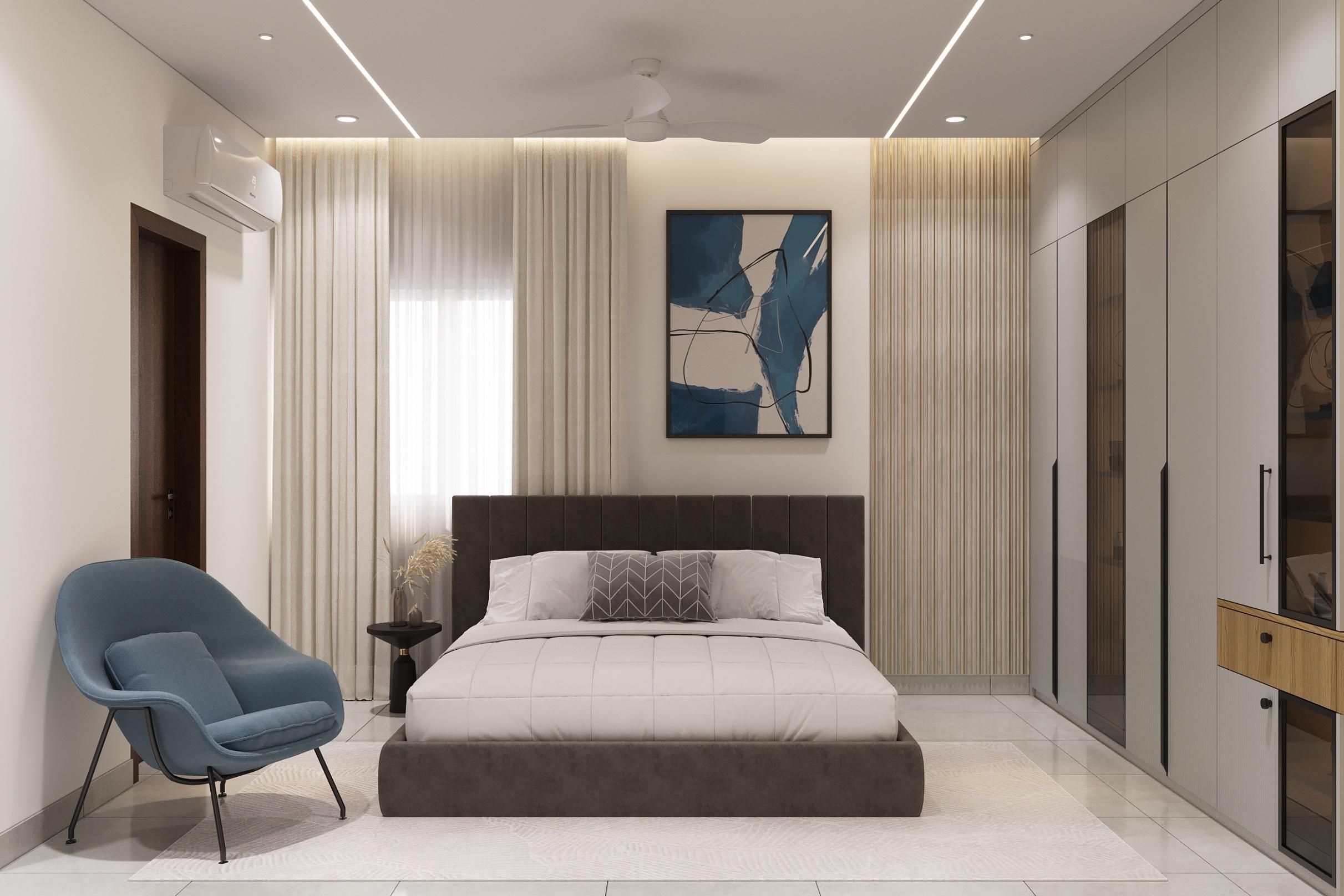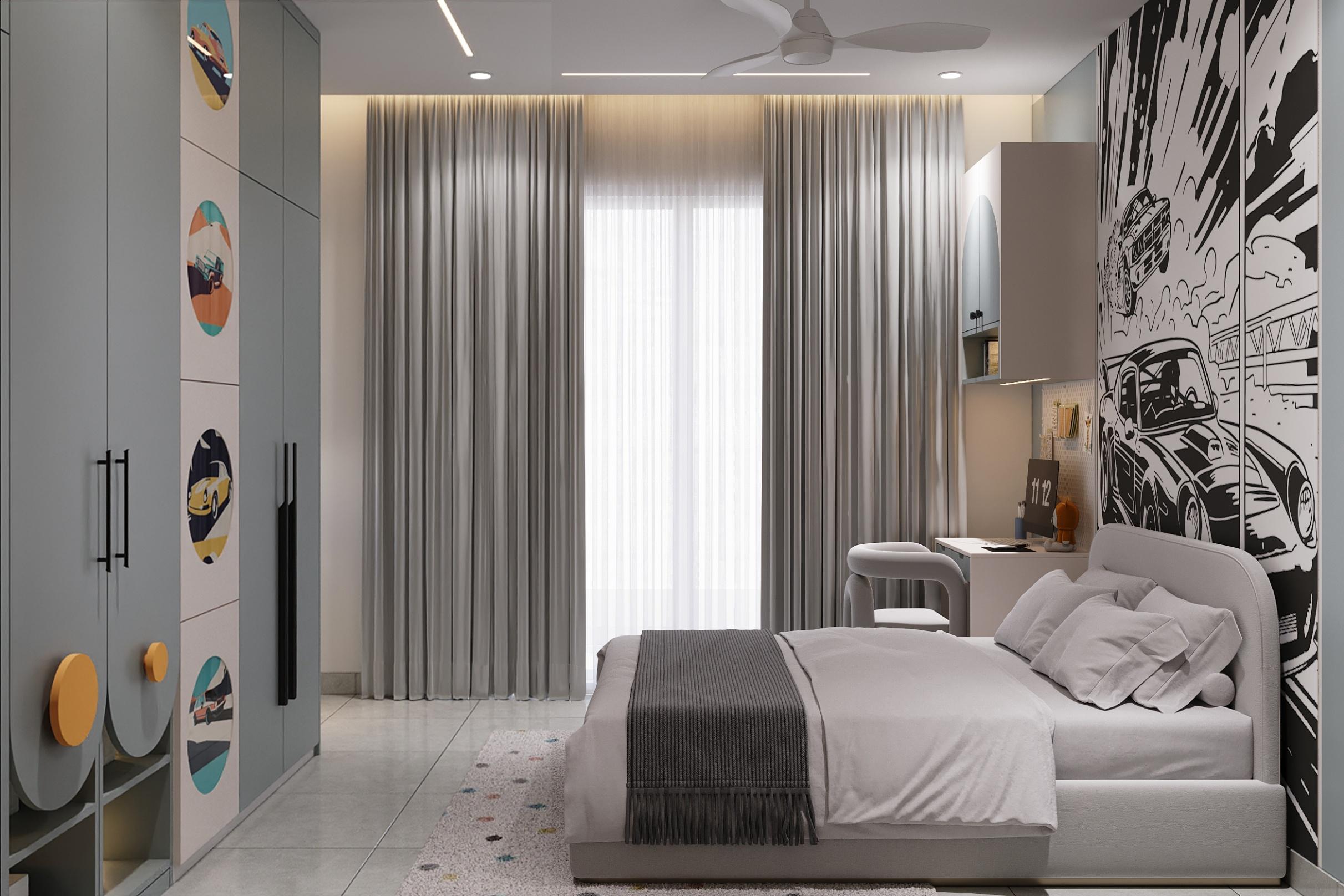 In contrast, the youth quarters radiate playful energy within a modern framework. A grey-blue base anchors bold elements like a vibrant mural, colourful cabinetry, and a basketball wall combining practicality, fun, and personality. The result is a space that feels both dynamic and harmoniously designed. It celebrates individuality while staying connected to the home’s modern aesthetic.