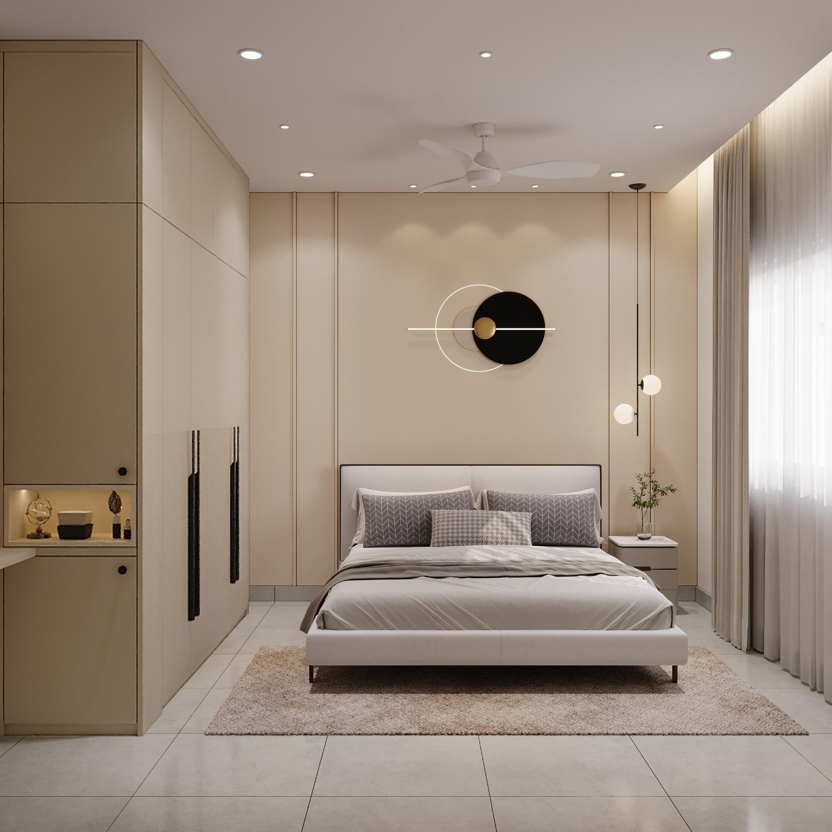 The private quarters exude serene sophistication, blending minimalist luxury with a calming palette of creams, beiges, and soft greys. Plush textures, refined furniture, and layered lighting create a tranquil environment ideal for rest and focus. Every detail contributes to a soothing, timeless ambience. The overall mood reflects quiet refinement and effortless comfort.