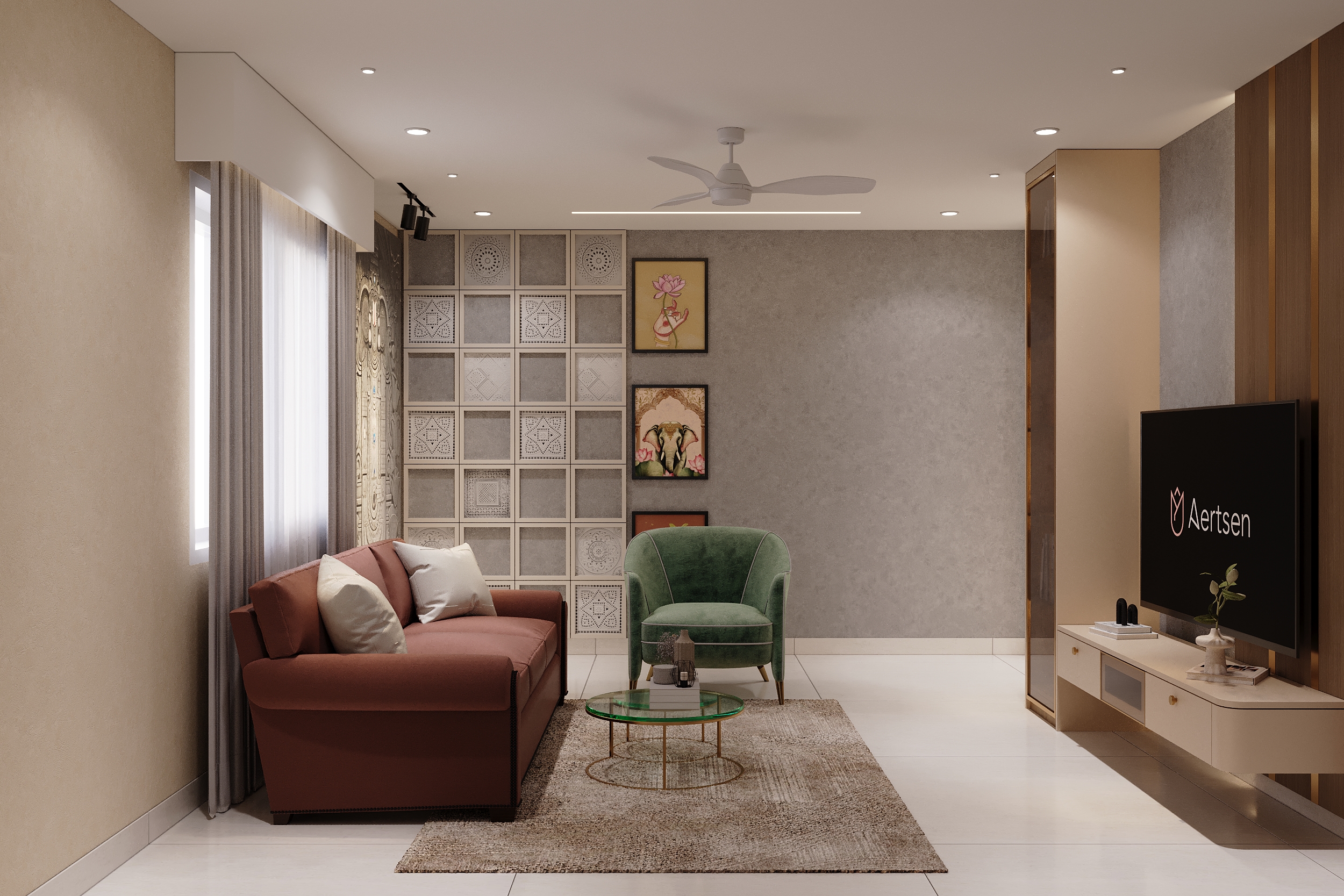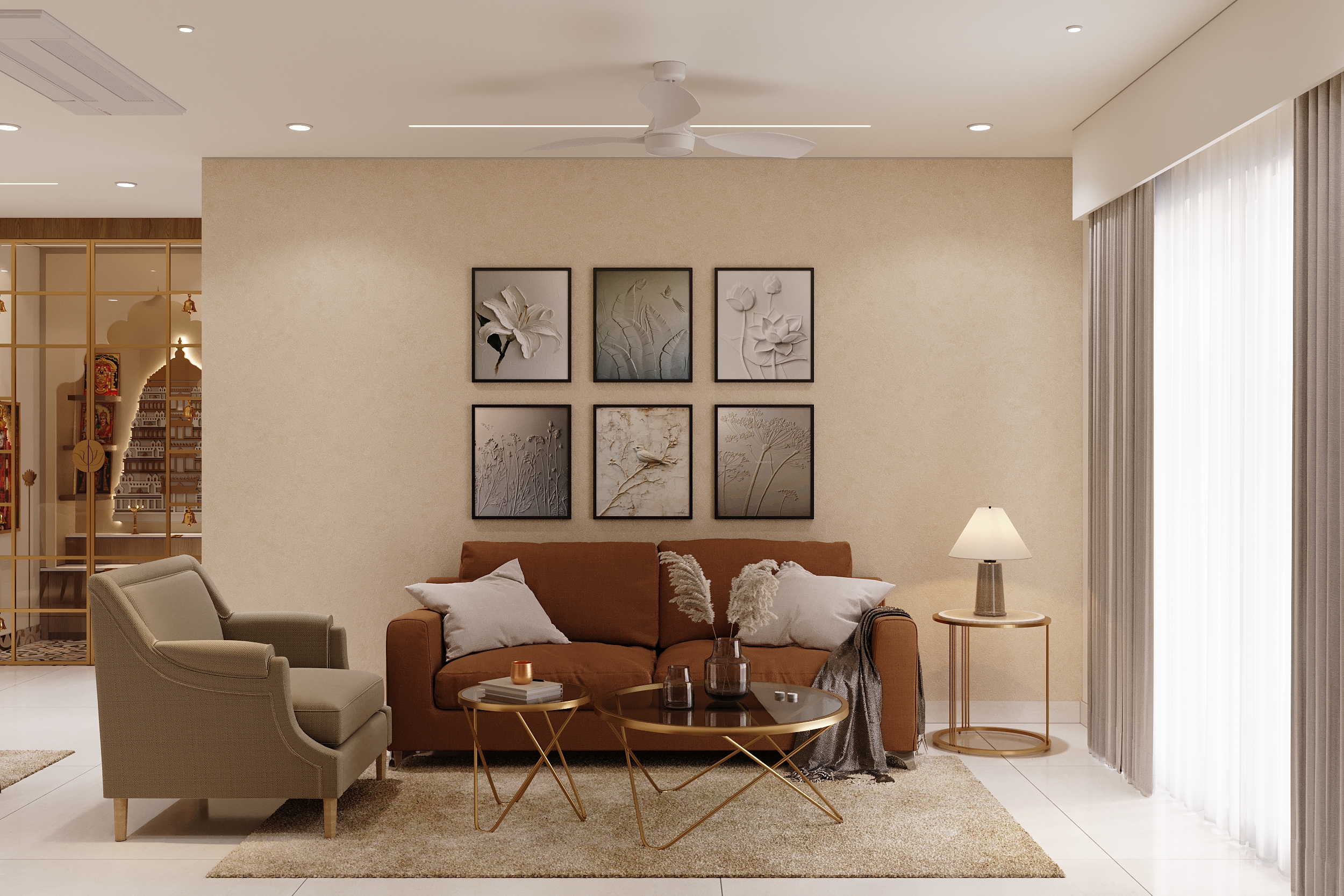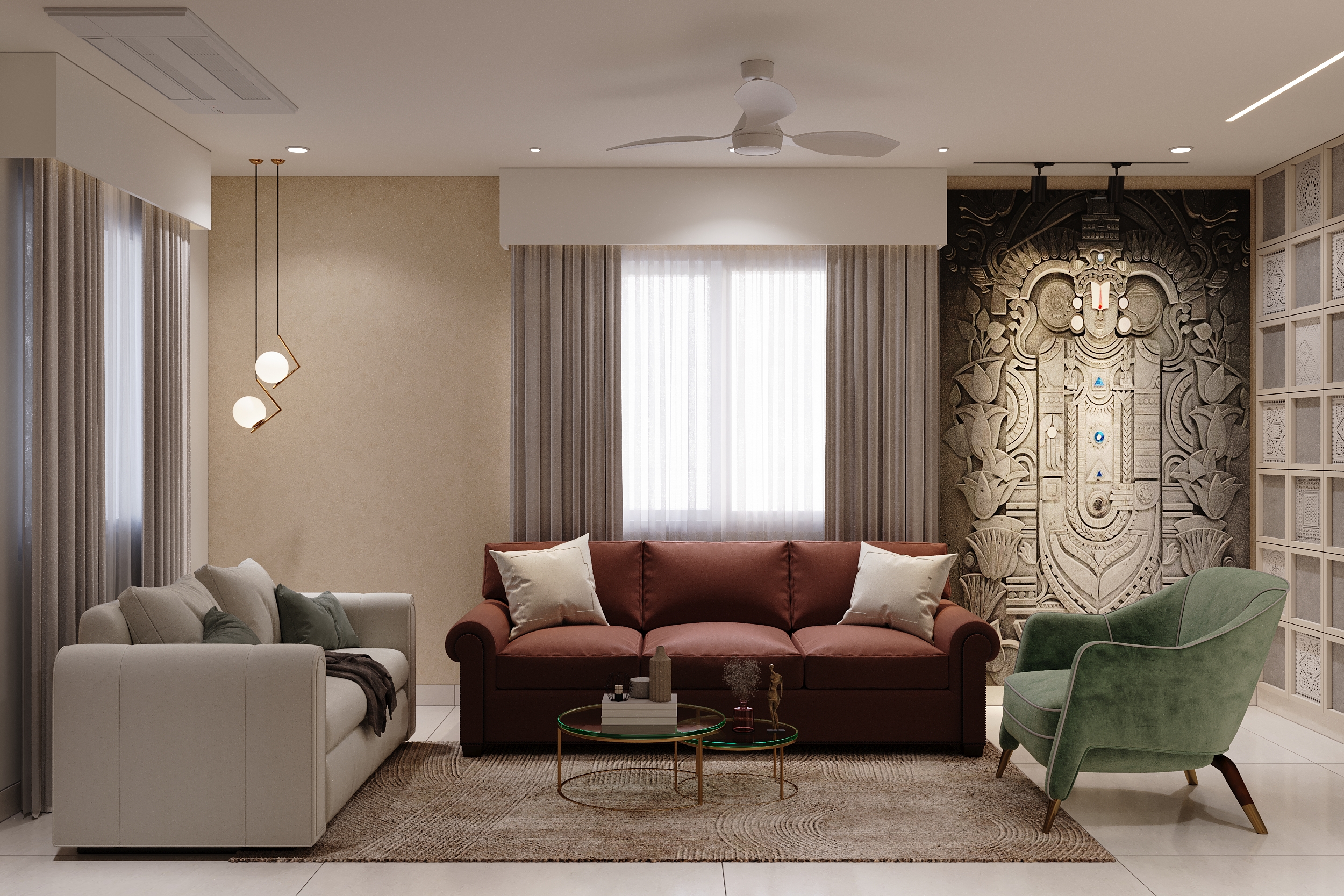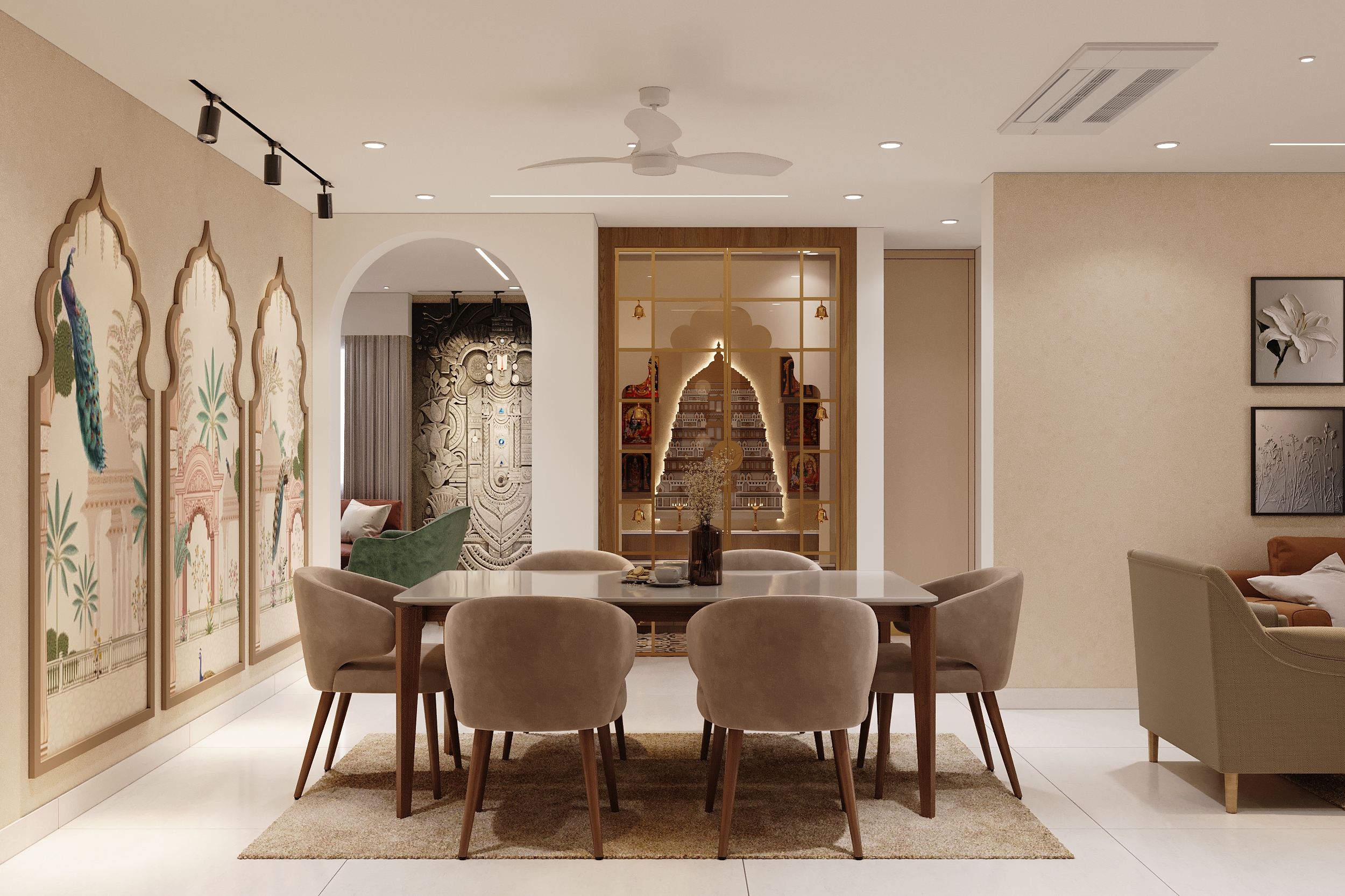 The living room is a masterclass in layered storytelling — a commanding deity wall mural anchors the space with spiritual gravitas, while intricately carved panel partitions, warm terracotta upholstery, gold accents and a peacock-adorned dining backdrop compose a living canvas that is as culturally resonant as it is visually arresting.
