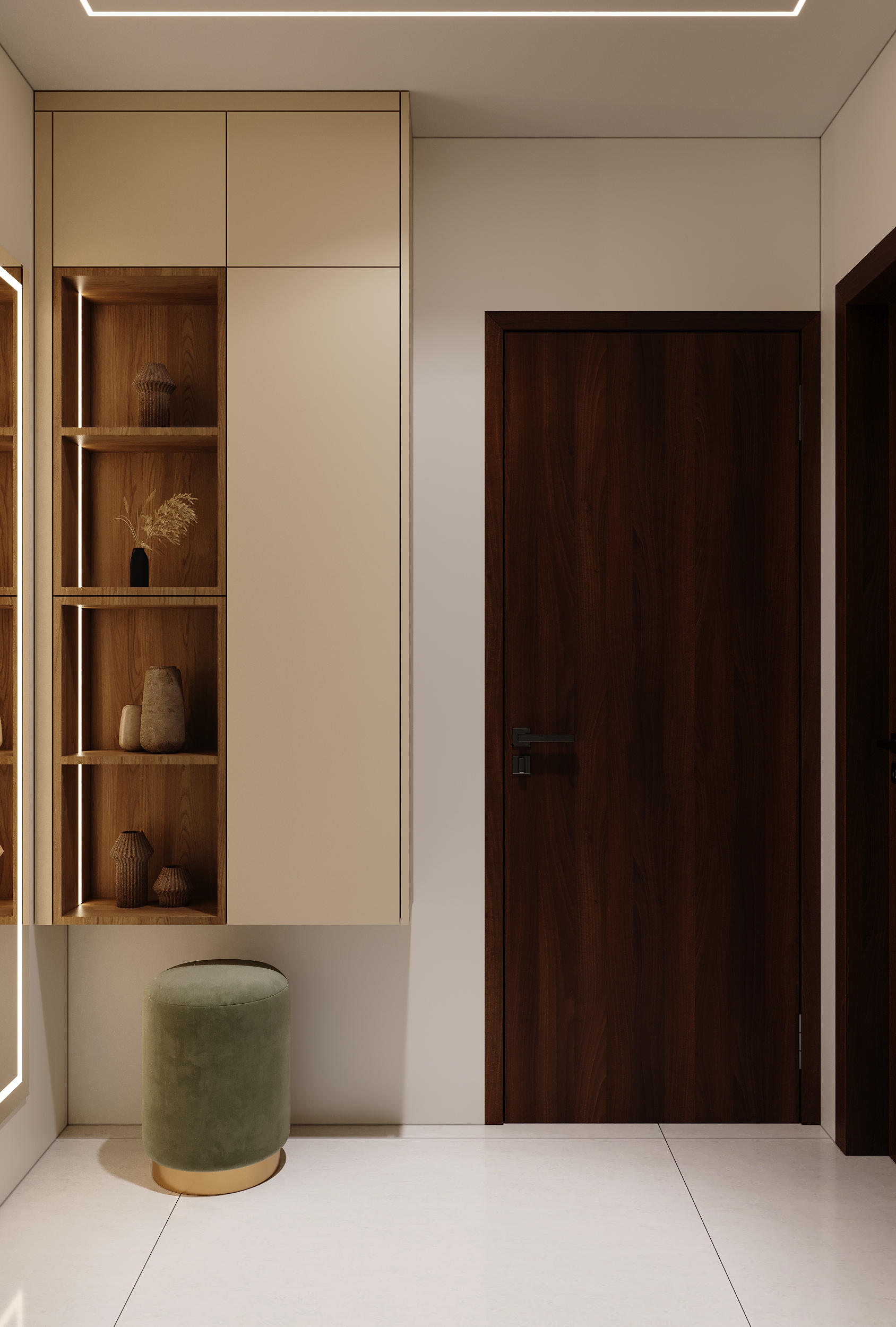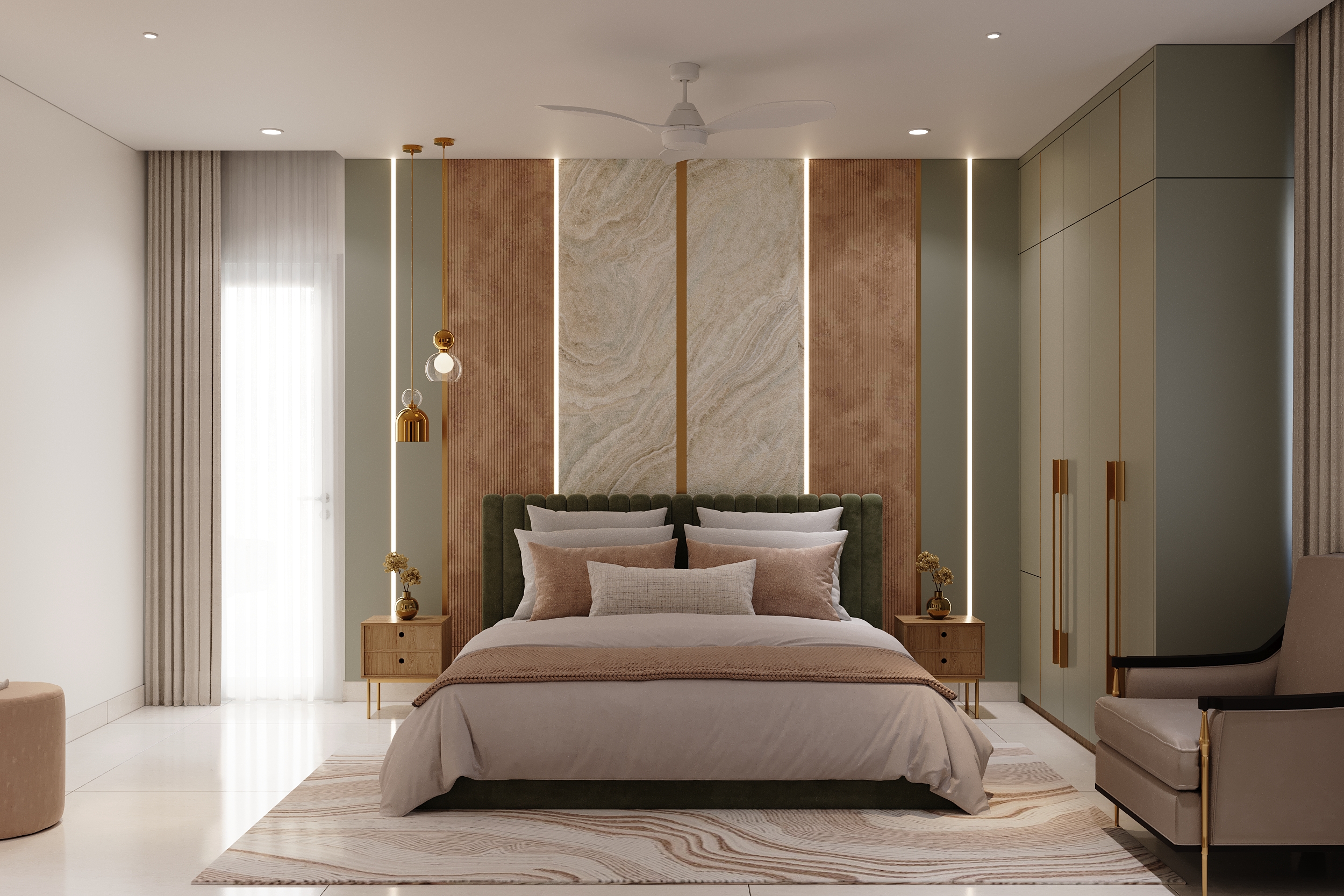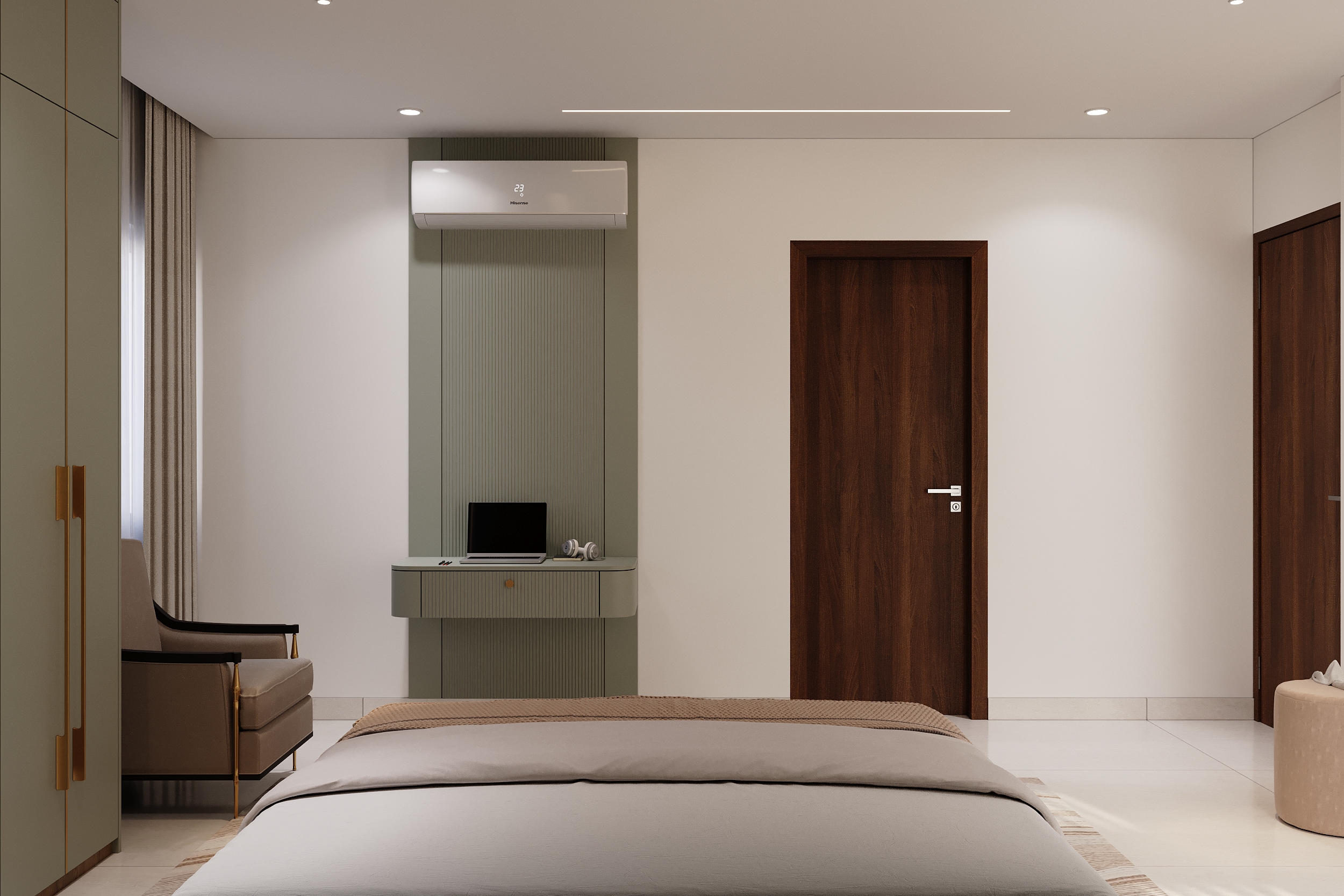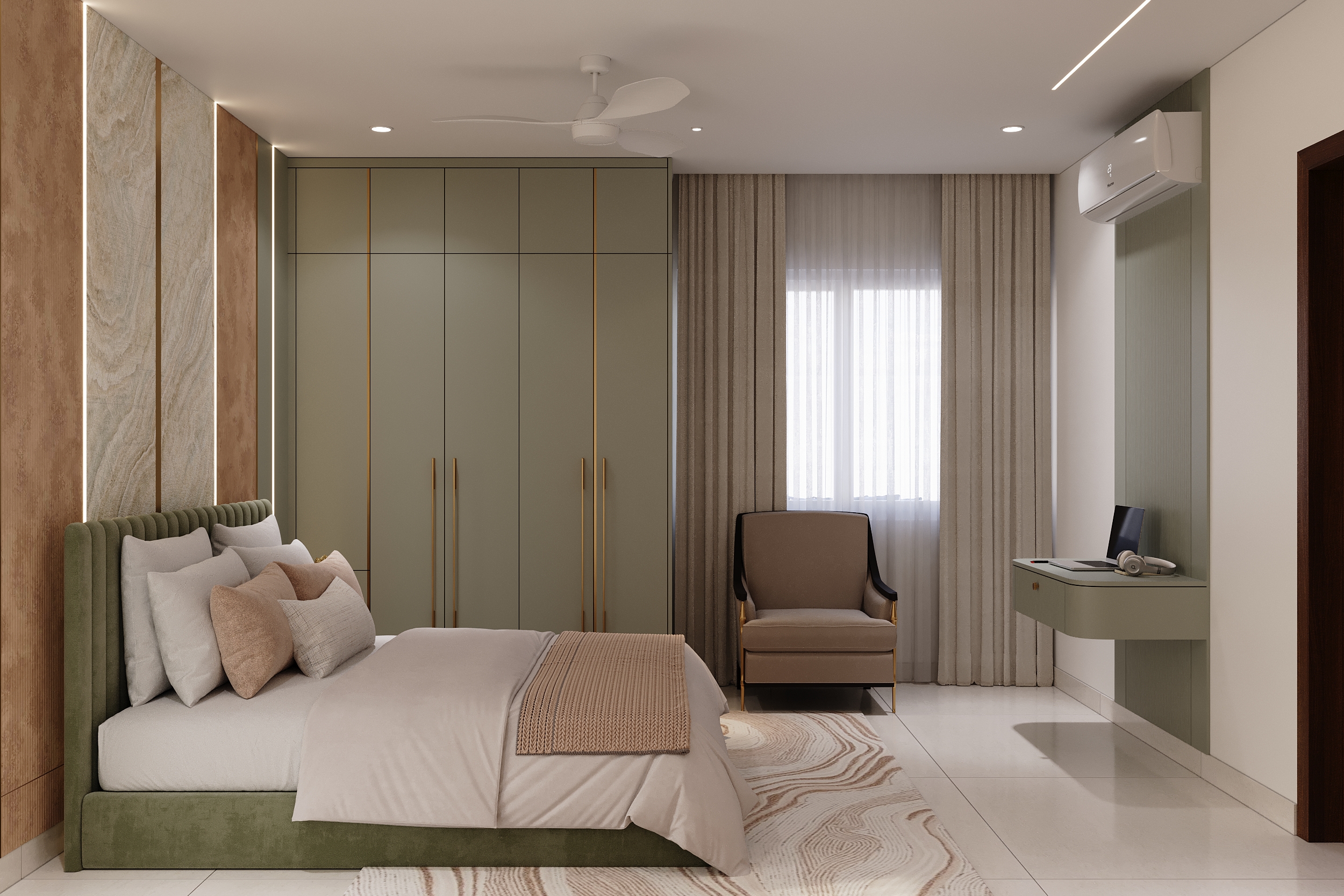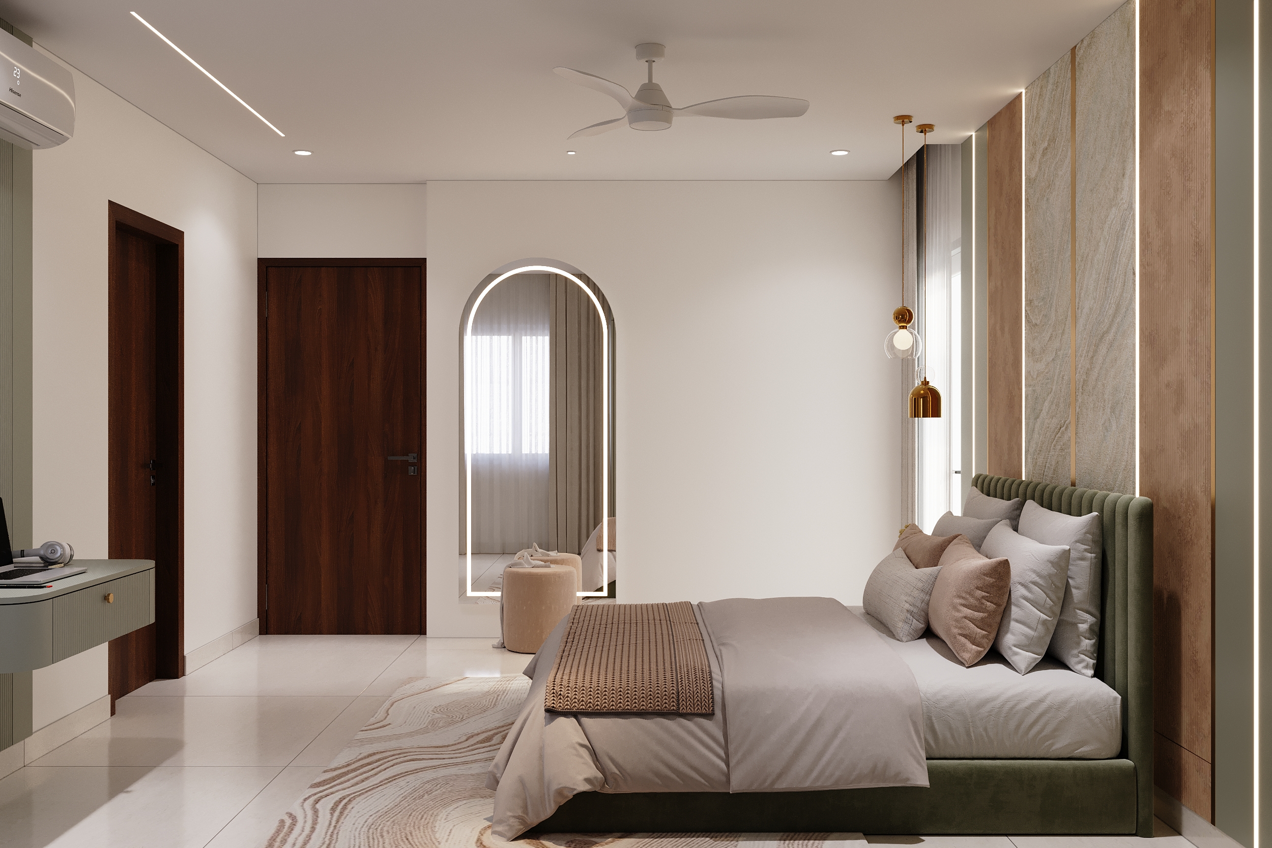 A marble-veined headwall flanked by warm linear lighting, a deep green tufted bedframe, sage wardrobes with gold handles and an arched full-length mirror — every element of this space speaks a language of quiet luxury and considered elegance. From the bespoke study nook to the warmly lit display shelving, every corner is designed to offer both comfort and beauty in equal measurer. A space conceived not merely to rest within, but to truly restore oneself.