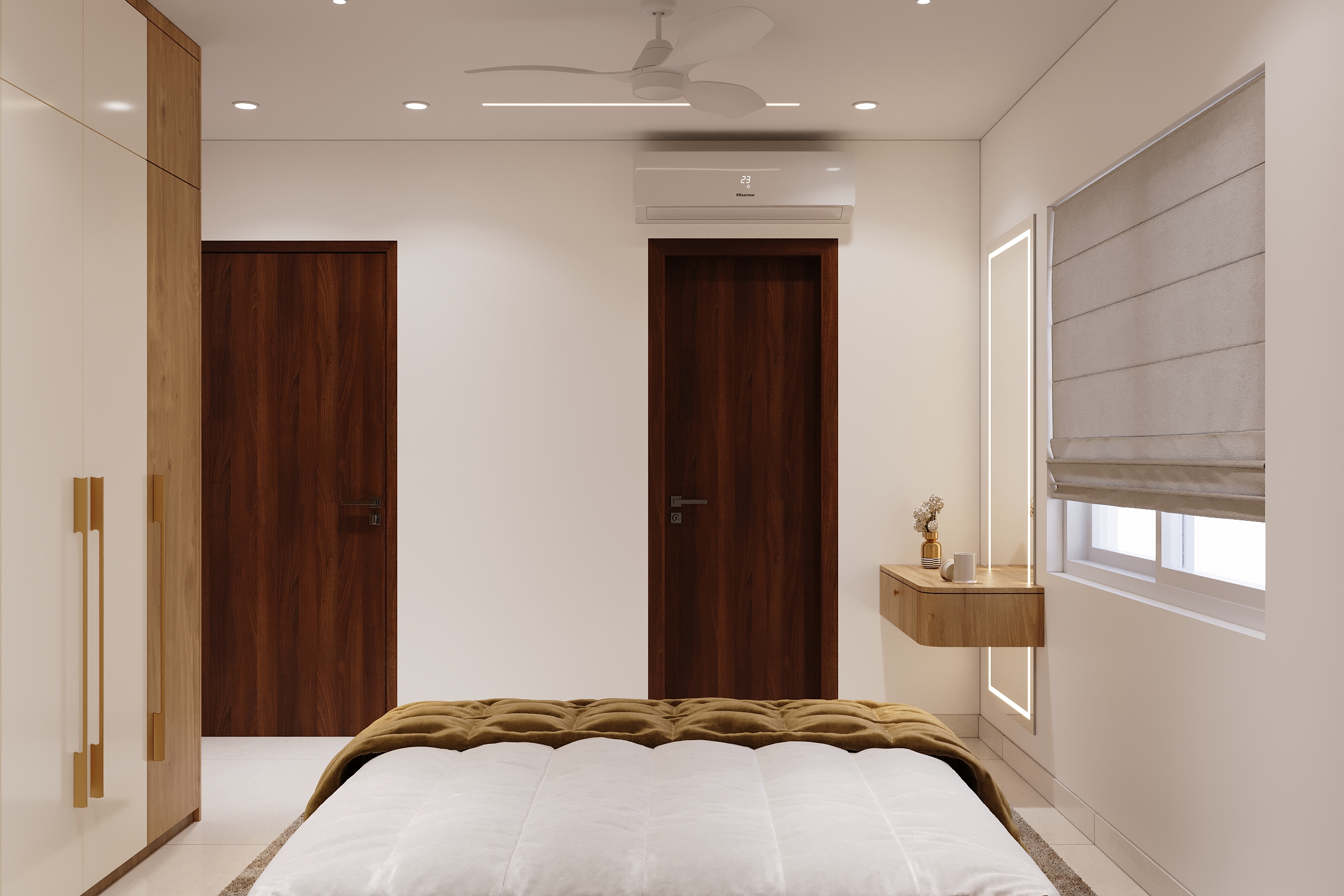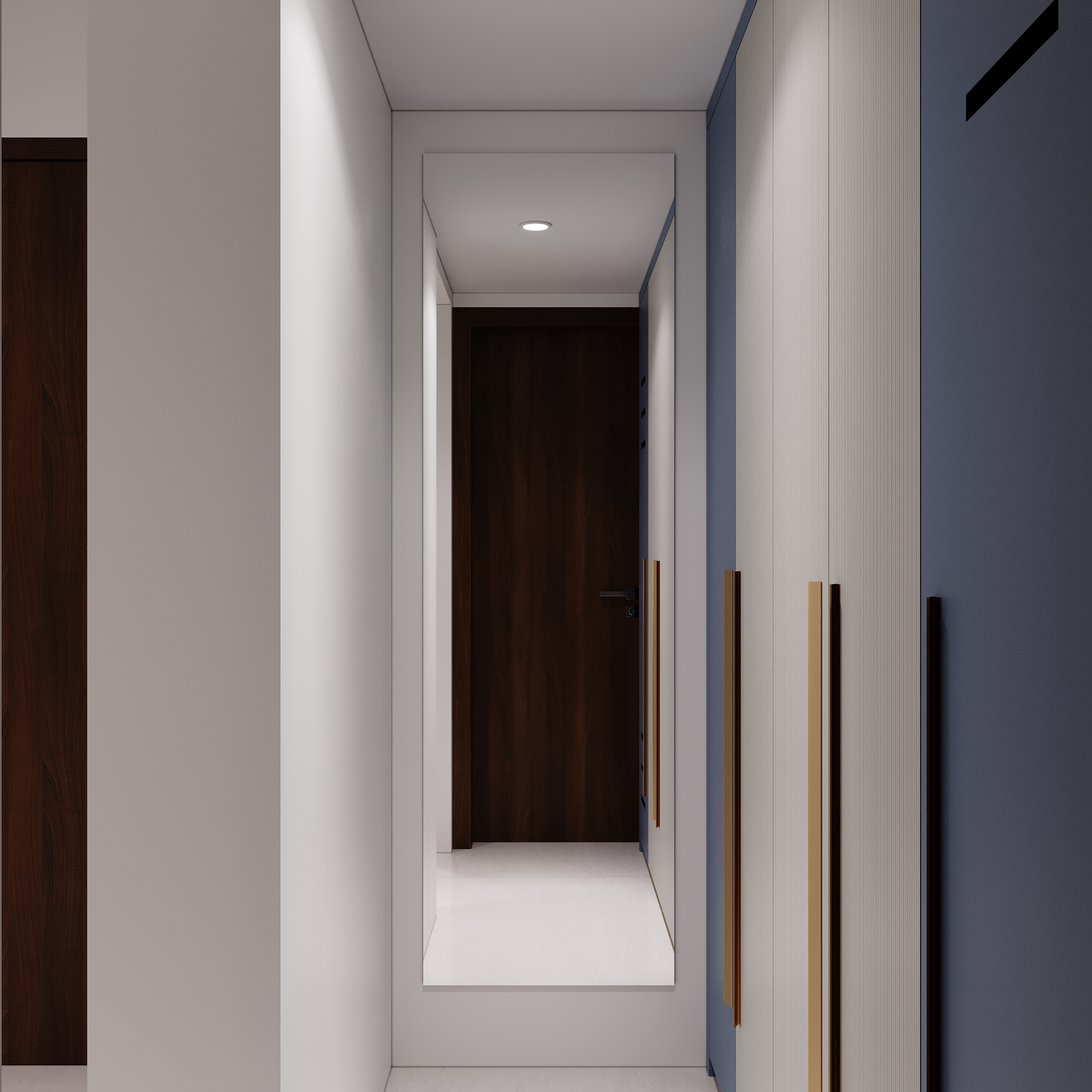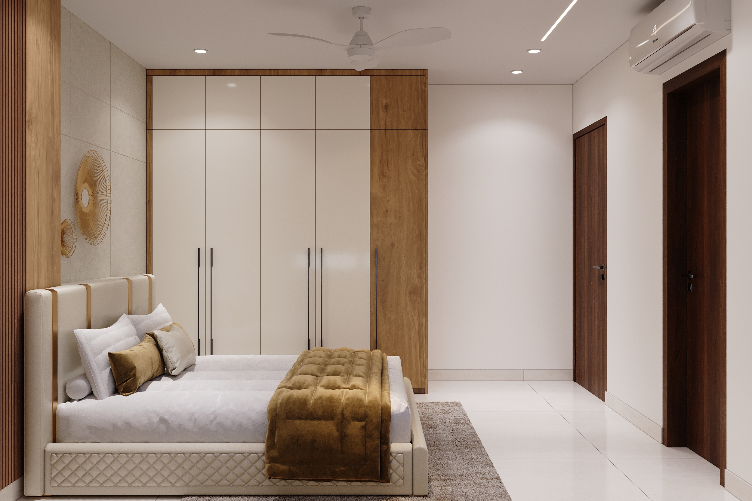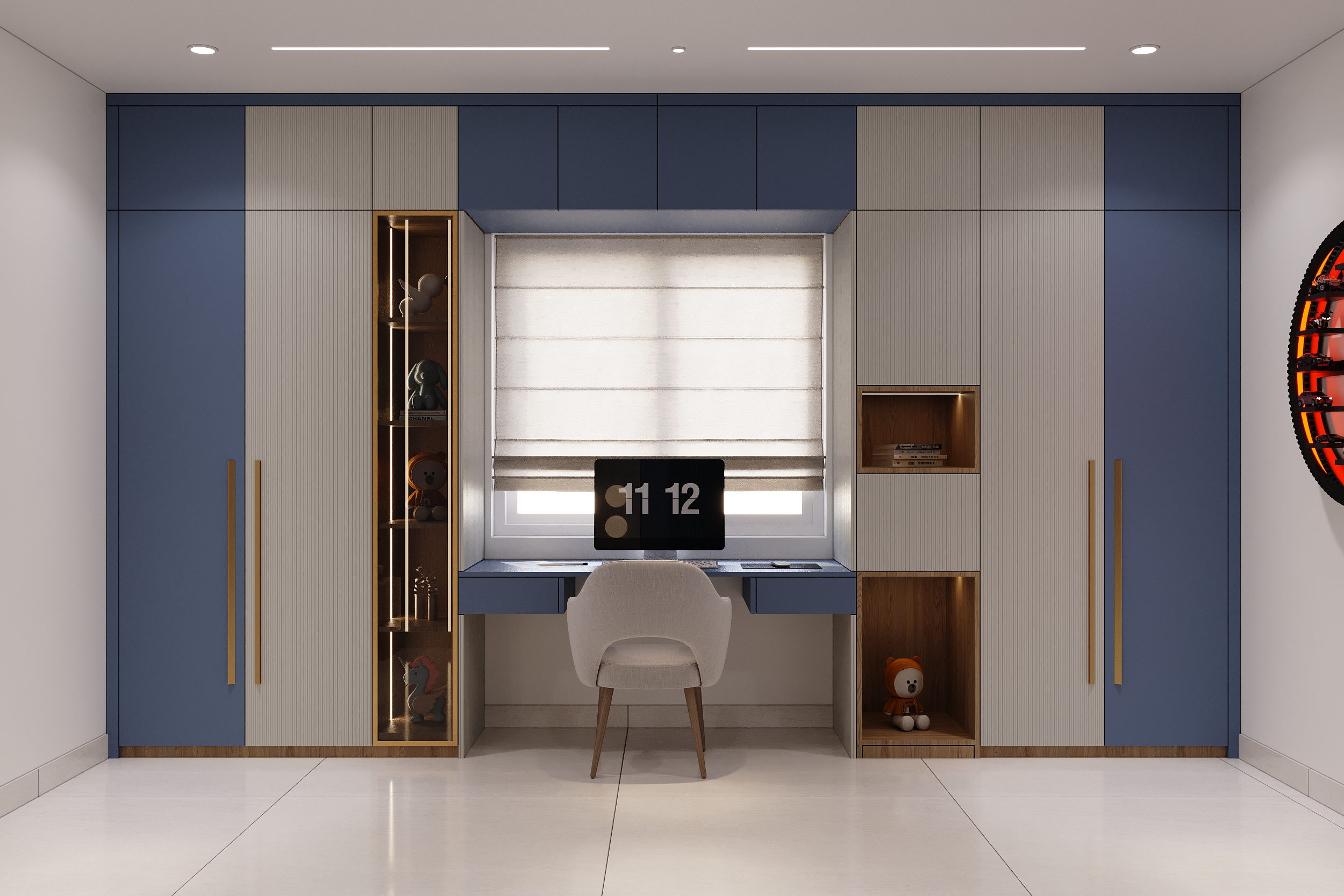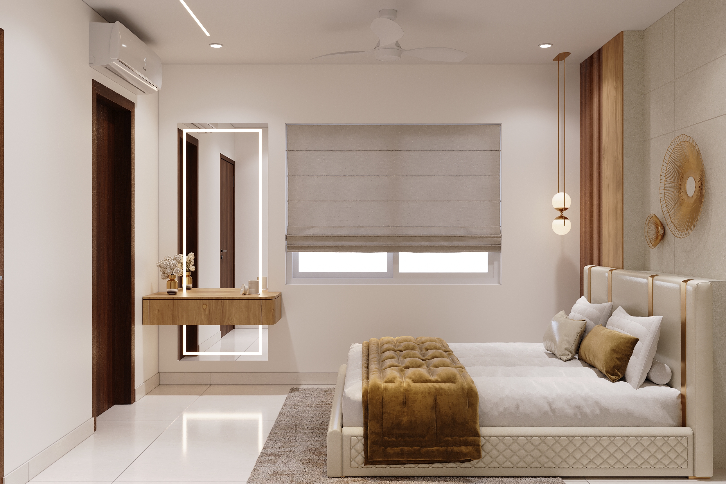 A marble-veined headwall flanked by warm linear lighting, a deep green tufted bedframe, sage wardrobes with gold handles and an arched full-length mirror — every element of this space speaks a language of quiet luxury and considered elegance. From the bespoke study nook to the warmly lit display shelving, every corner is designed to offer both comfort and beauty in equal measurer. A space conceived not merely to rest within, but to truly restore oneself.