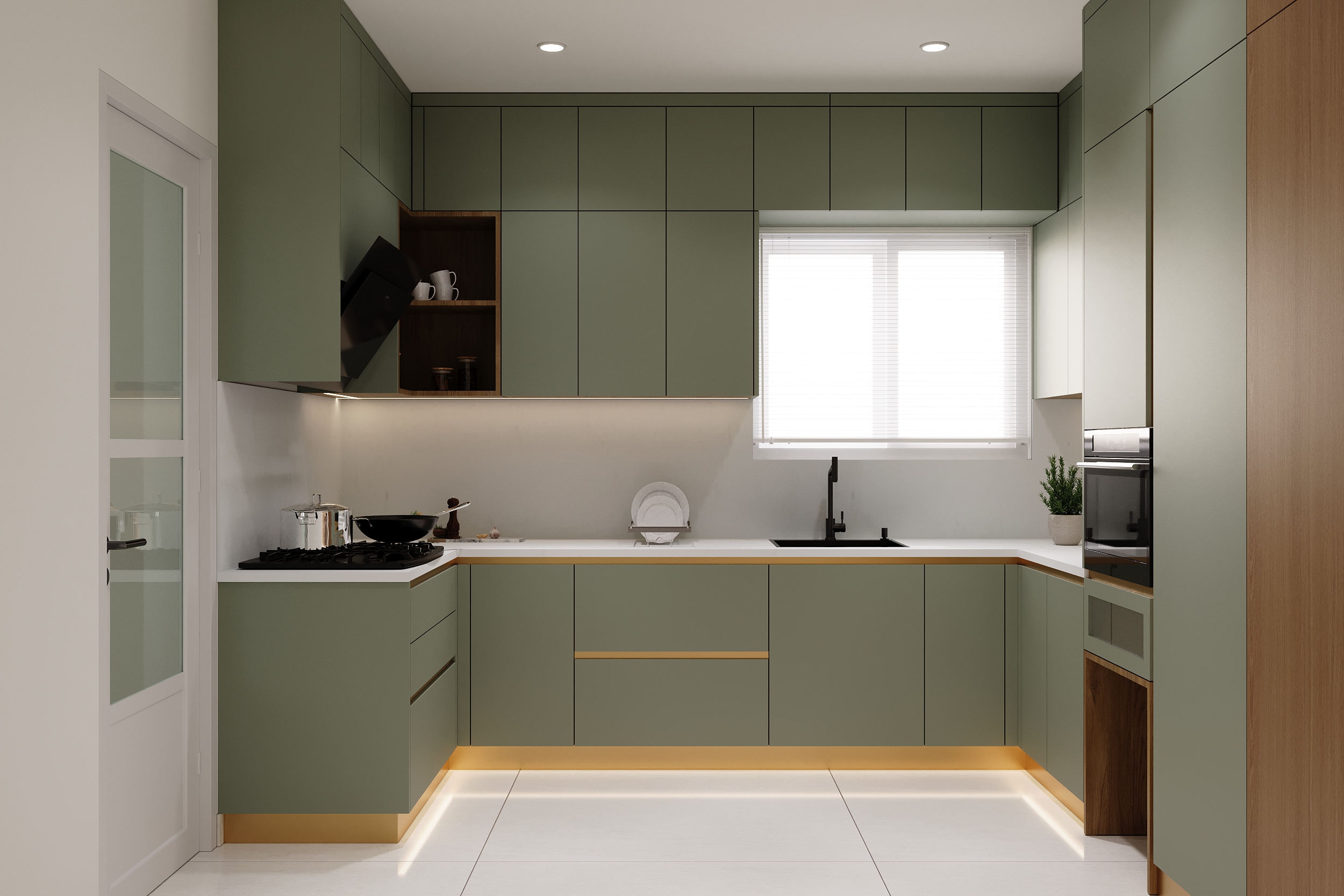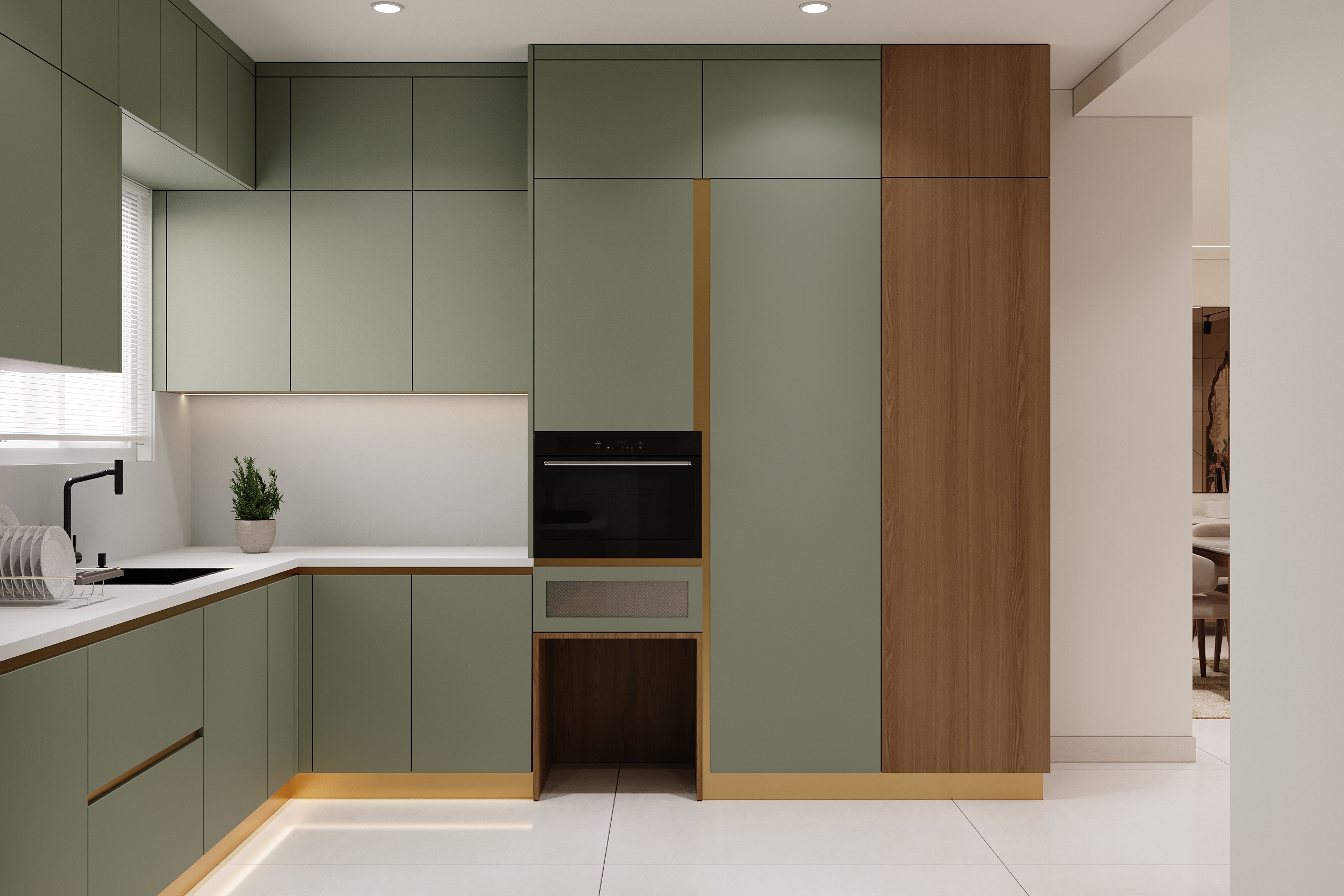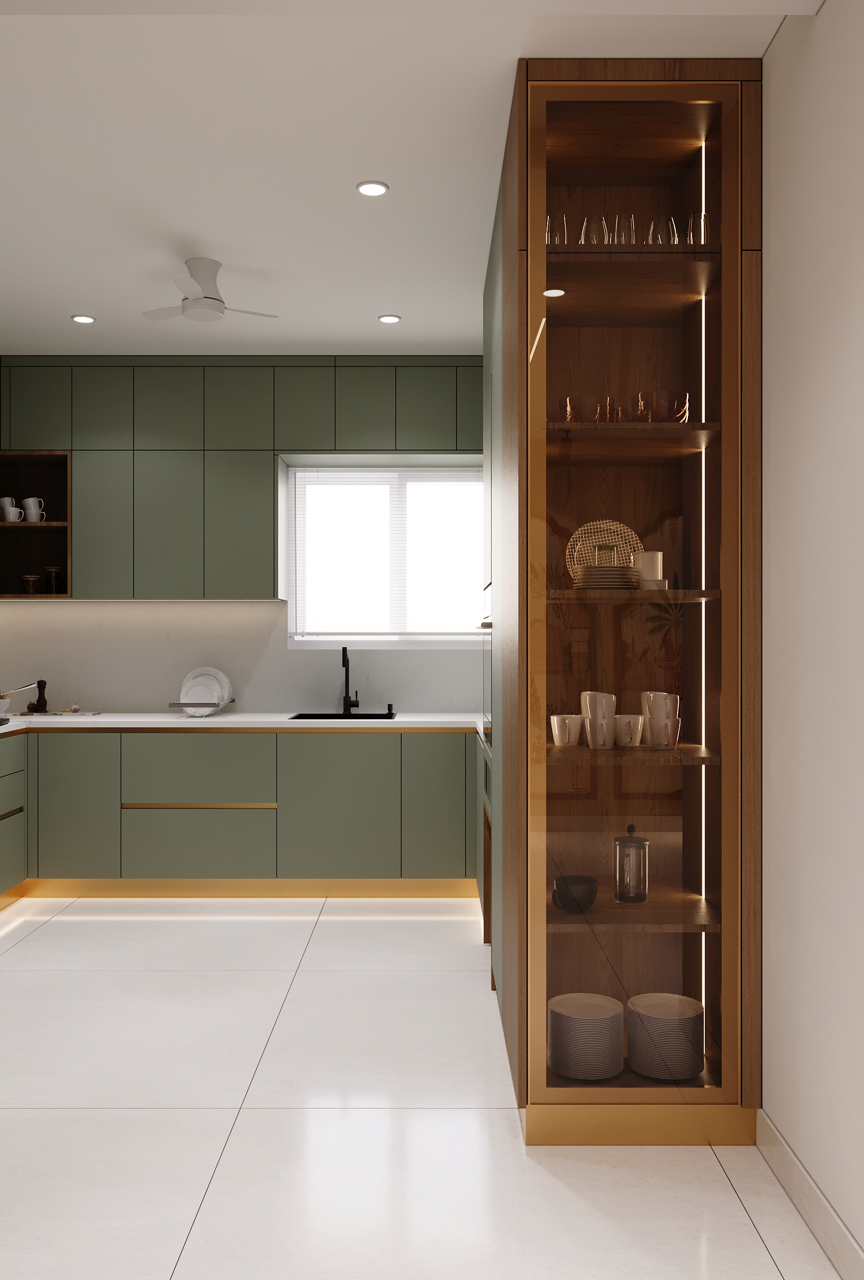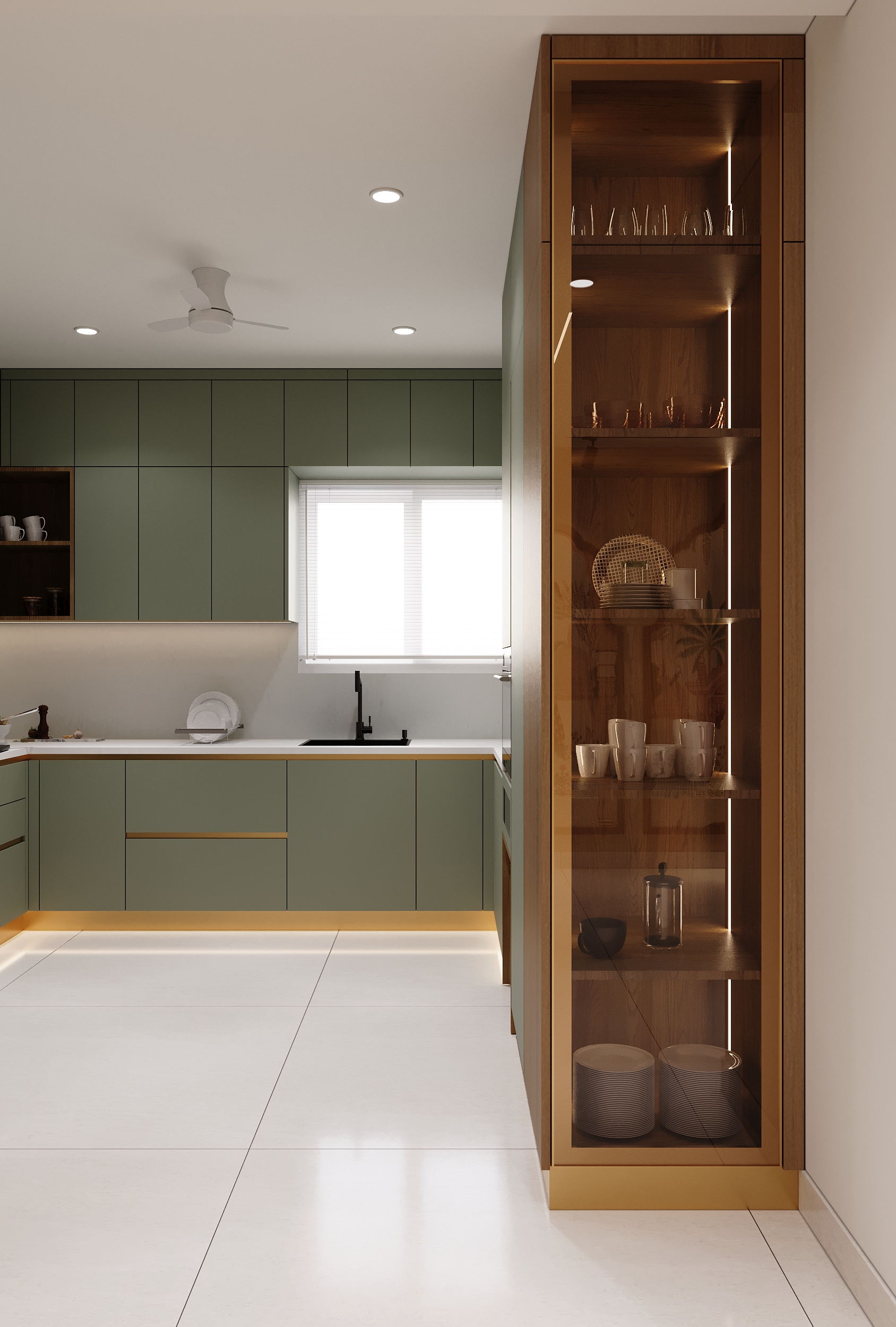 Sage green cabinetry, warm timber accents and gold detailing come together in a kitchen that is as refined as it is functional. Every cabinet, counter and built-in appliance placed with quiet precision — and under-cabinet lighting that transforms the space into something truly elevated.