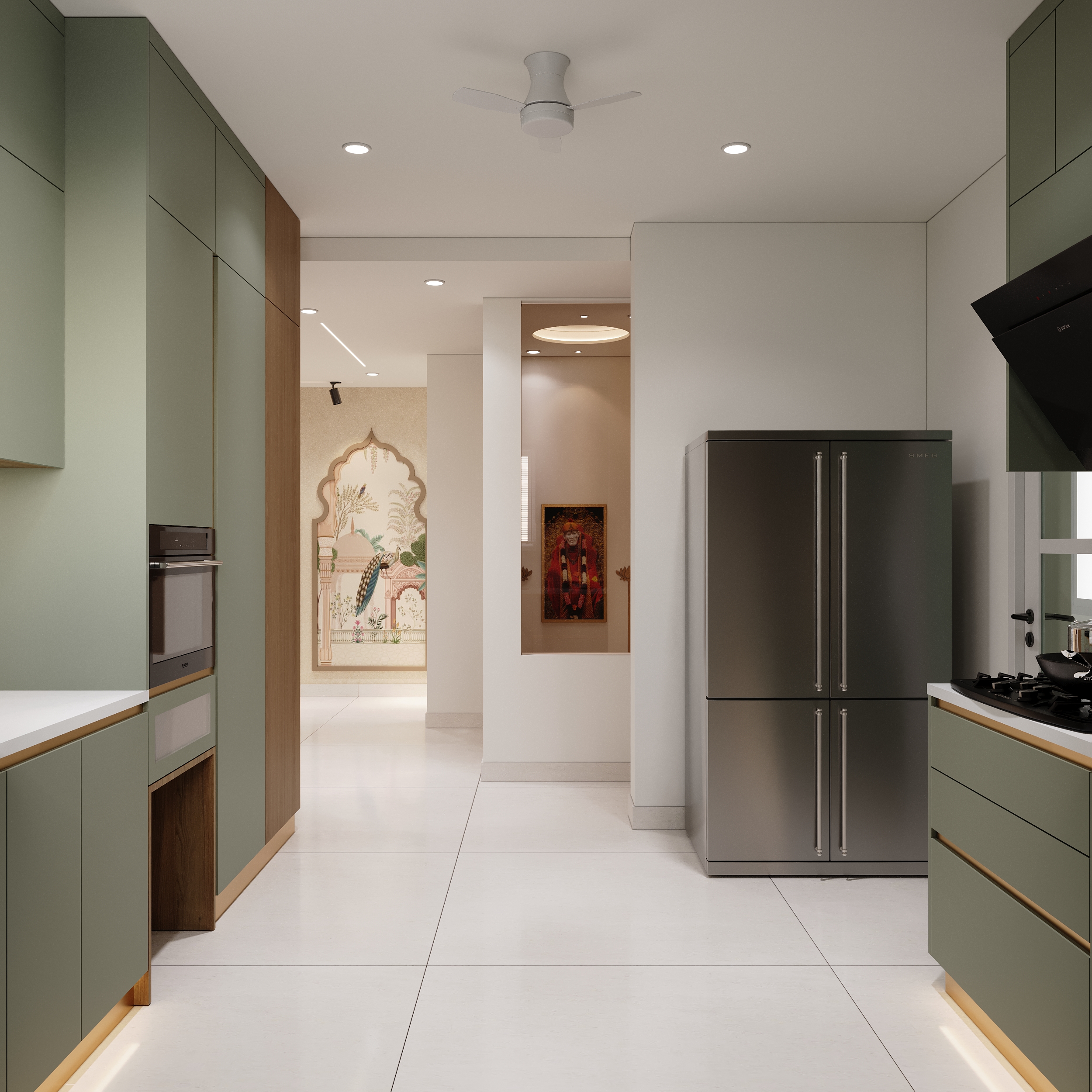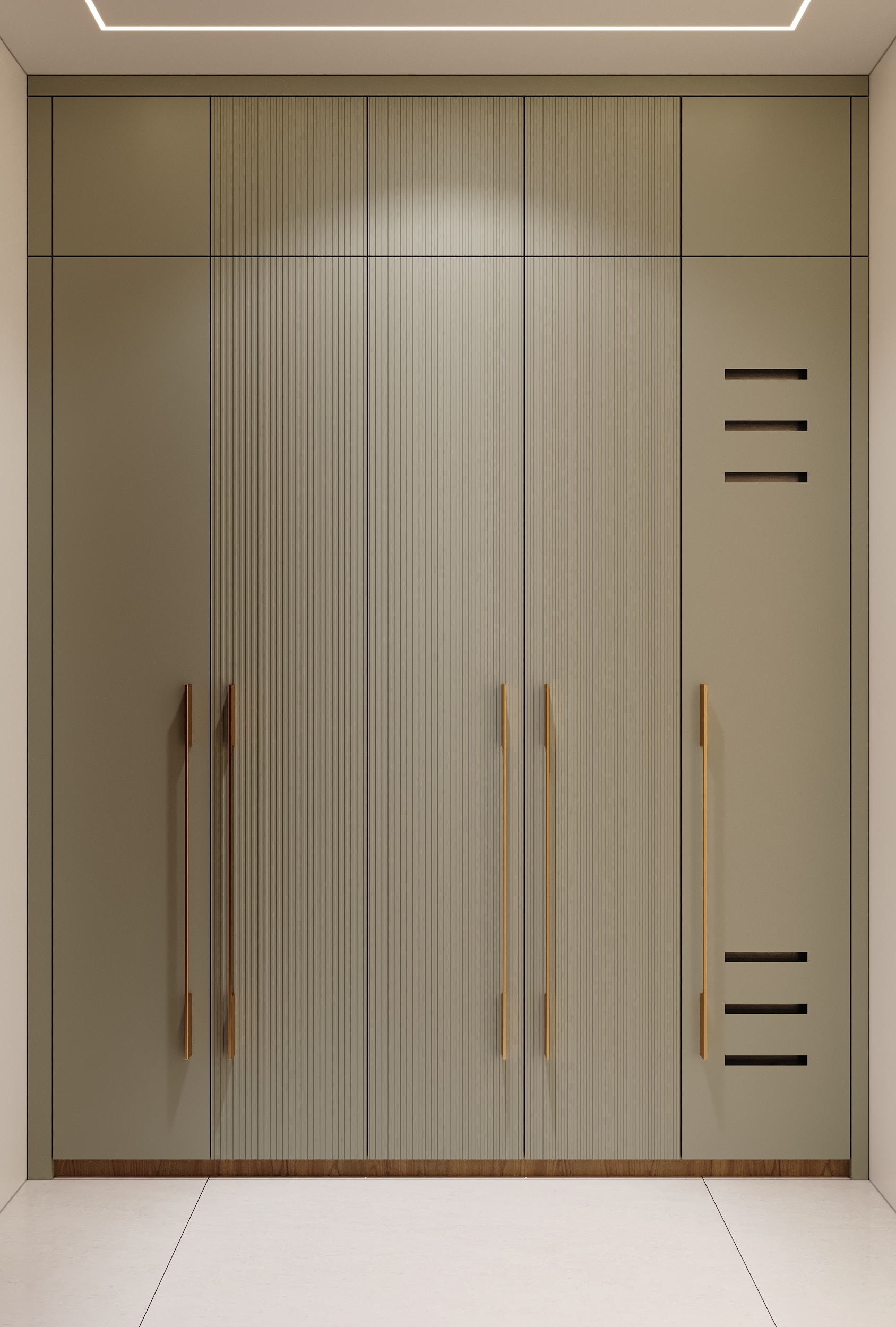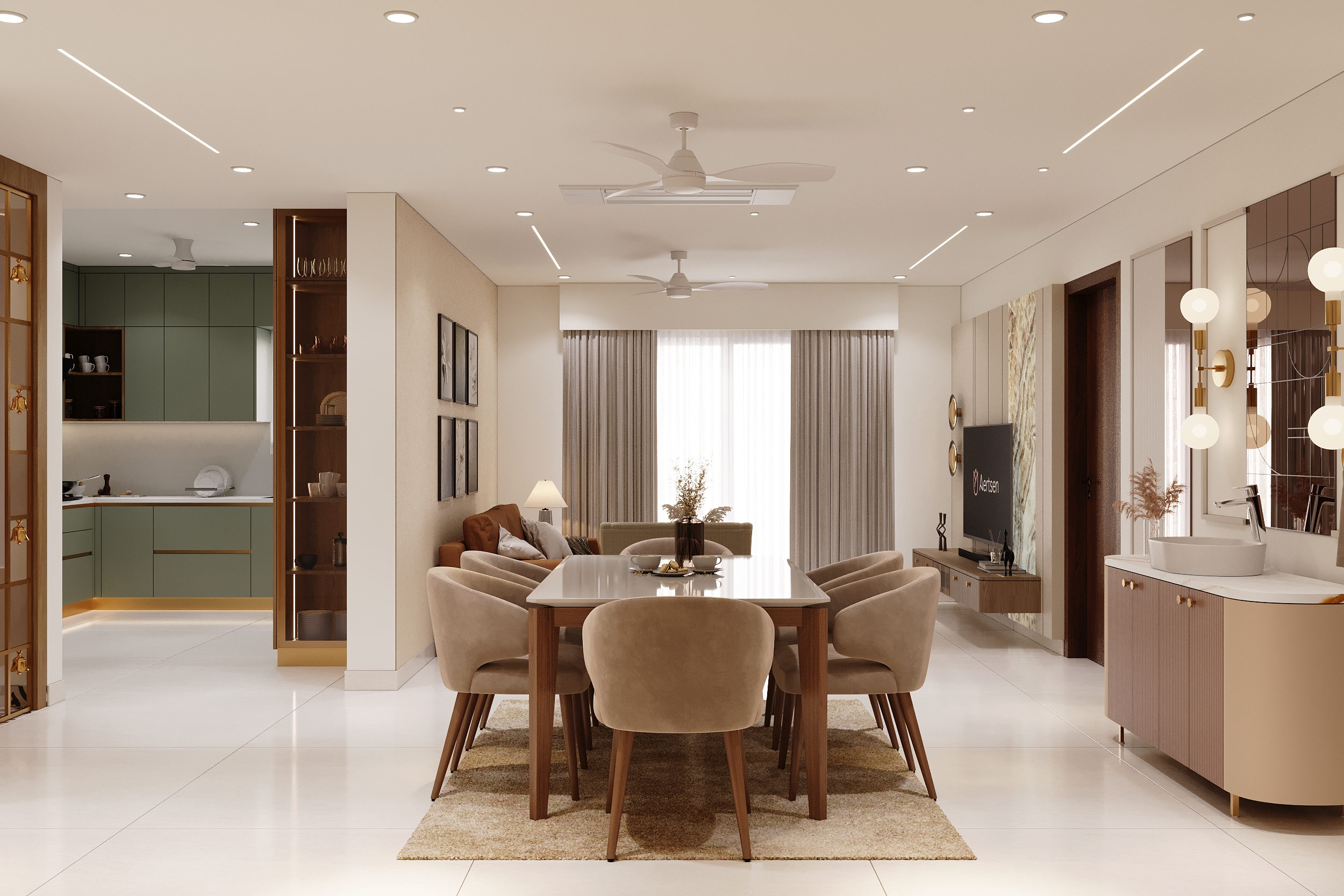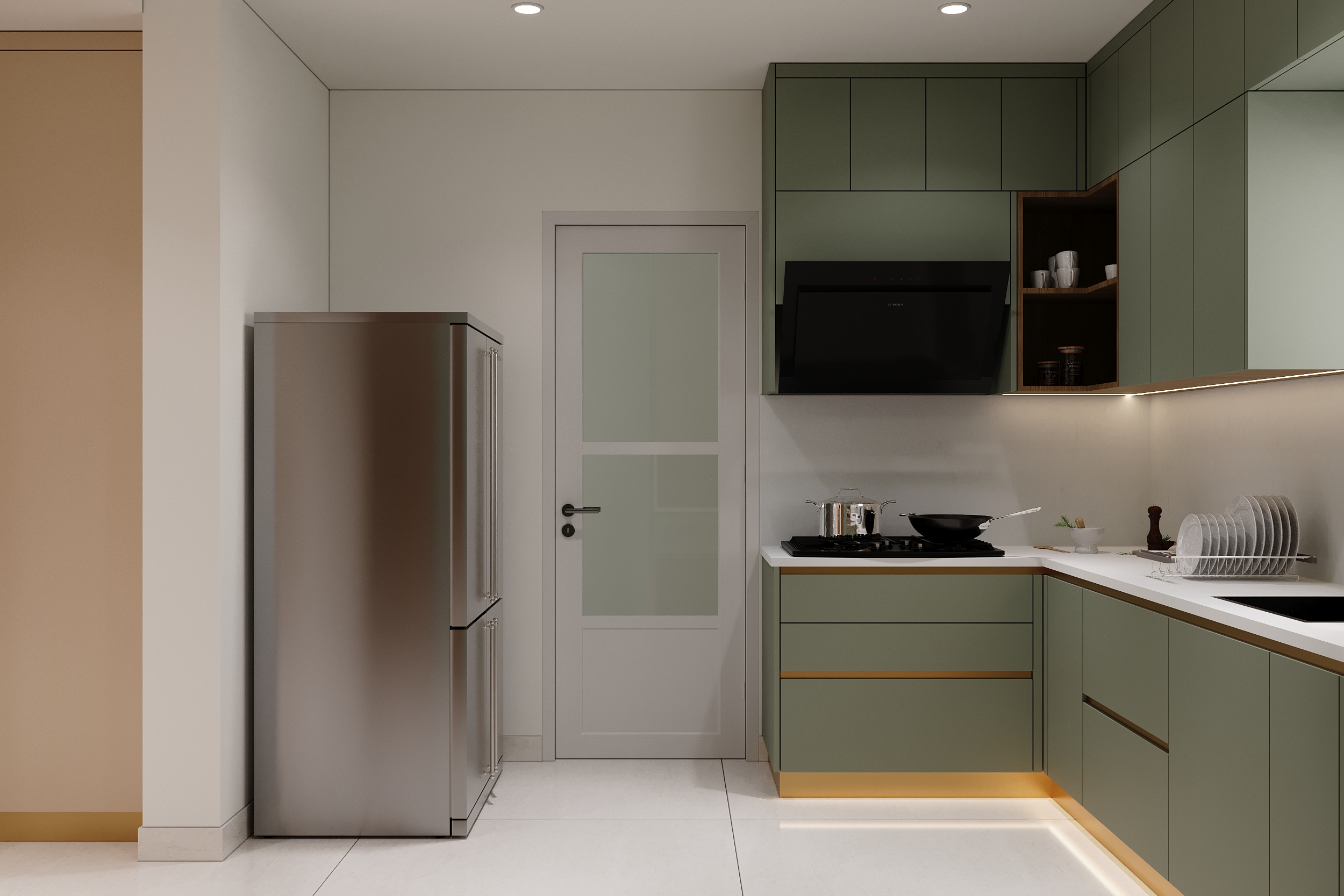 Sage green cabinetry, warm timber accents and gold detailing come together in a kitchen that is as refined as it is functional. Every cabinet, counter and built-in appliance placed with quiet precision — and under-cabinet lighting that transforms the space into something truly elevated.
