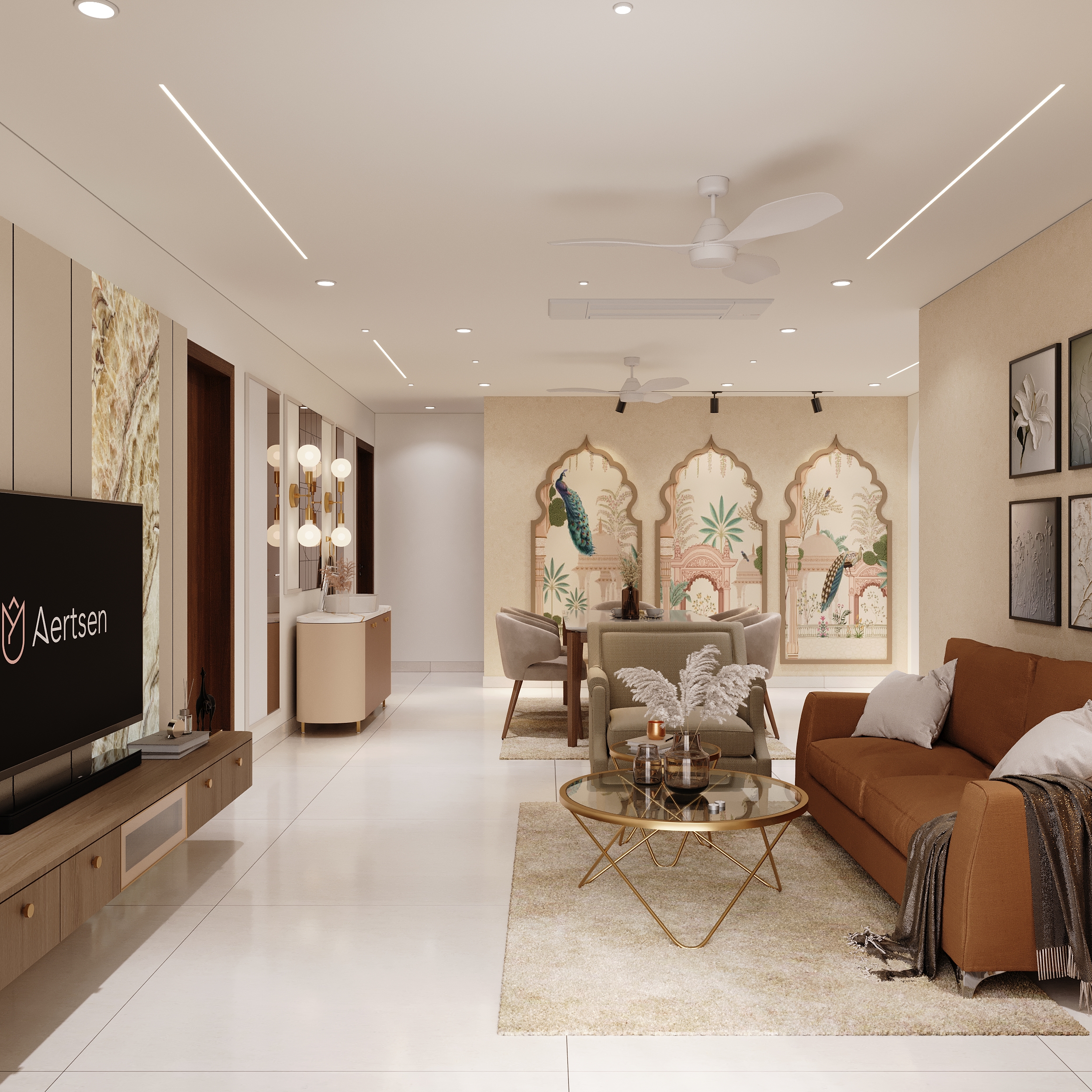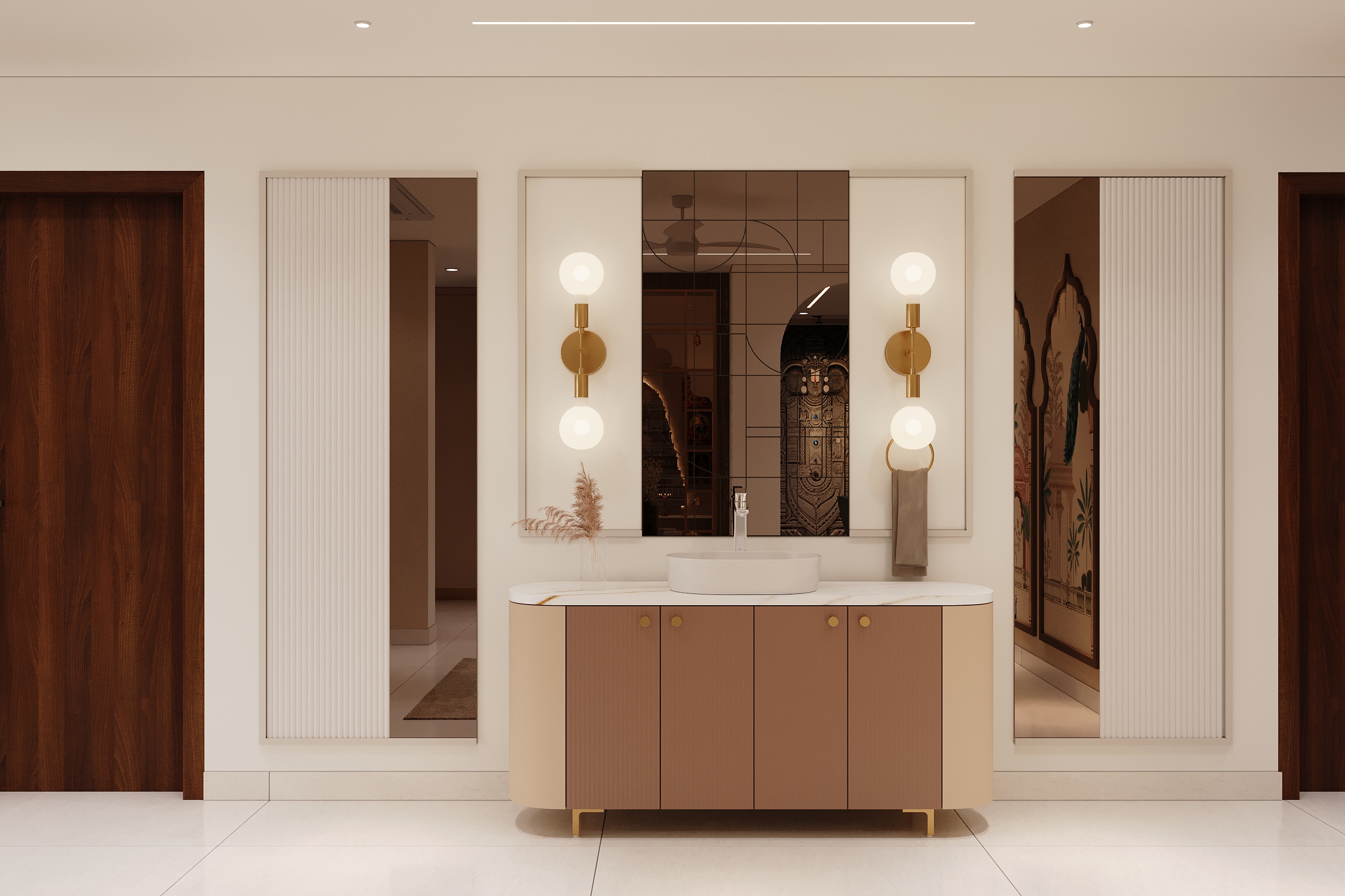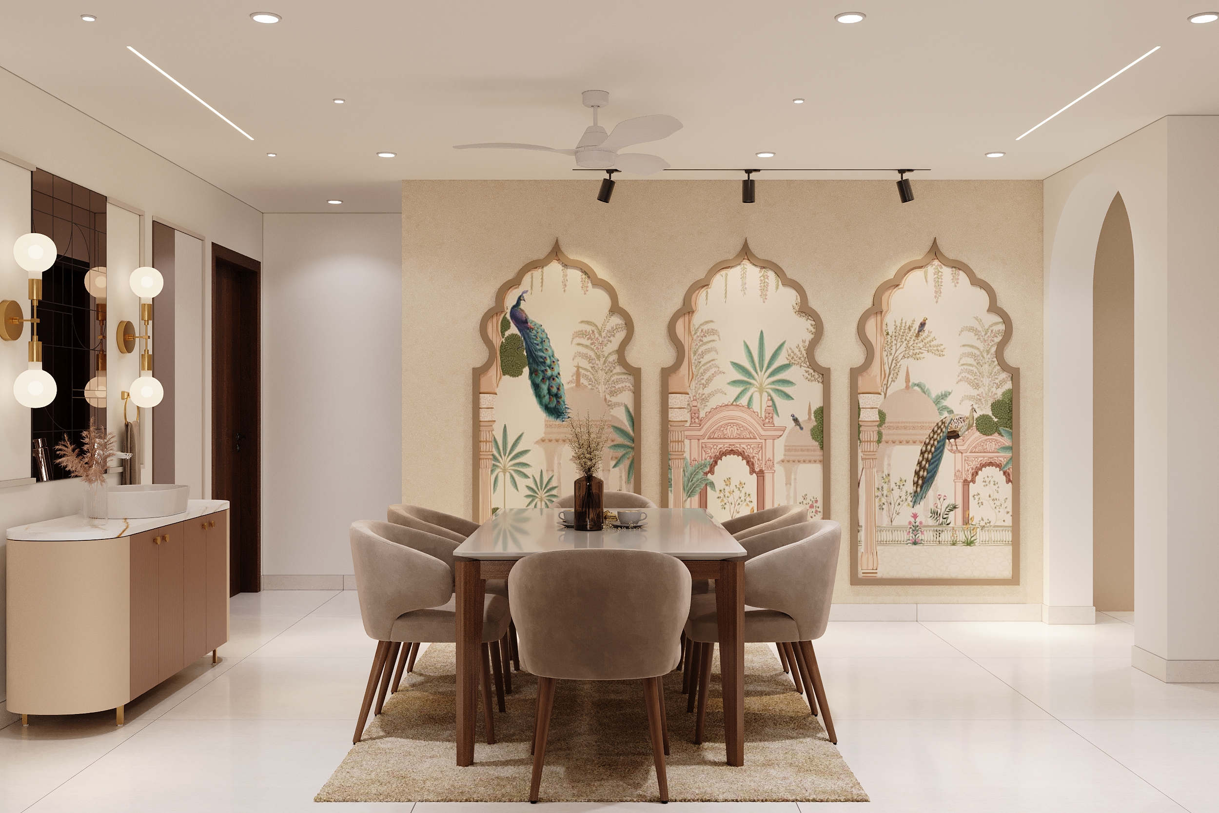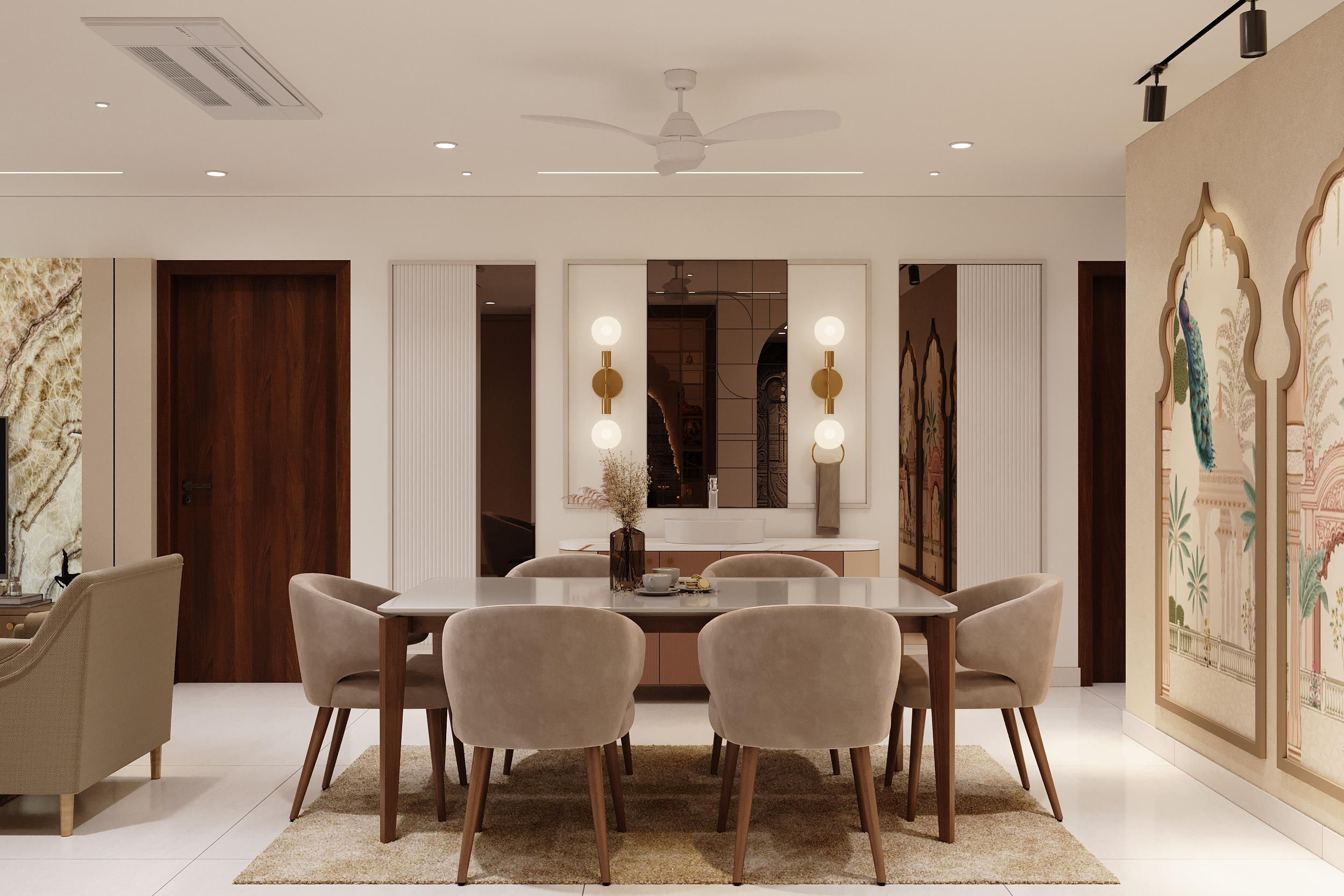 Framed by a magnificent Mughal-inspired peacock mural and anchored by an elegant eight-seater dining ensemble, this space is a seamless confluence of heritage artistry and contemporary refinement. Gold-lit wall sconces and a sculptural vanity console complete a dining experience that transcends the ordinary.