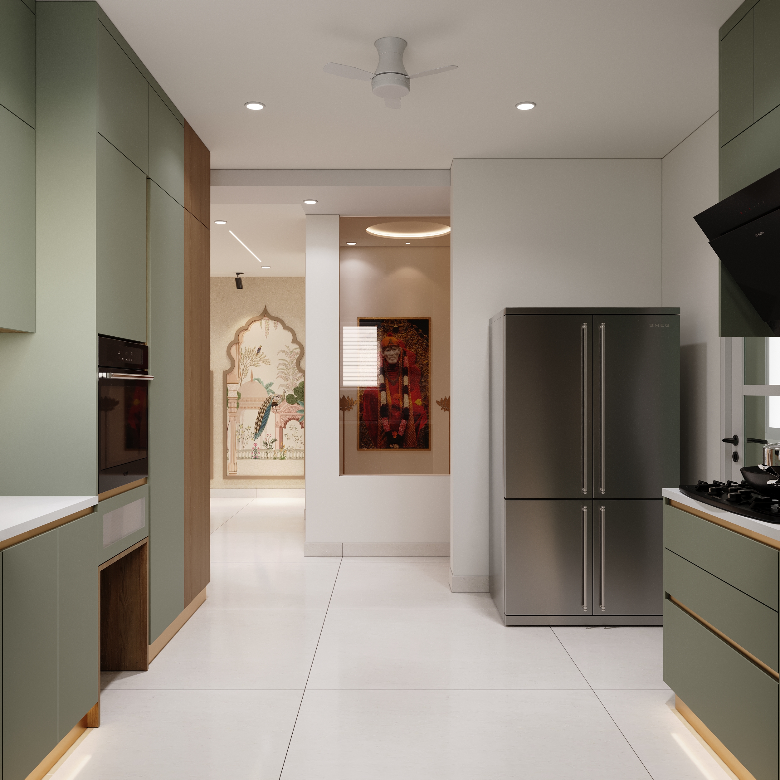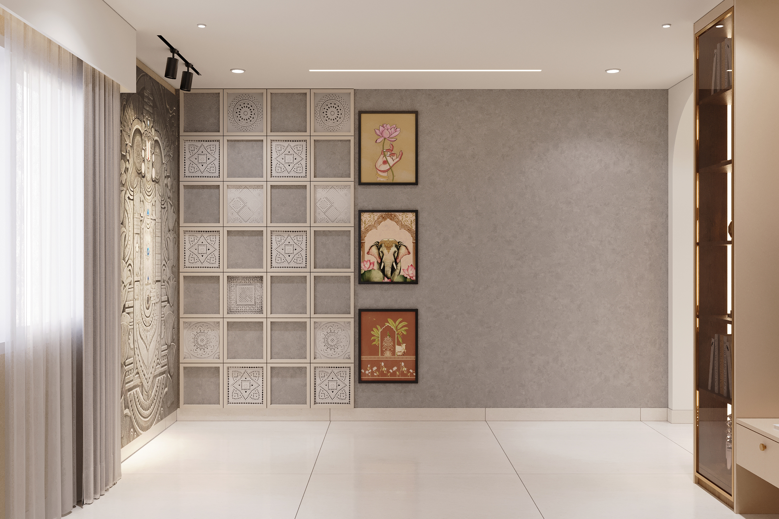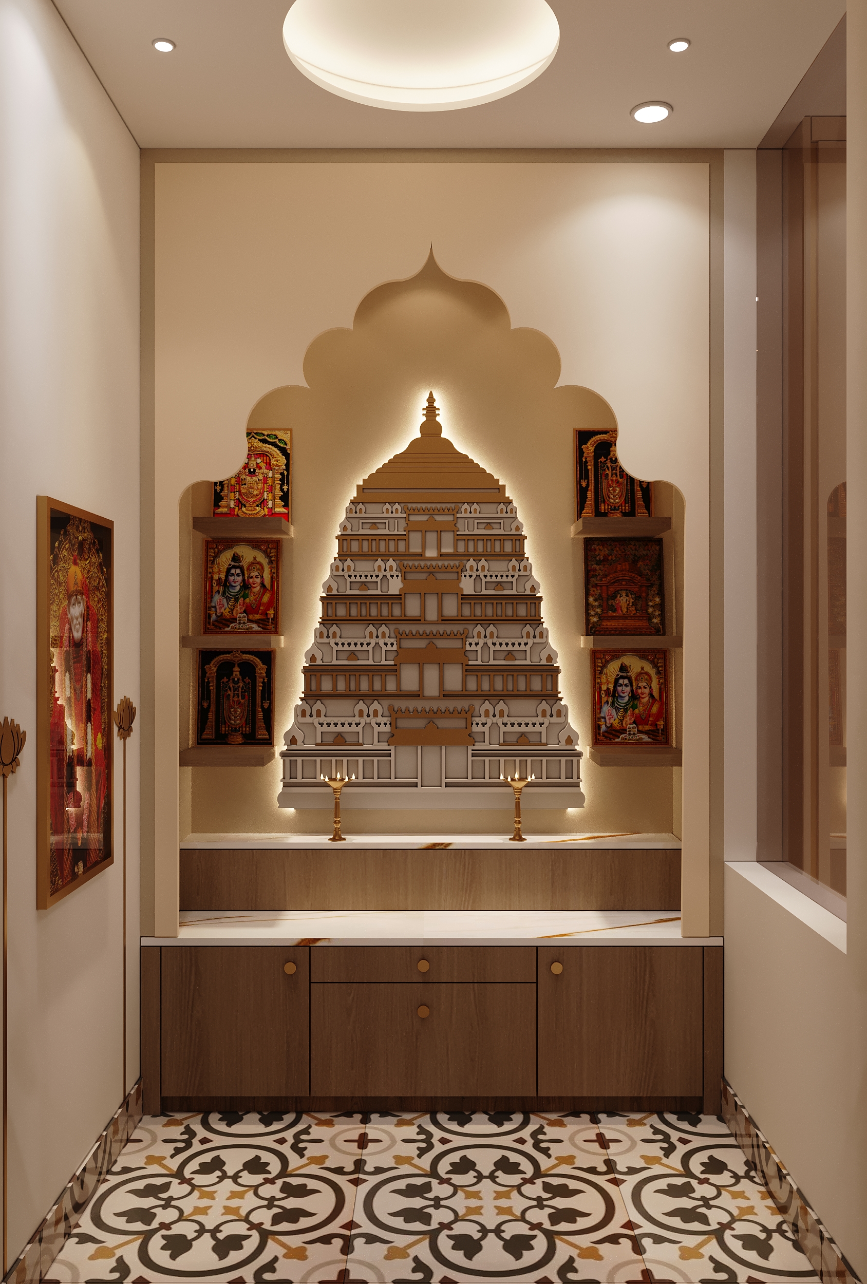 A gold-gridded timber enclosure, a magnificently crafted temple gopuram backdrop with warm backlighting and intricate patterned flooring — a pooja room designed not just to be seen but to be deeply felt. Every element chosen with reverence and executed with the highest level of craftsmanship.