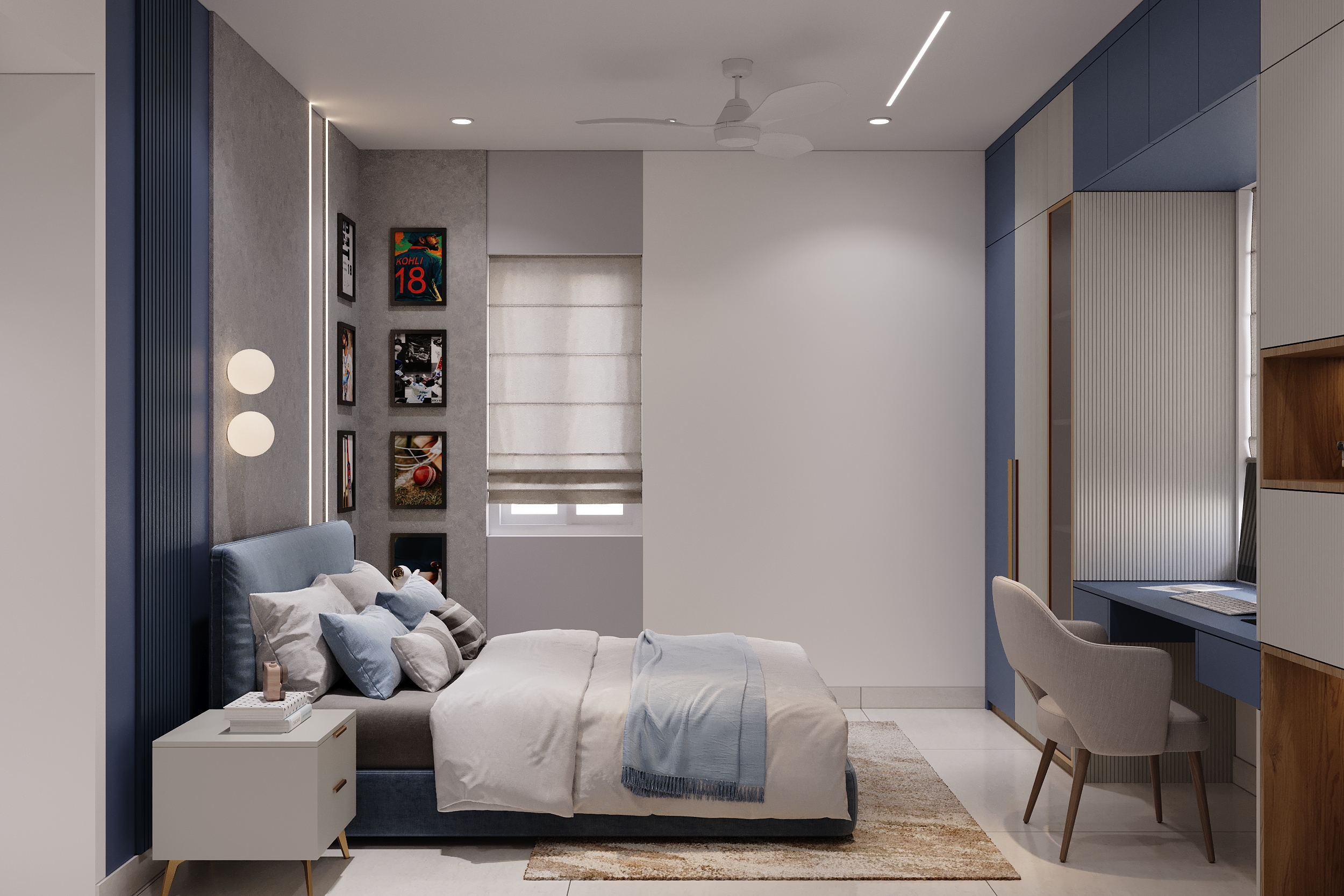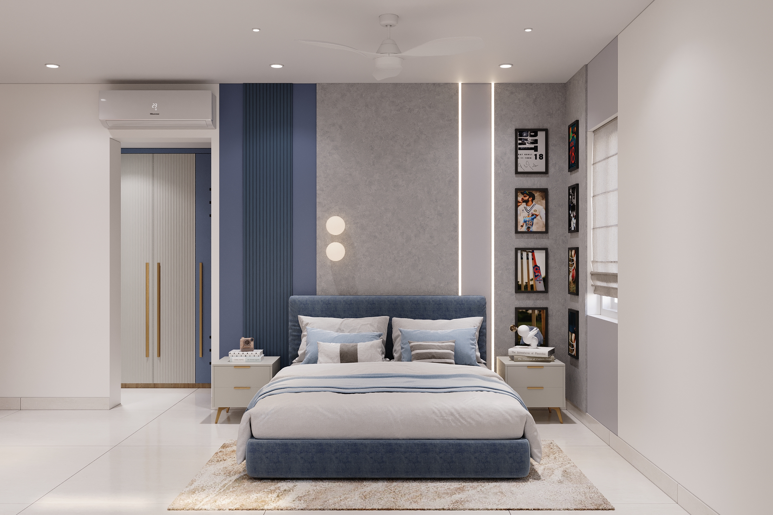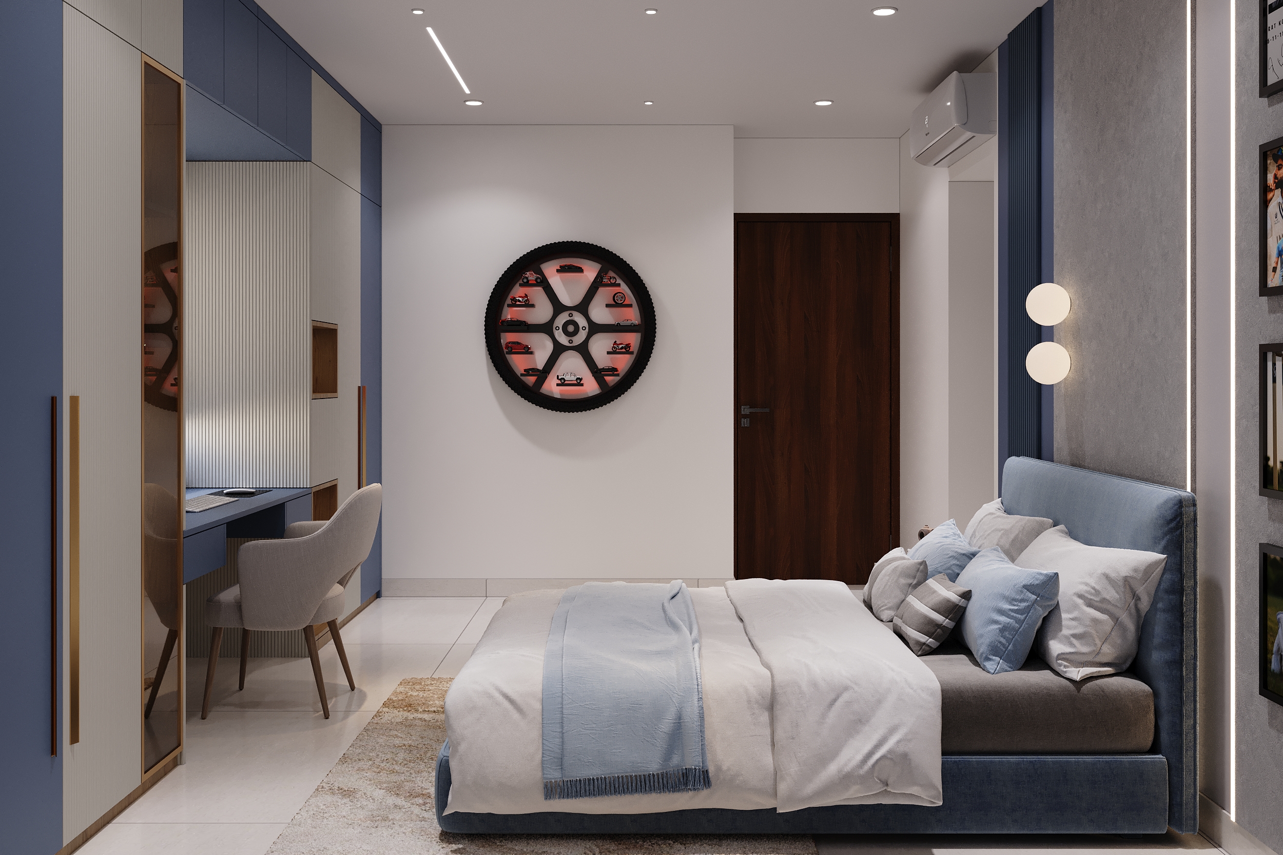 A bold blue cricket-themed space with a statement tyre display shelf and an integrated study wall sits in perfect contrast to the warm ivory and timber guest retreat with quilted upholstery and gold sun art — every space tells its own story and every detail is executed with the same level of craft and intention.