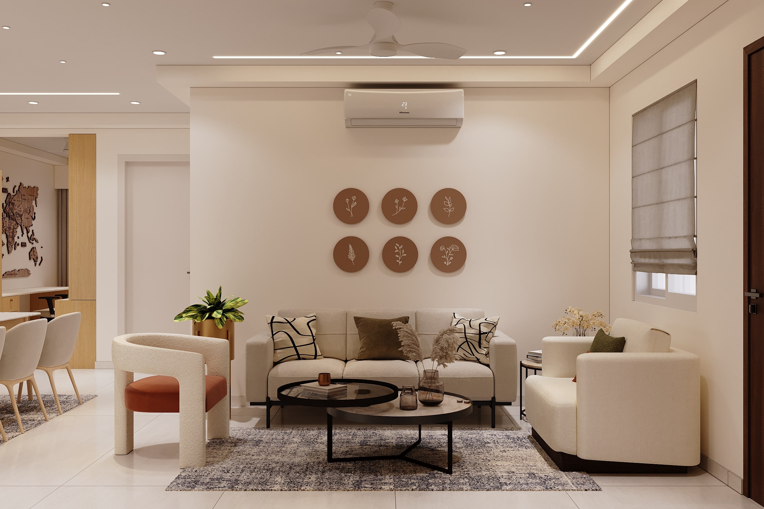 The living and dining spaces unfold as a singular, fluid volume guided by proportion rather than partition. A layered neutral palette and sculptural furnishings create calm with architectural clarity. Pendant luminaires anchor the dining area without interrupting visual continuity.