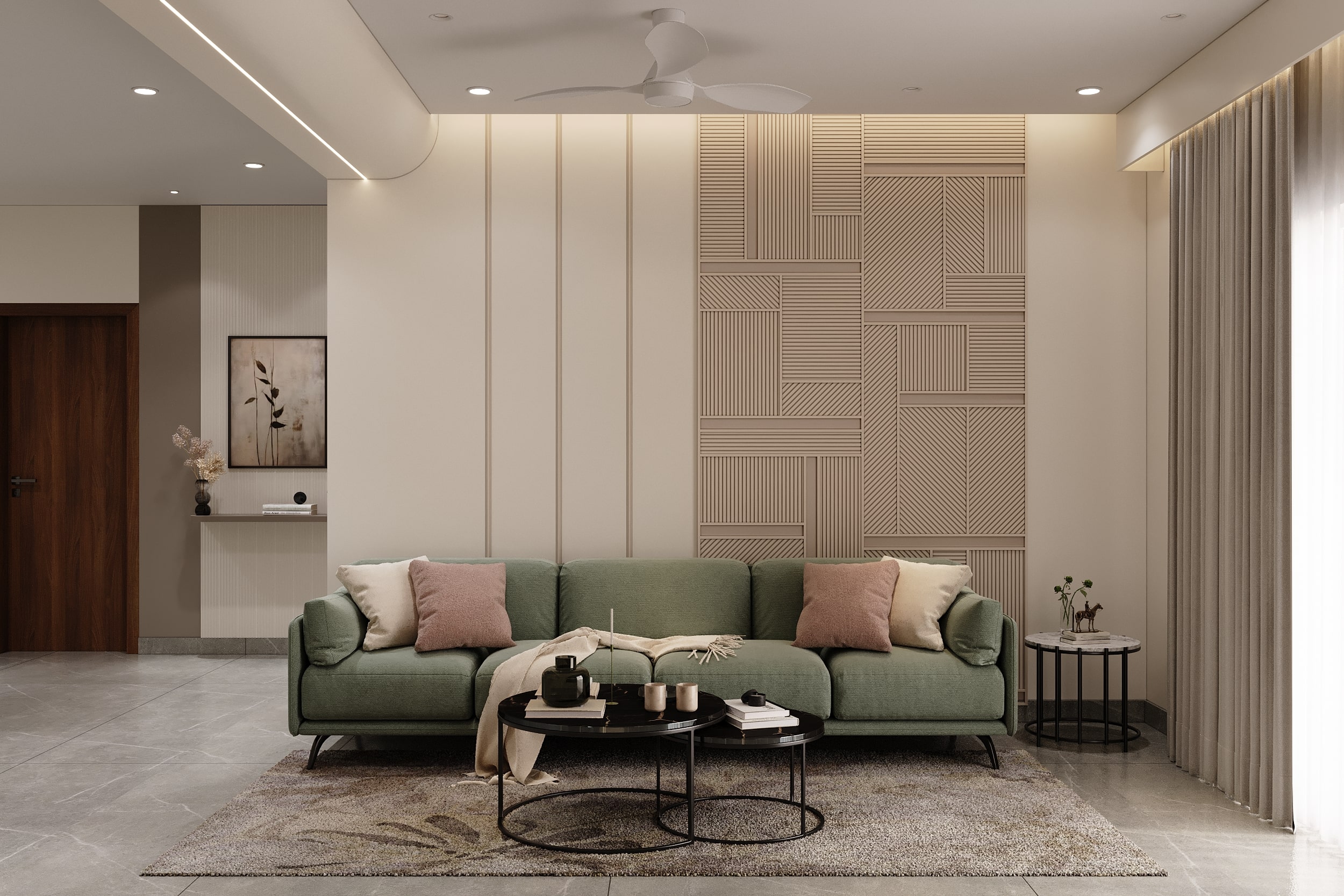 The heart of the home features intentionally distinct yet harmonious zones. The formal living room commands attention with its textural feature wall a blend of smooth panels and a statement geometric wood pattern behind a calming sage green sofa, balanced by a streamlined floating media unit. Transitioning to the family area, the ambiance softens with a subtle, artistic wall mural and the addition of plush, terracotta-toned seating, proving that contrast in texture and saturation can enrich, rather than disrupt, a unified space.