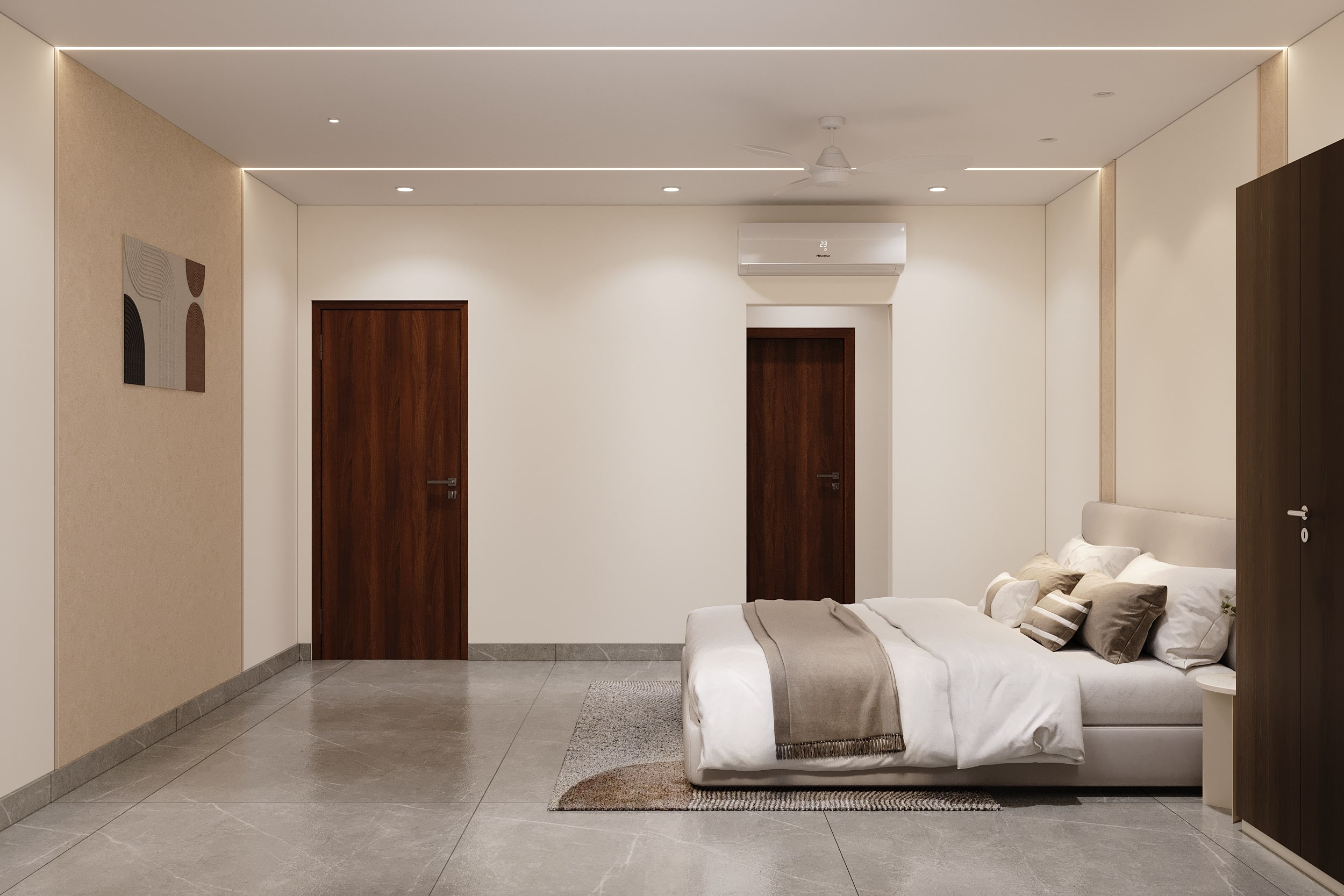 The Master Bedroom is a serene retreat with a muted modern palette of creamy neutrals and soft taupe. A plush bed sits against a subtle headboard wall with vertical panels and warm cove lighting that adds depth and calmness. A walk-in wardrobe with tall, light-toned cabinets ensures ample storage while maintaining a clean aesthetic, while a sandy textured feature wall with abstract art brings a touch of understated luxury.