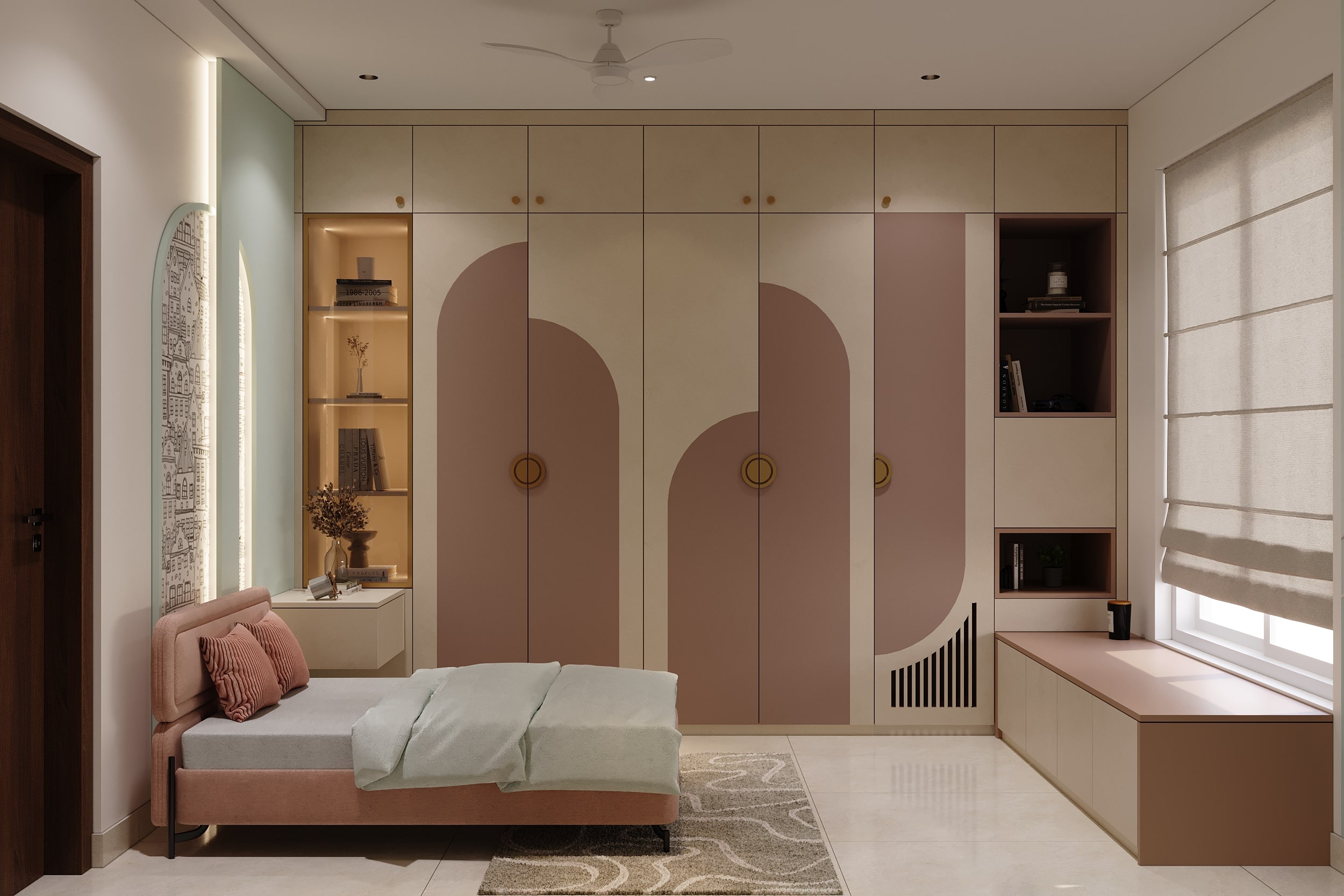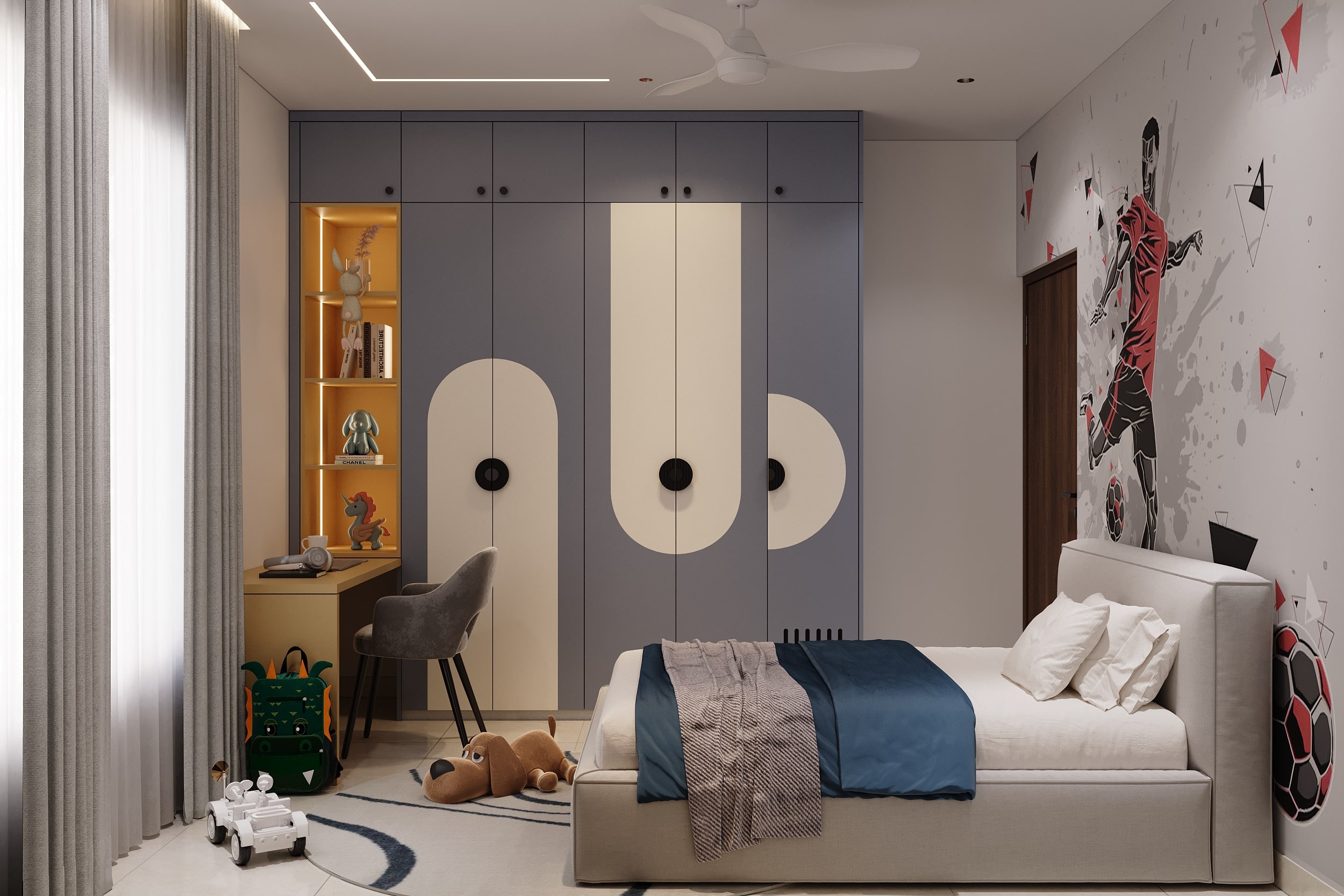 The children’s rooms express two distinct design moods—one soft and whimsical, the other bold and energetic. The pastel room uses blush tones, curved forms, and gentle lighting, while the sport-themed room features graphic wall art and structured wardrobes. Both spaces balance function with visual clarity, ensuring comfort without clutter. Together, they reflect a thoughtful understanding of personality and age-specific needs.