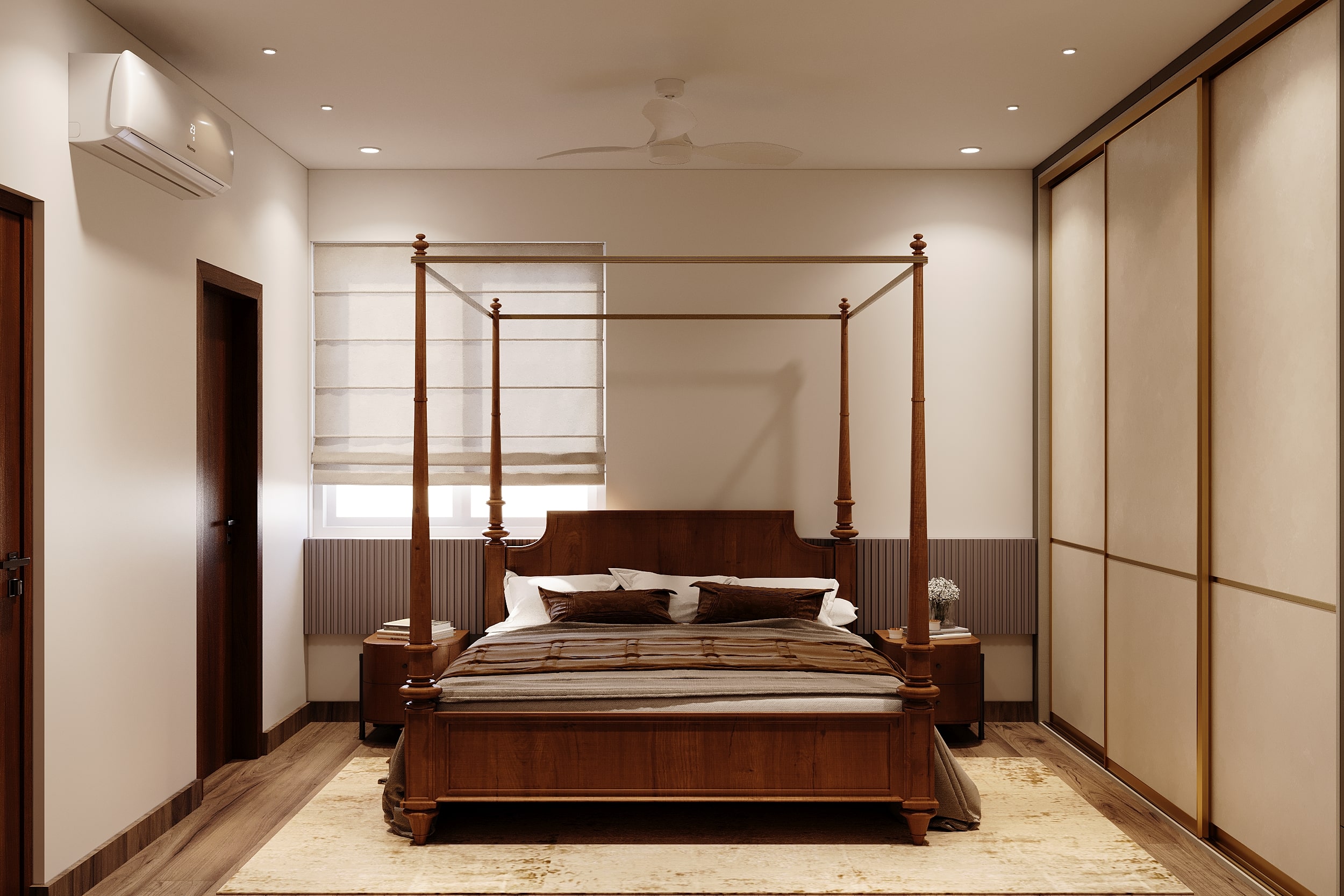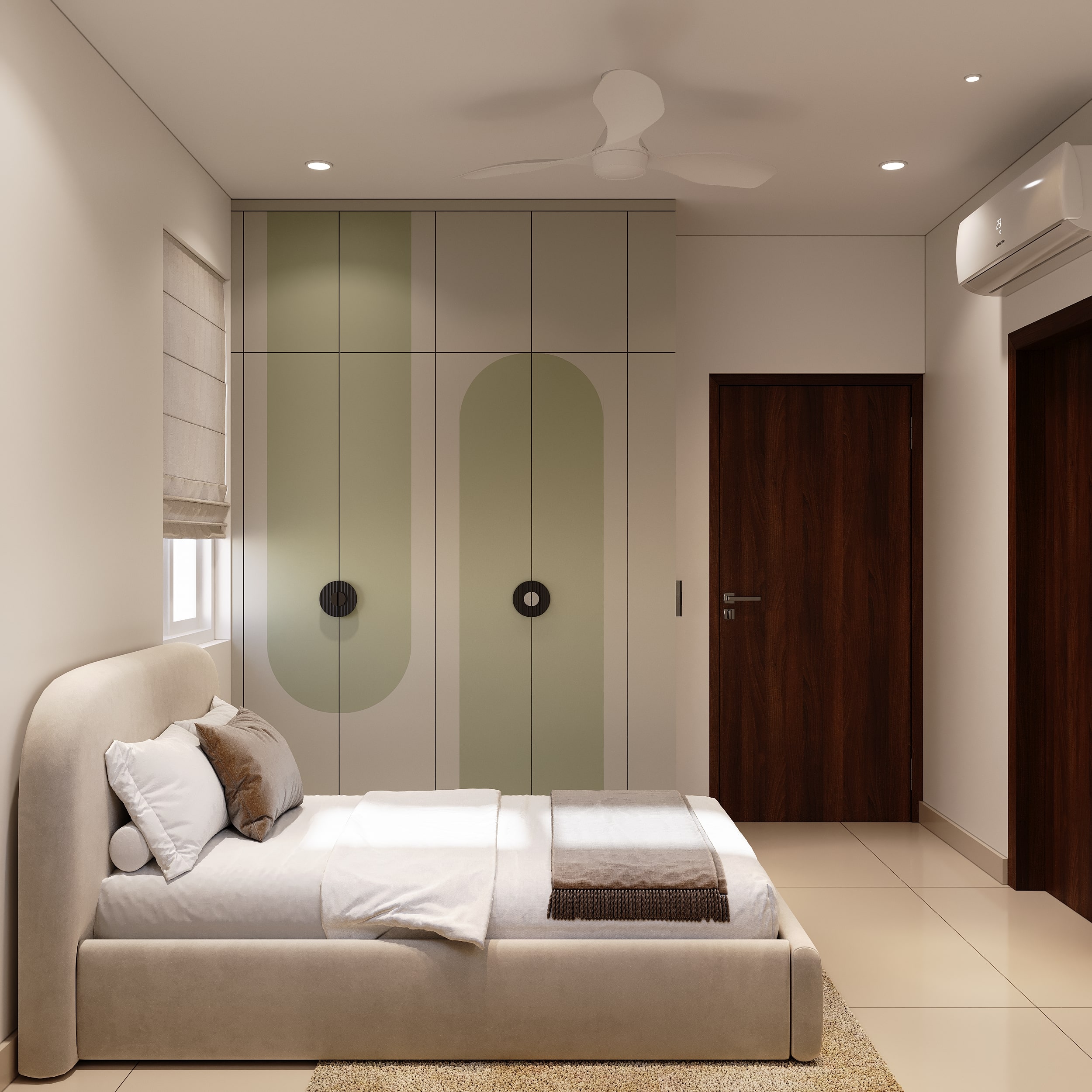 The master bedroom adopts a calm, sophisticated palette with earthy tones and gentle textural layers. A fluted headboard paired with botanical artwork becomes the visual anchor, adding quiet character to the space. Vertical wardrobe panels enhance height while maintaining a sleek, minimal rhythm. Overall, the room feels composed, elegant, and thoughtfully edited for everyday comfort.