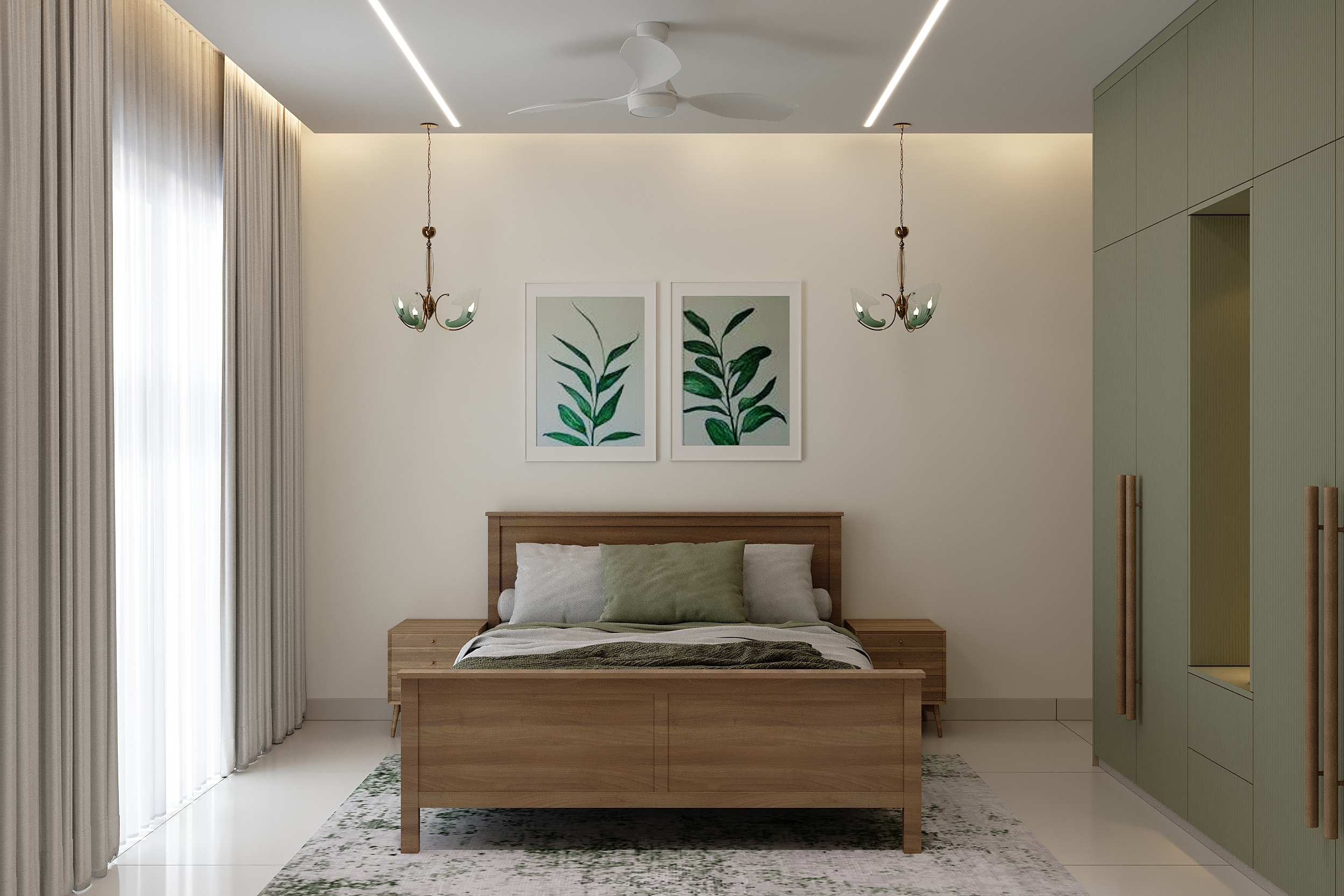 The beautiful residence features diverse private sanctuaries, each prioritizing comfort and style. One serene space centres on the signature sage green palette, featuring a vertical ribbed wardrobe with a mirrored niche, a light wood bed, and emerald glass pendant lights. A second cozy retreat offers a warmer, more traditional feel with a solid wood bed, classic lamps, and light, textured wardrobes.