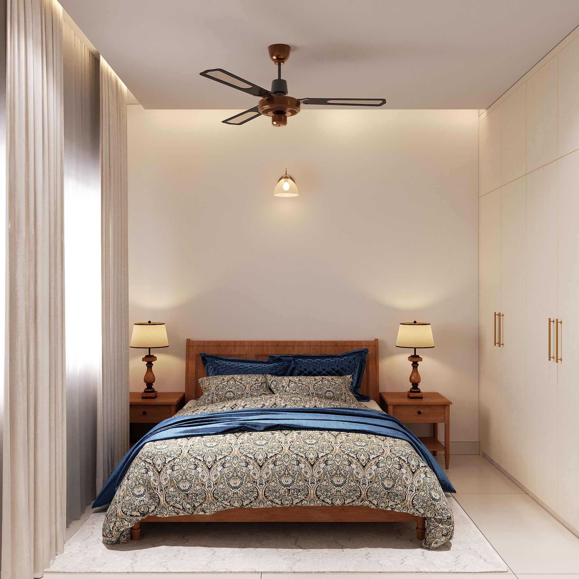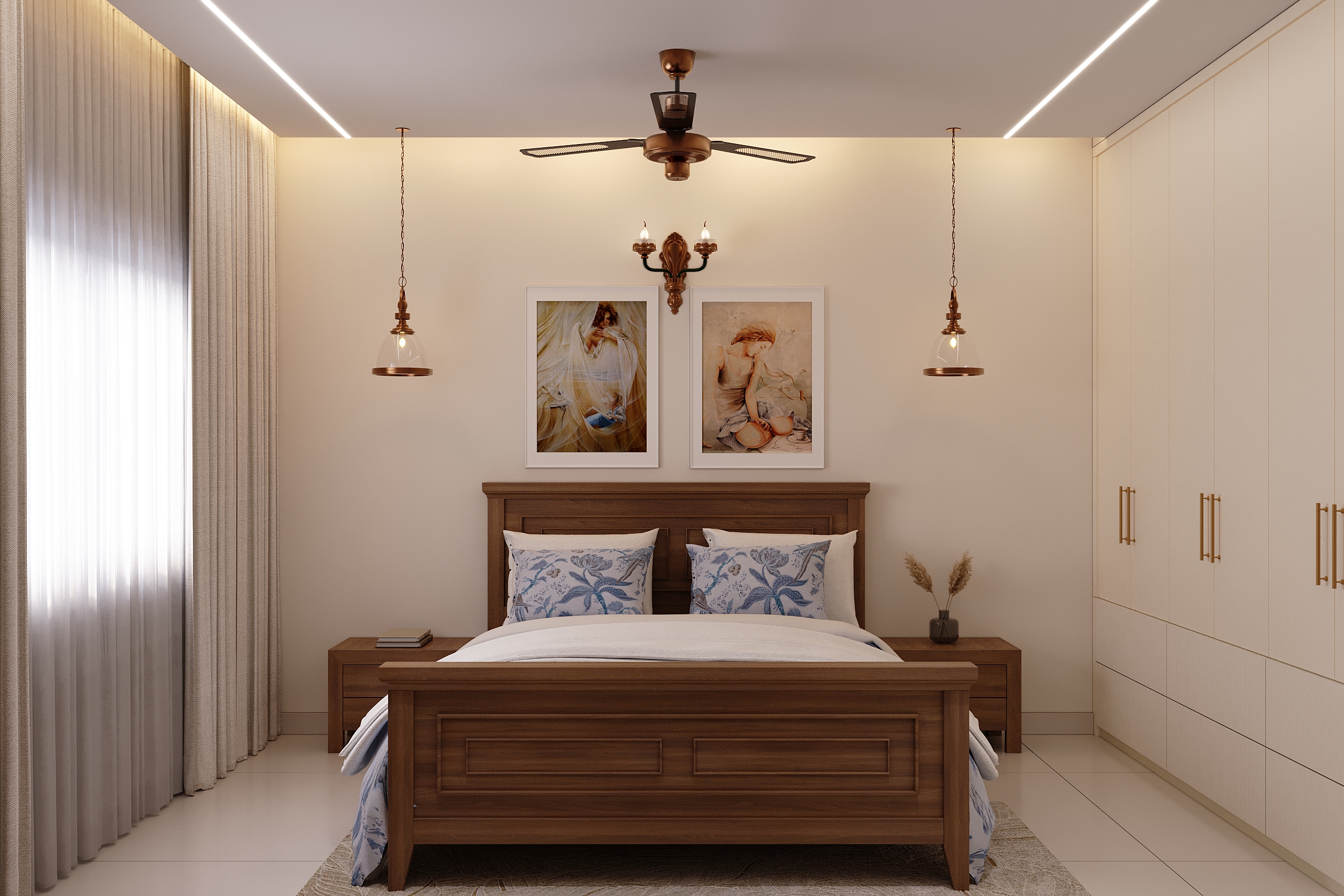 The third private retreat exudes timeless elegance, distinguished by a robust dark wood bed frame and bedside tables. Lighting here is intentionally luxurious, with copper-toned pendant lights and a unique bedside chandelier. Full-height ivory wardrobes with ribbed detailing and gold handles complete this space, maintaining a perfect balance of sophistication and comfort across all sanctuaries.