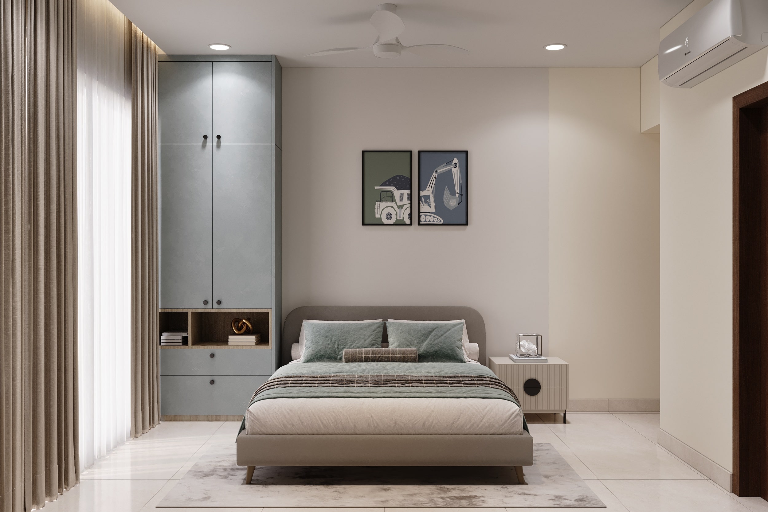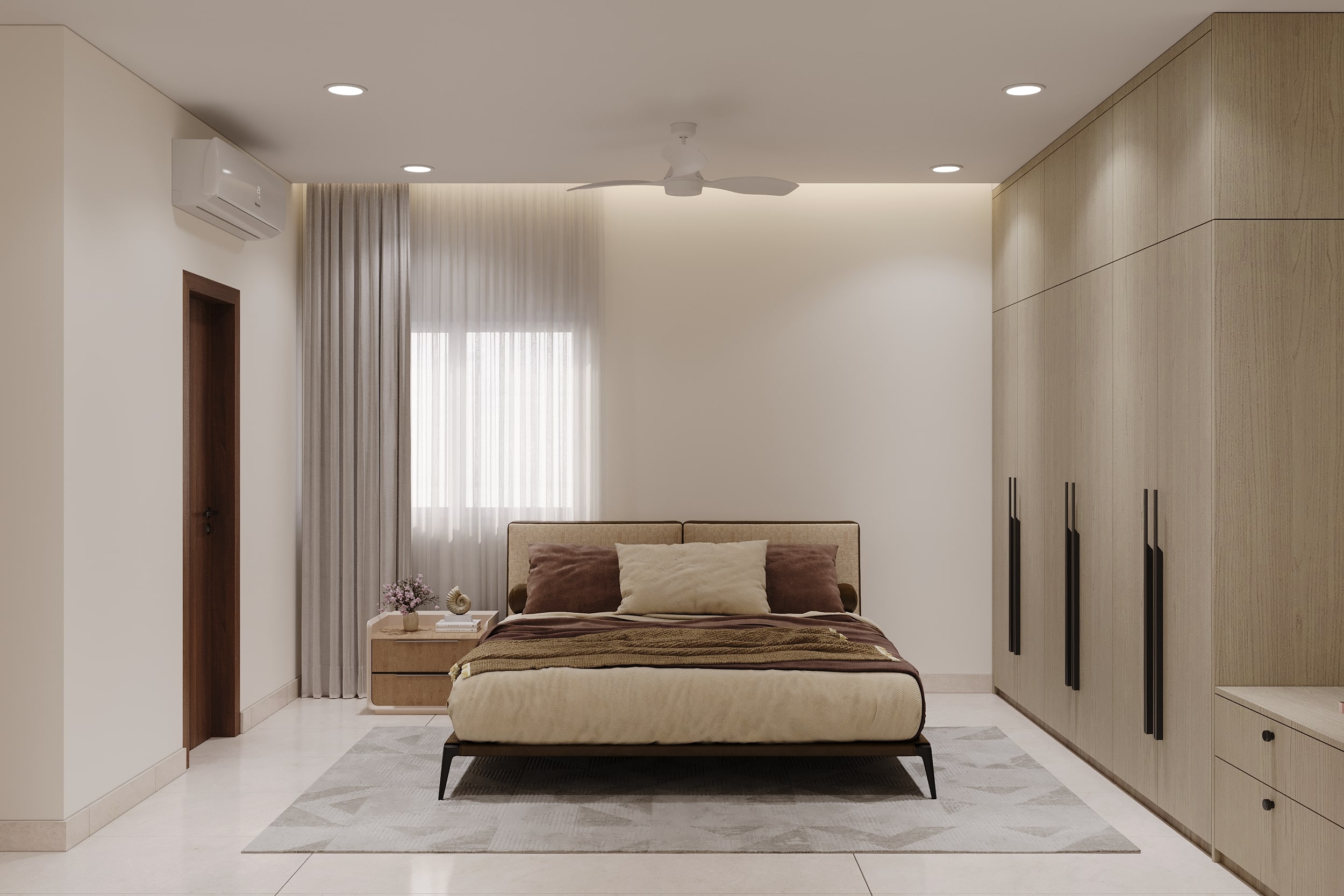 The bedrooms are designed as serene retreats, where muted palettes, textured finishes, and layered lighting create an atmosphere of calm luxury. Every element — from the upholstered beds to the sleek wardrobes — is curated to balance functionality with timeless aesthetics.